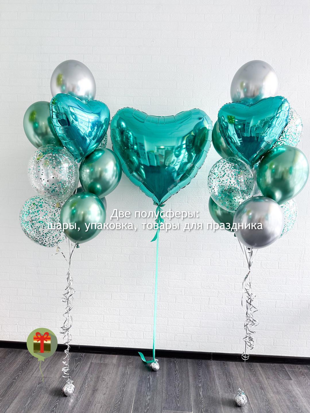 Большой и красивый набор в бирюзовых оттенках для девушек! В составе: 2 фонтана по 10 шт ( 6 шаров хром, 3 конфетти, 1 шар из фольги 45 см), большое фольгированное сердце 60 см. Грузики и пакеты включены в стоимость.