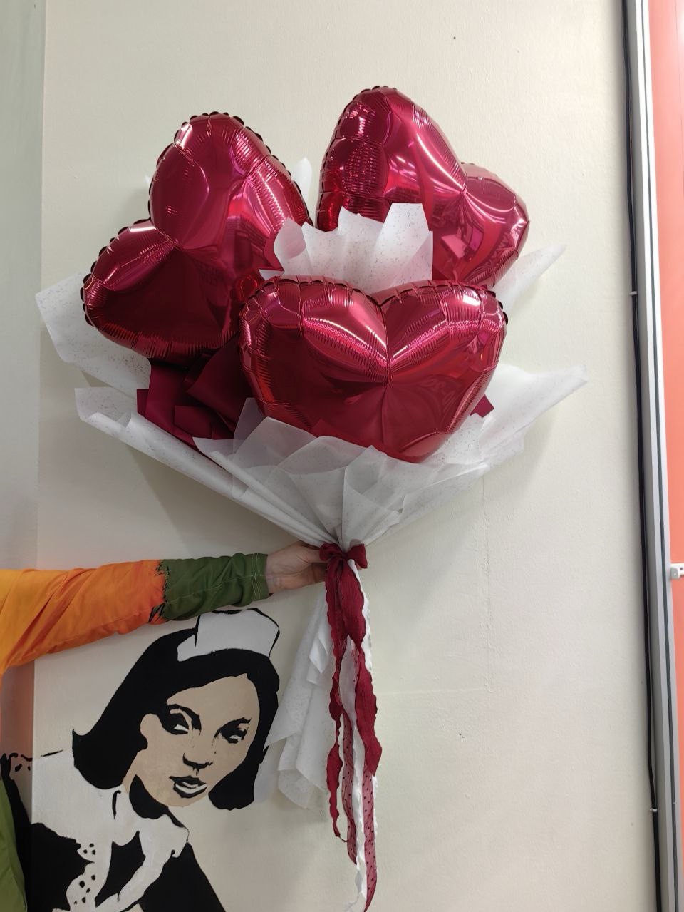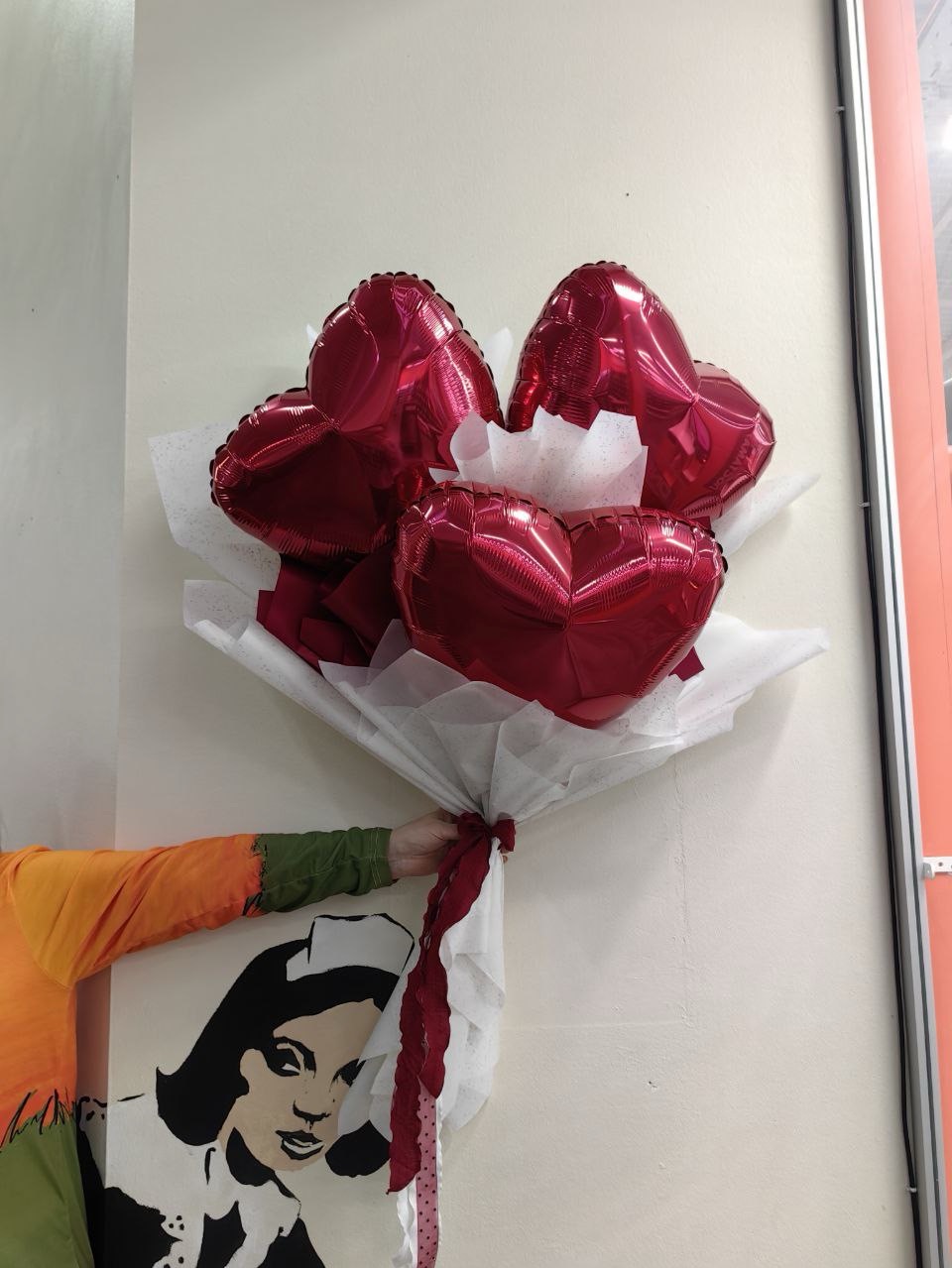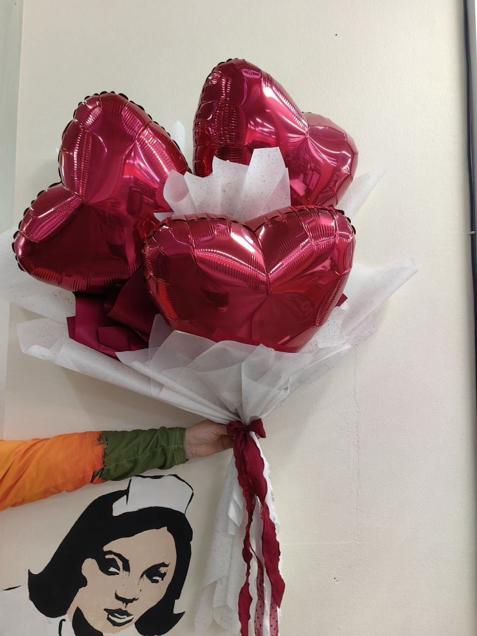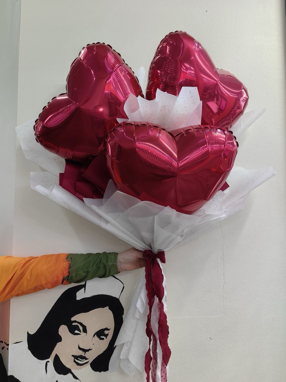 В основе букета 3 сердца 45 см, за счет чего букет выглядит объемным и впечатляющим