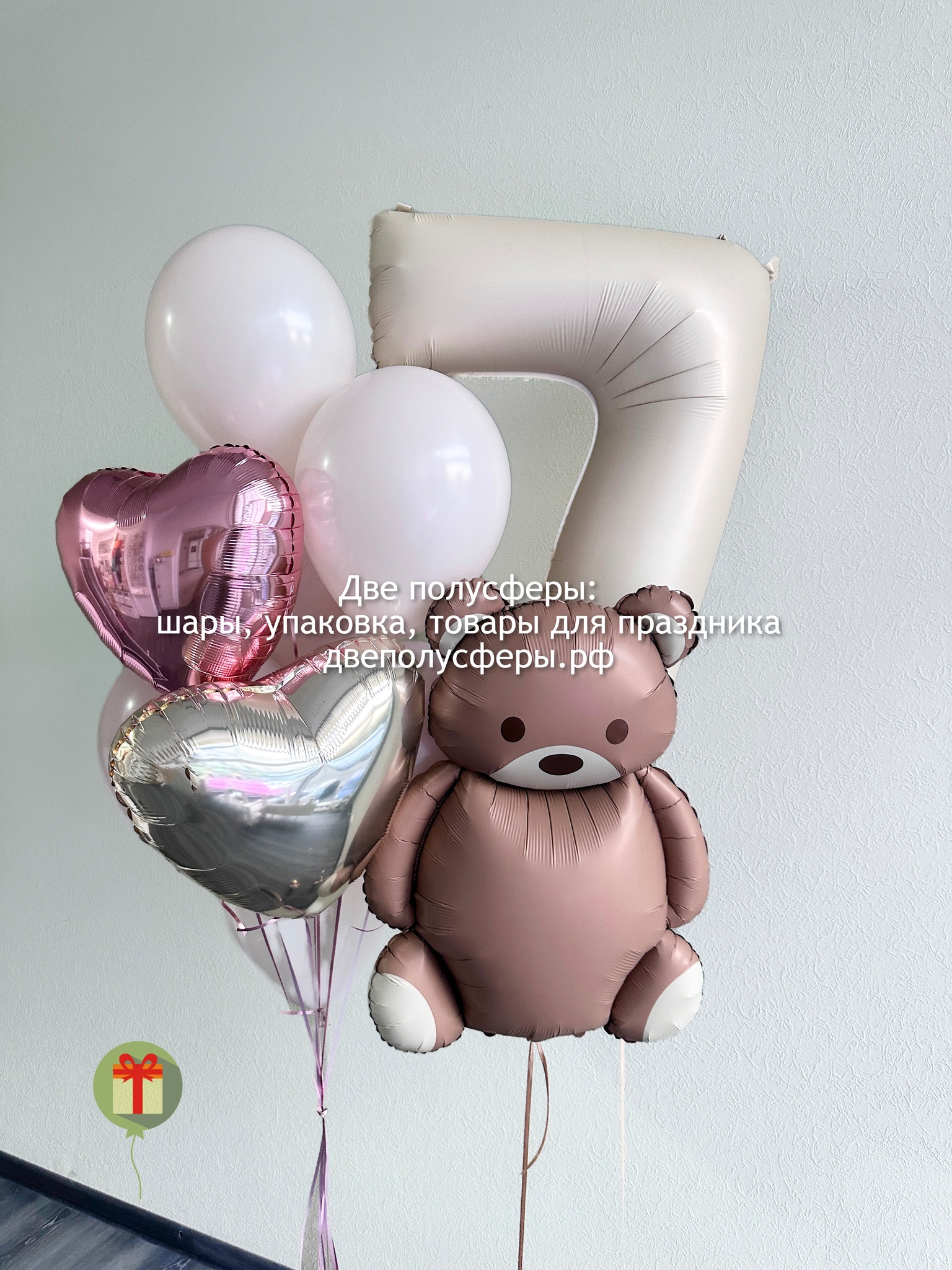 Милый набор с фольгированным мишкой, фольгированной цифрой и фонтаном из 7 штук, 2 сердца 45 см и 5 шаров пастель, грузик и пакет входят в стоимость.