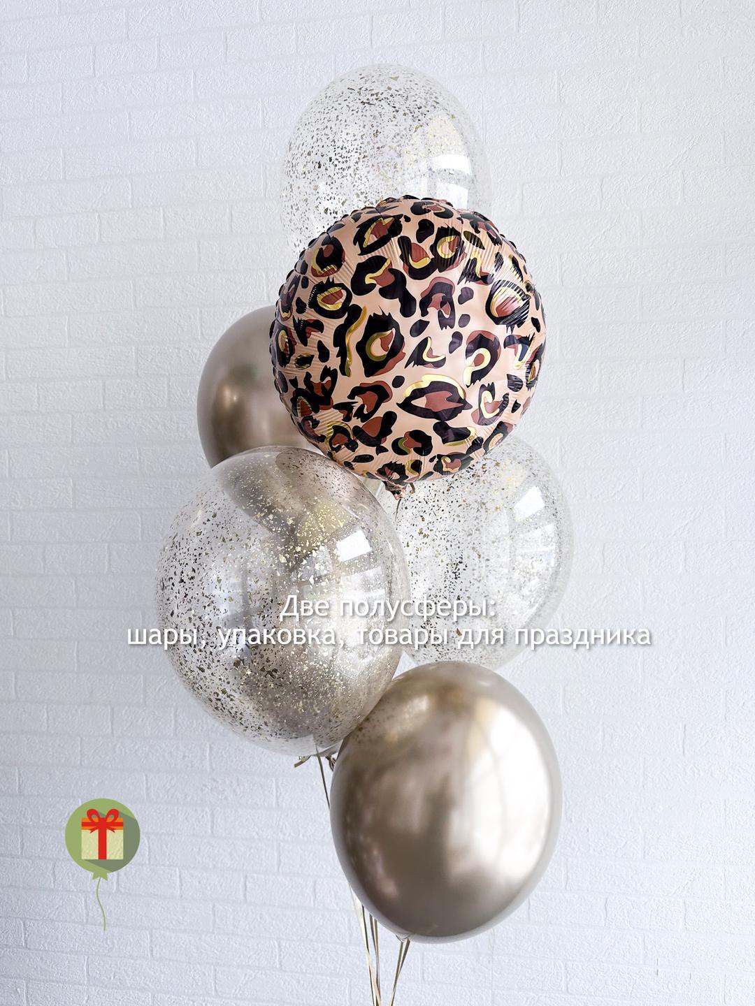Стильный фонтан из 7 шаров. В составе: 3 шара с конфетти, 3 шара хром и фольгированный шар сафари 45 см. Грузик и пакет включены в стоимость.