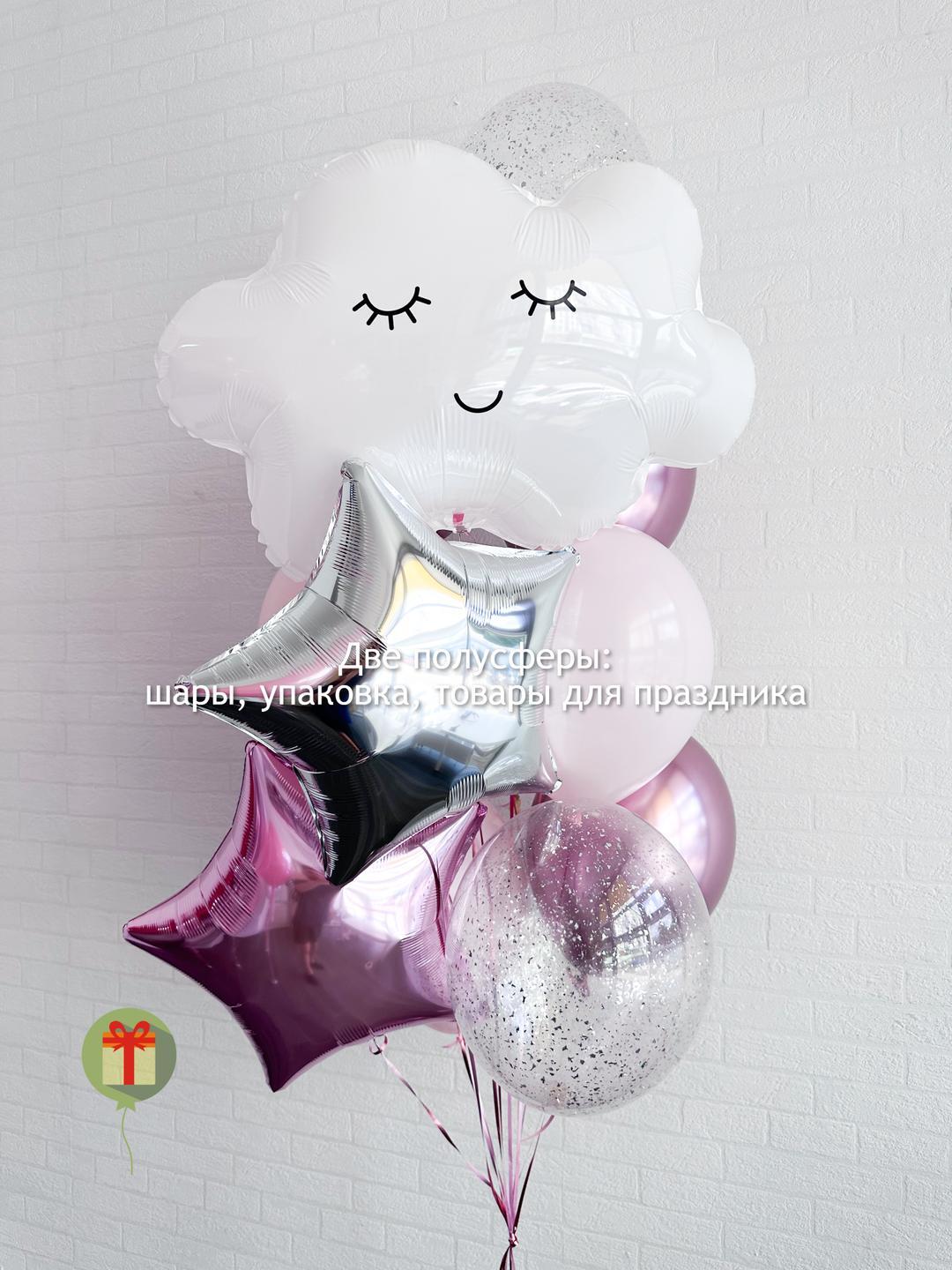 Красивый фонтан на выписку для девочки с фигуркой облака. В составе фонтана из 10 штук: фигура облачка, 2 звезды 45 см, 2 шара с конфетти, 2 шара хром и 3 шара пастель. Грузики и пакеты включены в стоимость.