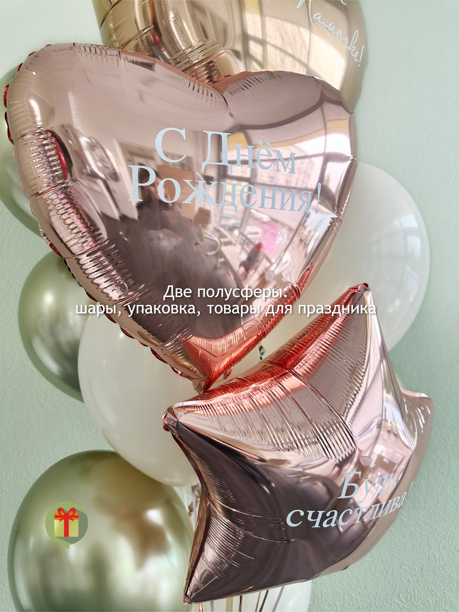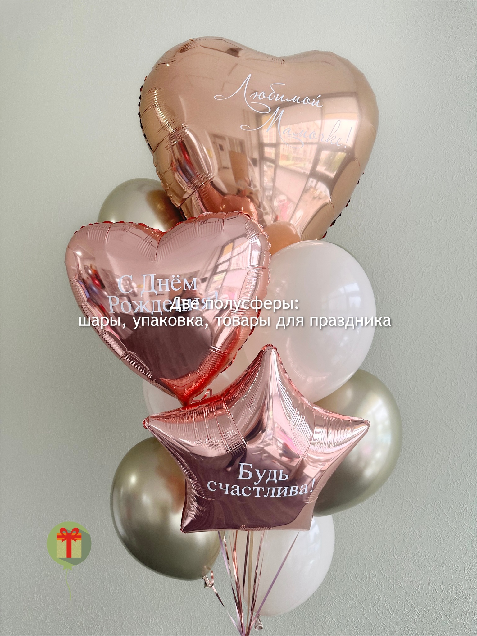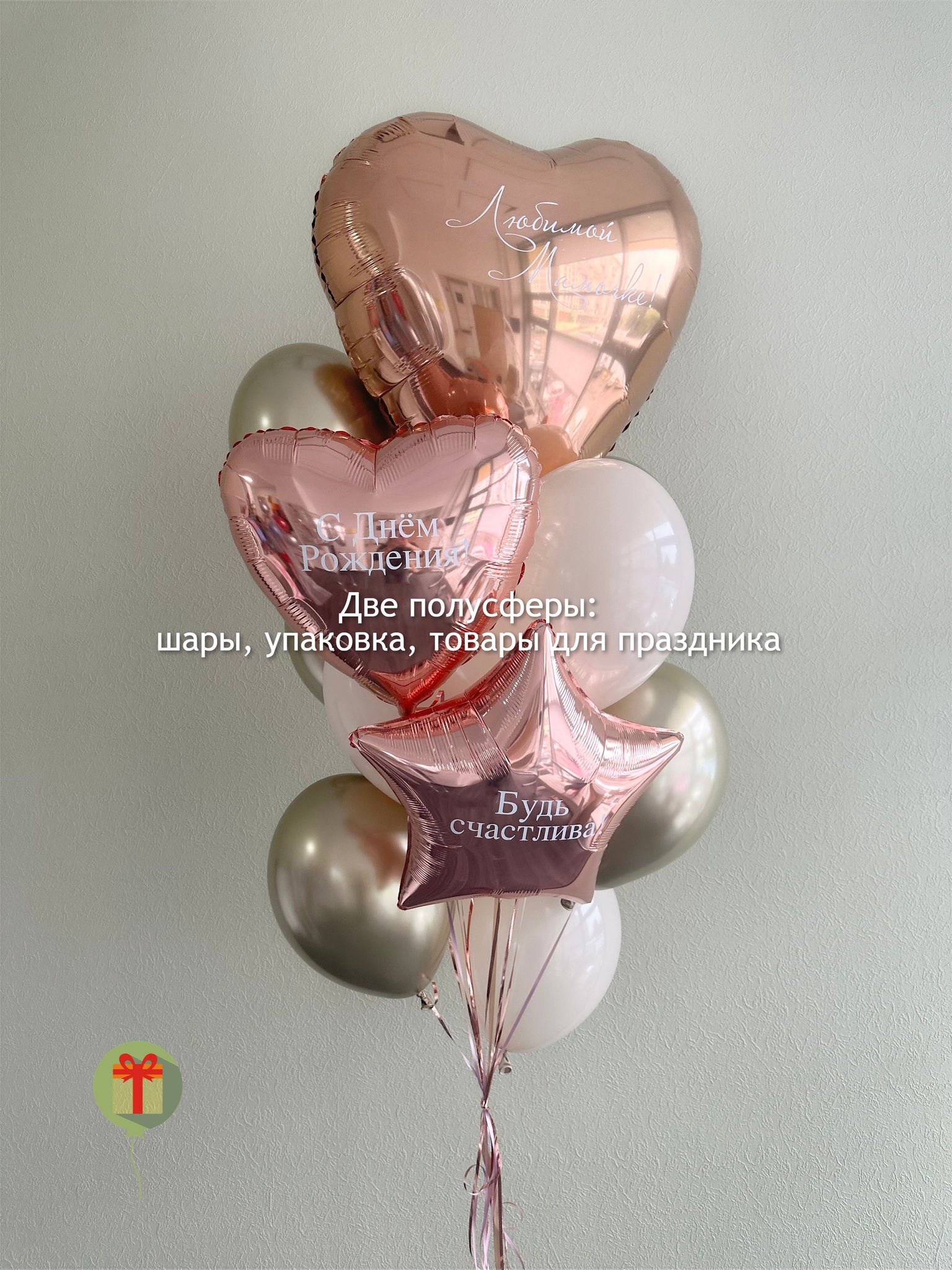 Фонтан из 10 штук: фольгированное сердце 60 см+ надпись, 2 фольгированных шара 45 см+ надписи, 3 шара хром и 4 шара пастель. Грузики и пакеты включены в стоимость.