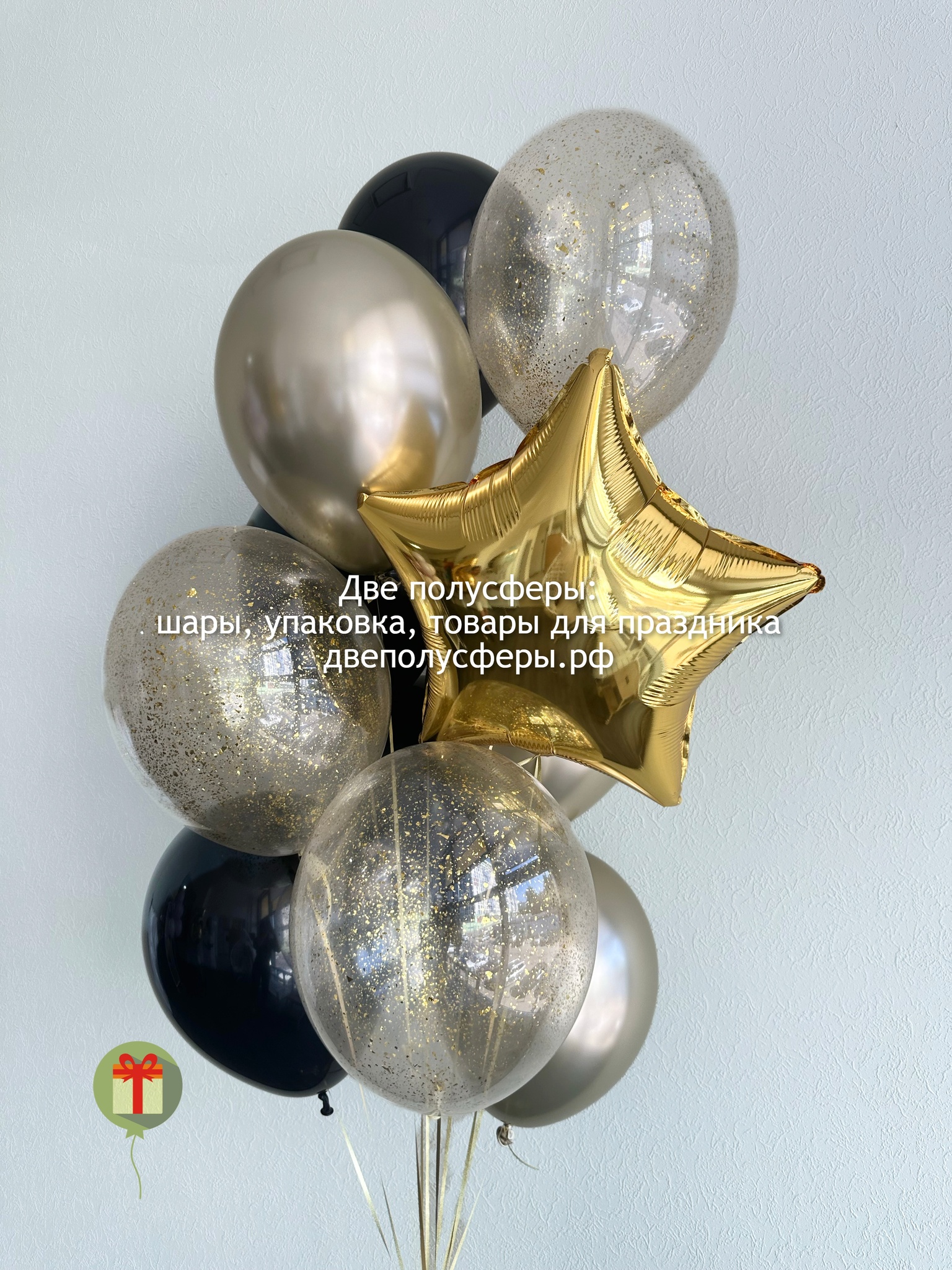 Фонтан из 11 штук: звезда 45 см, 3 шара с конфетти, 3 шара хром и 4 шара пастель. Грузики и пакеты включены в стоимость.