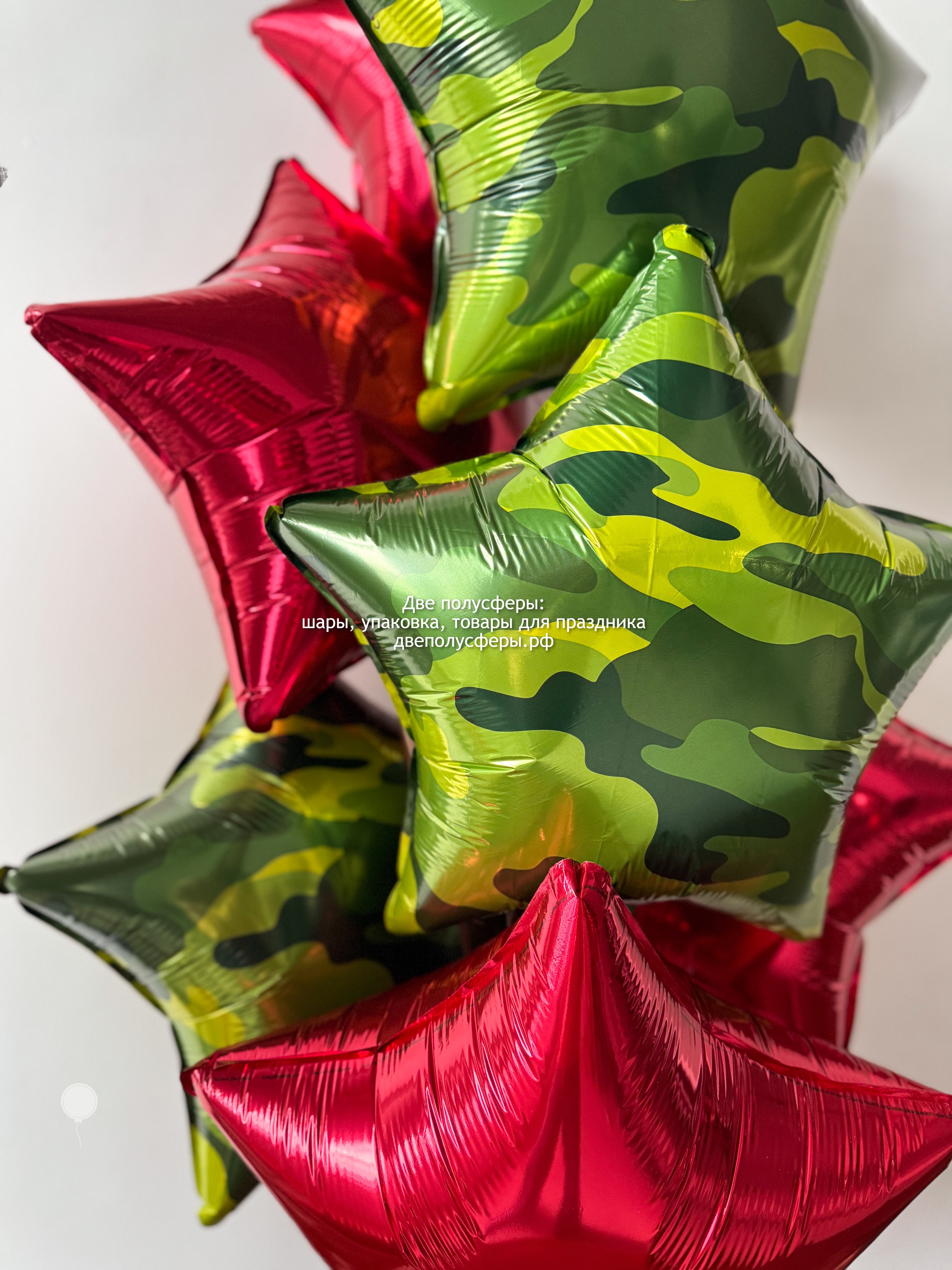 8 фольгированных звезд камуфляж и красные, собраны в фонтан. Груз и пакет входят в стоимость
