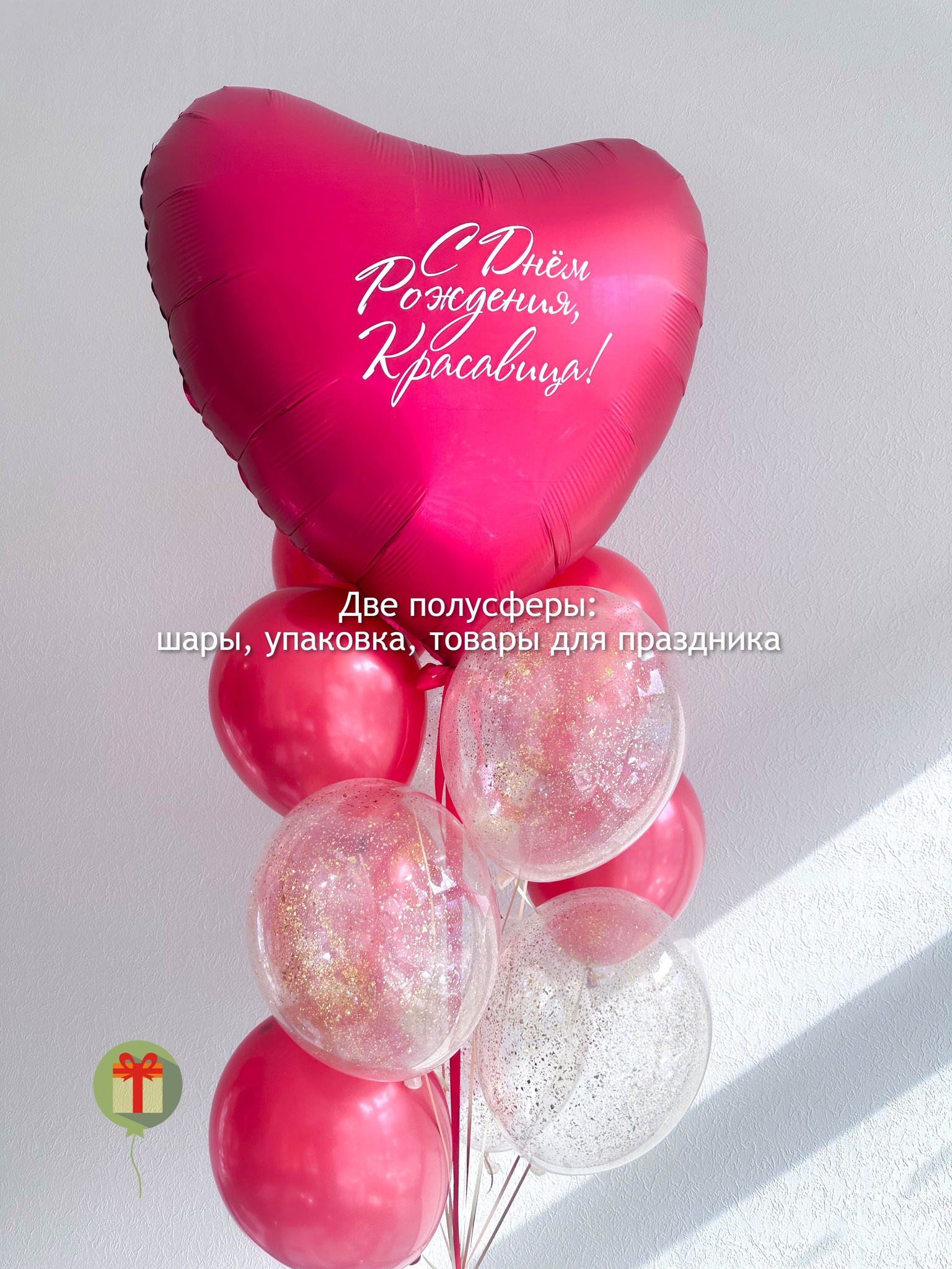 Фонтан из 13 шаров: фольгированное сердце 60 см+ надпись, 5 шаров с конфетти и 7 шаров хром. Грузики и пакеты включены в стоимость.