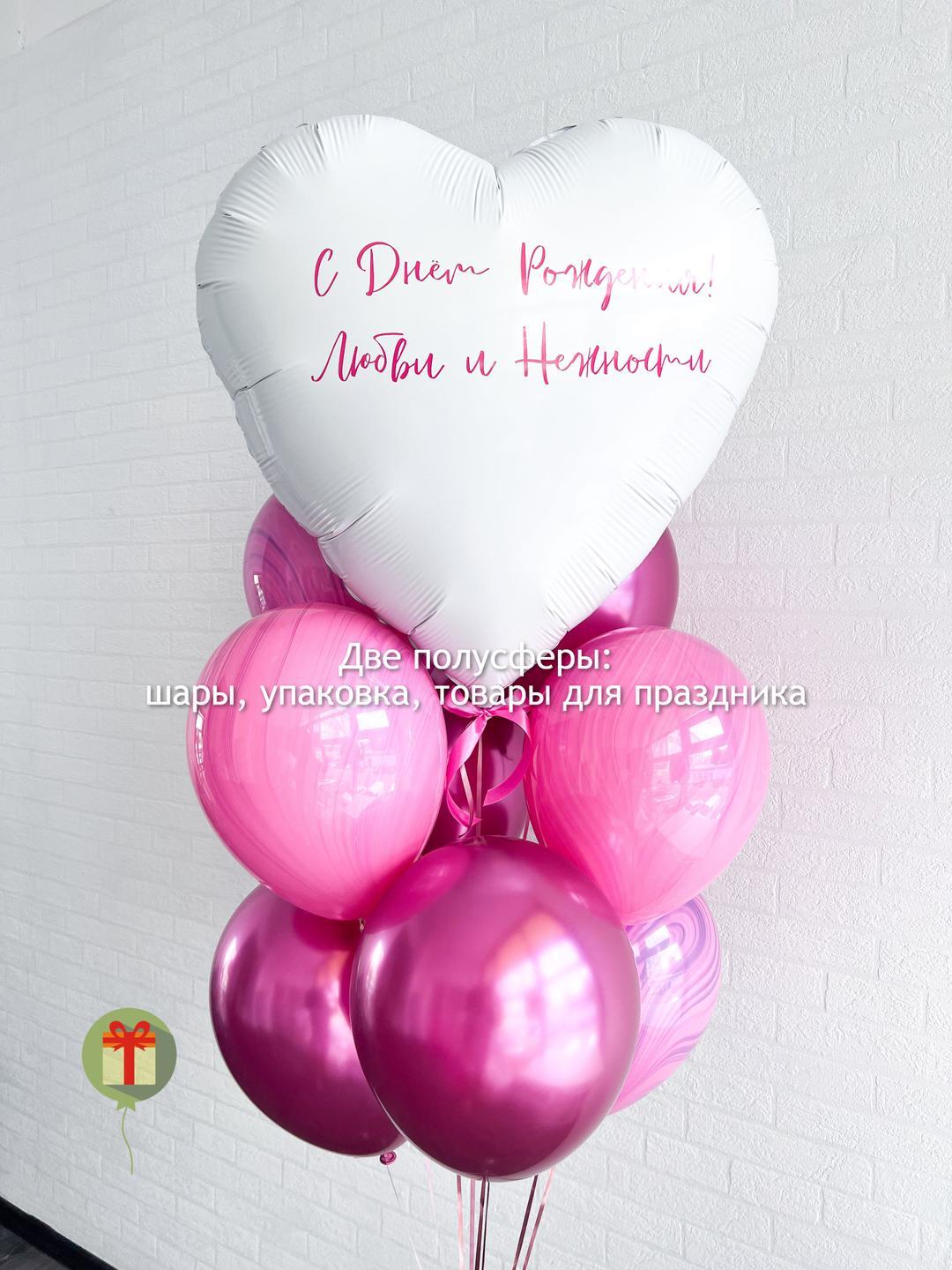 Яркий розовый фонтан для девушки из 9 шаров, включает в себя, сердце 60см с надписью, а так же 4 шара агат и 4 шара хром. Грузик и пакет включены в стоимость.