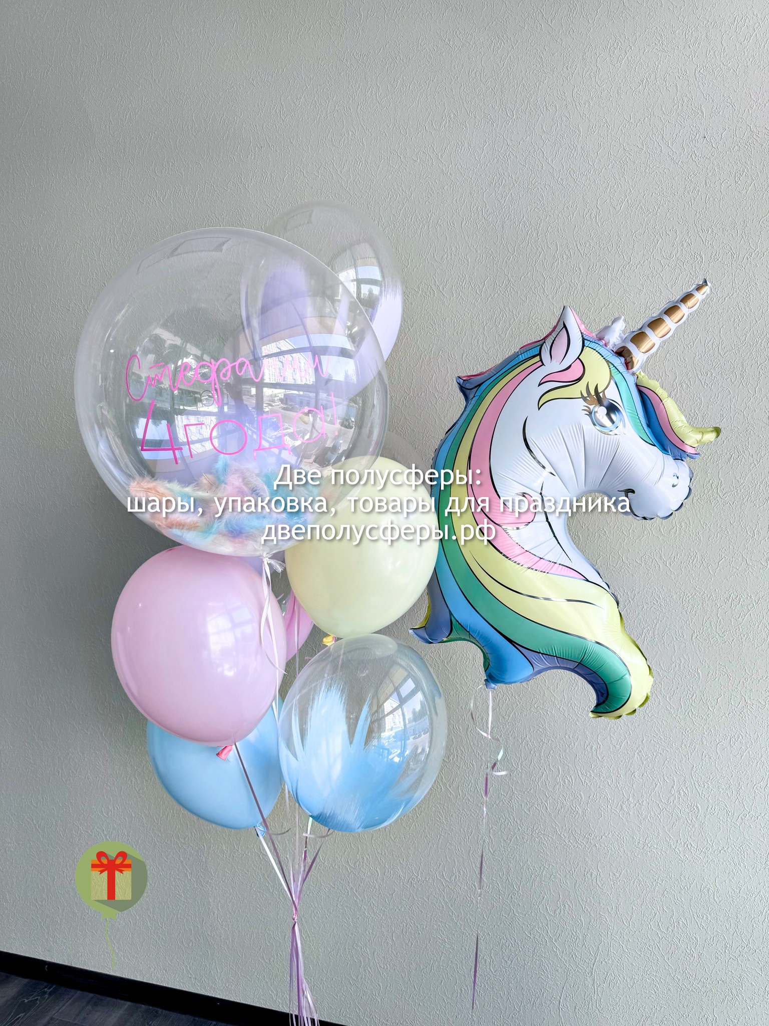 Набор с фольгированным единорогом, фонтан из 7 шаров, в составе : сфера 45 см с перьями и надписью, 3 шара браш и 3 шара пастель, грузик и пакет входят в стоимость.