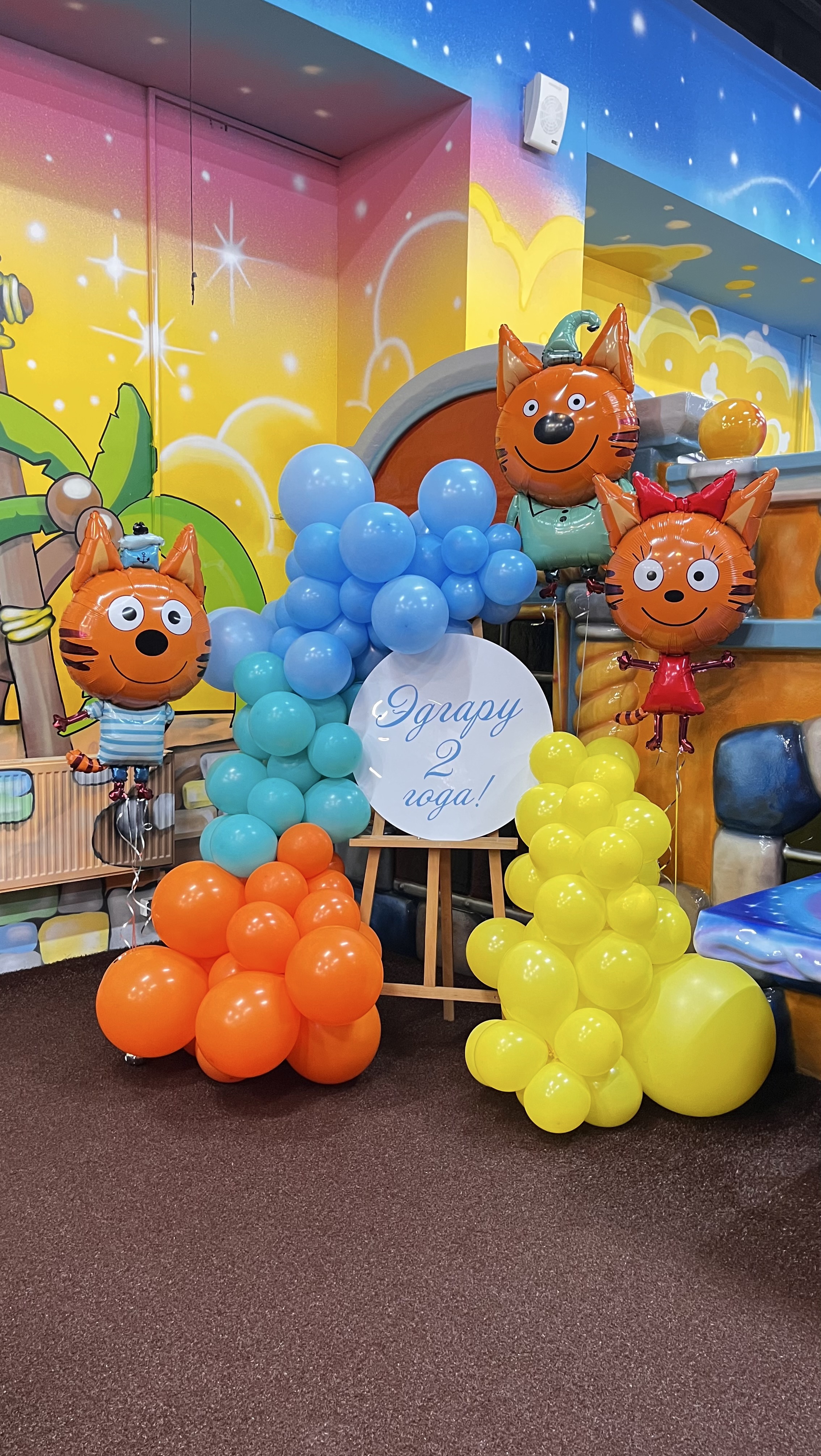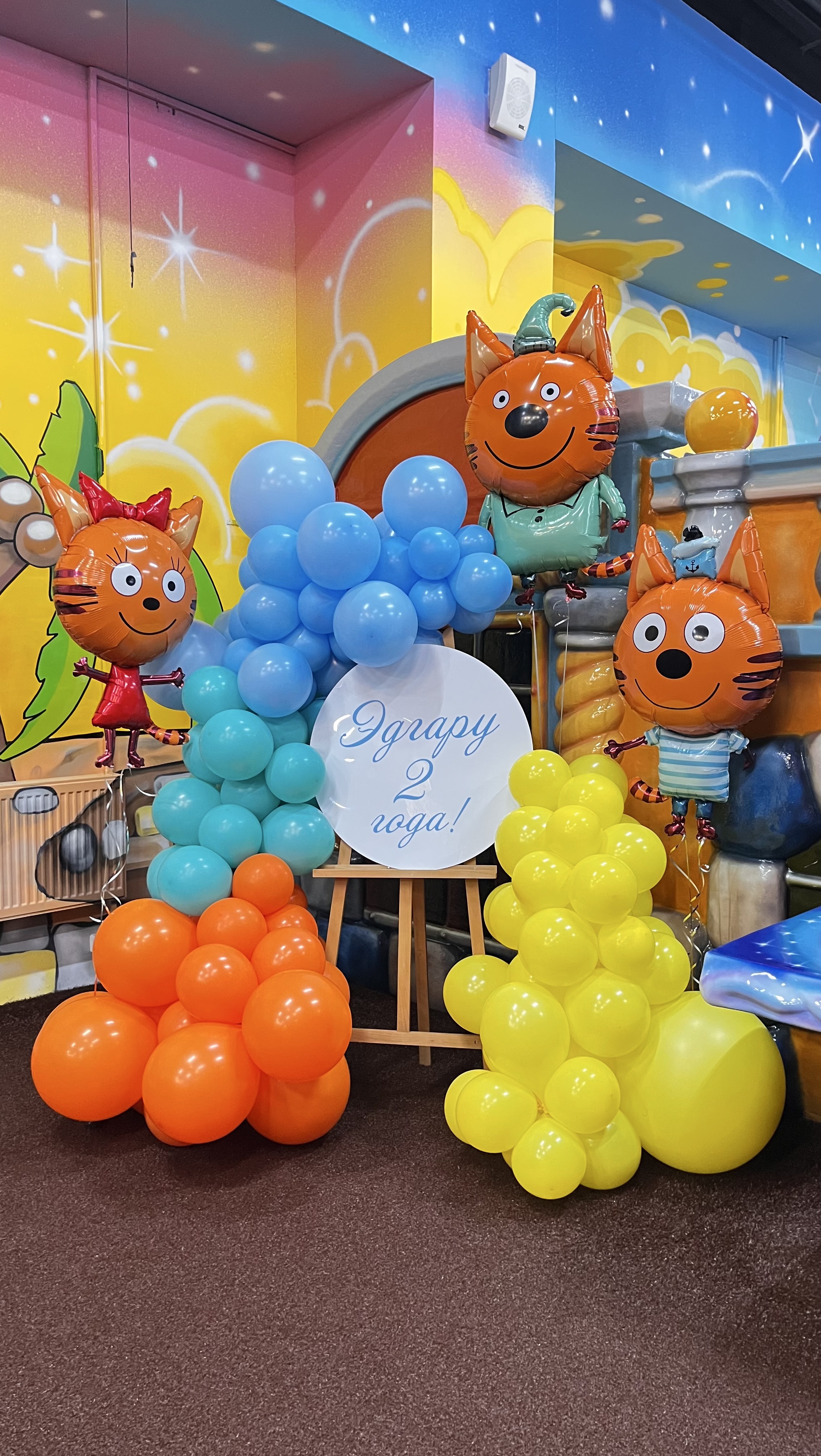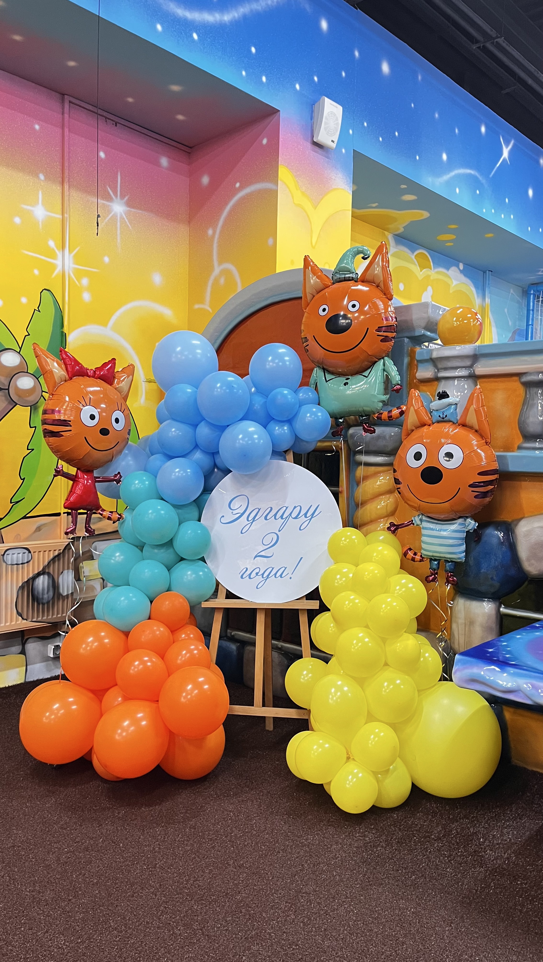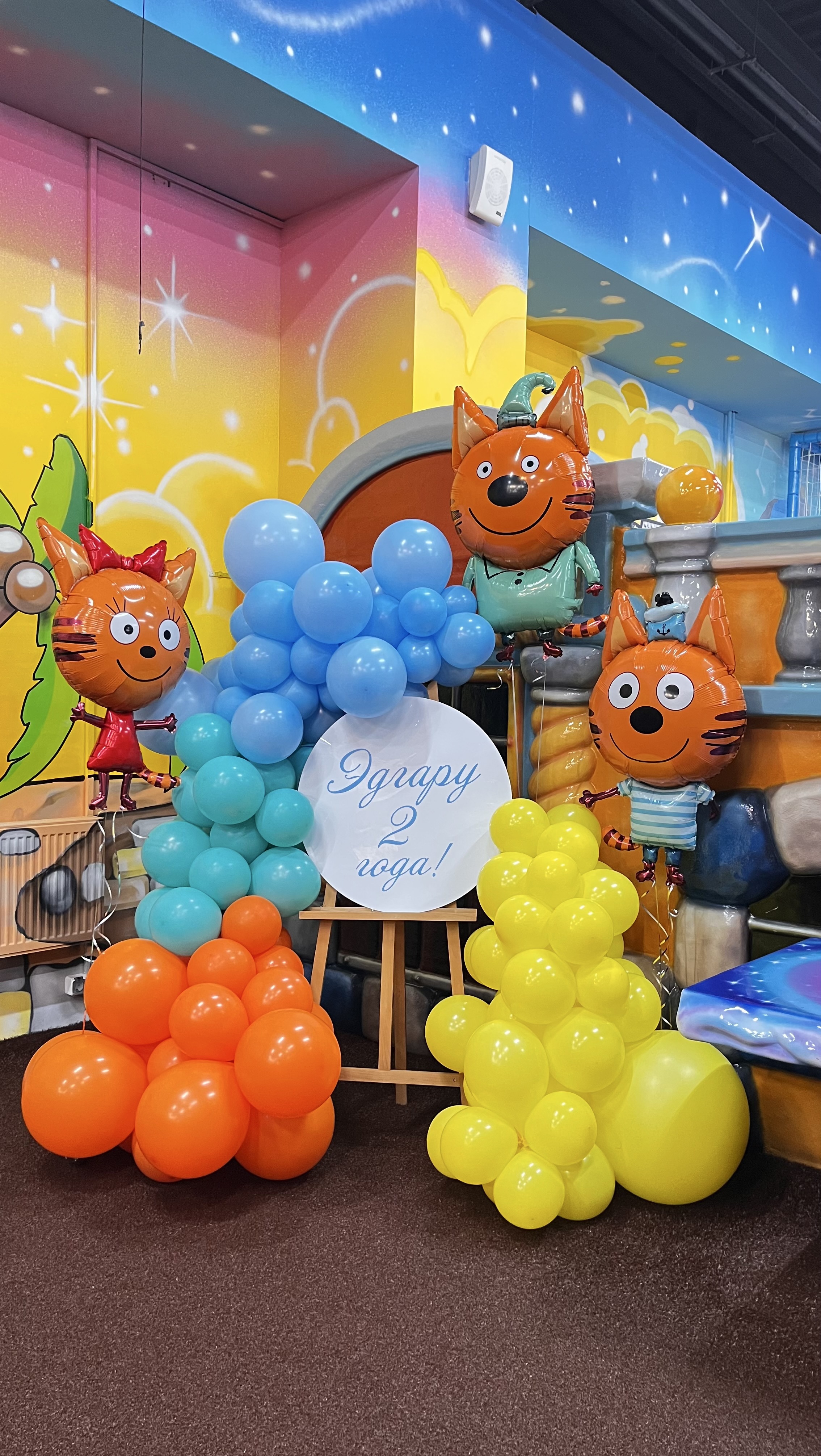 Фотозона на мольберте с пышной гирляндой, именной надписью и фигурками 3-х котов с гелием
