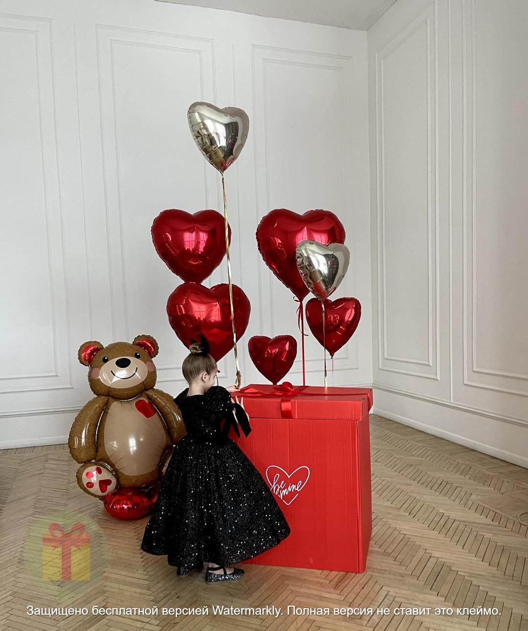 Состав набора: коробка 70*70*70 см с надписью и бантом из атласной ленты, 3 красных сердца 60 см с гелием на грузиках, 5 сердец 45 см с гелием на грузиках К набору можно добавить влюбленного мишку. Грузики и пакеты входят в стоимость