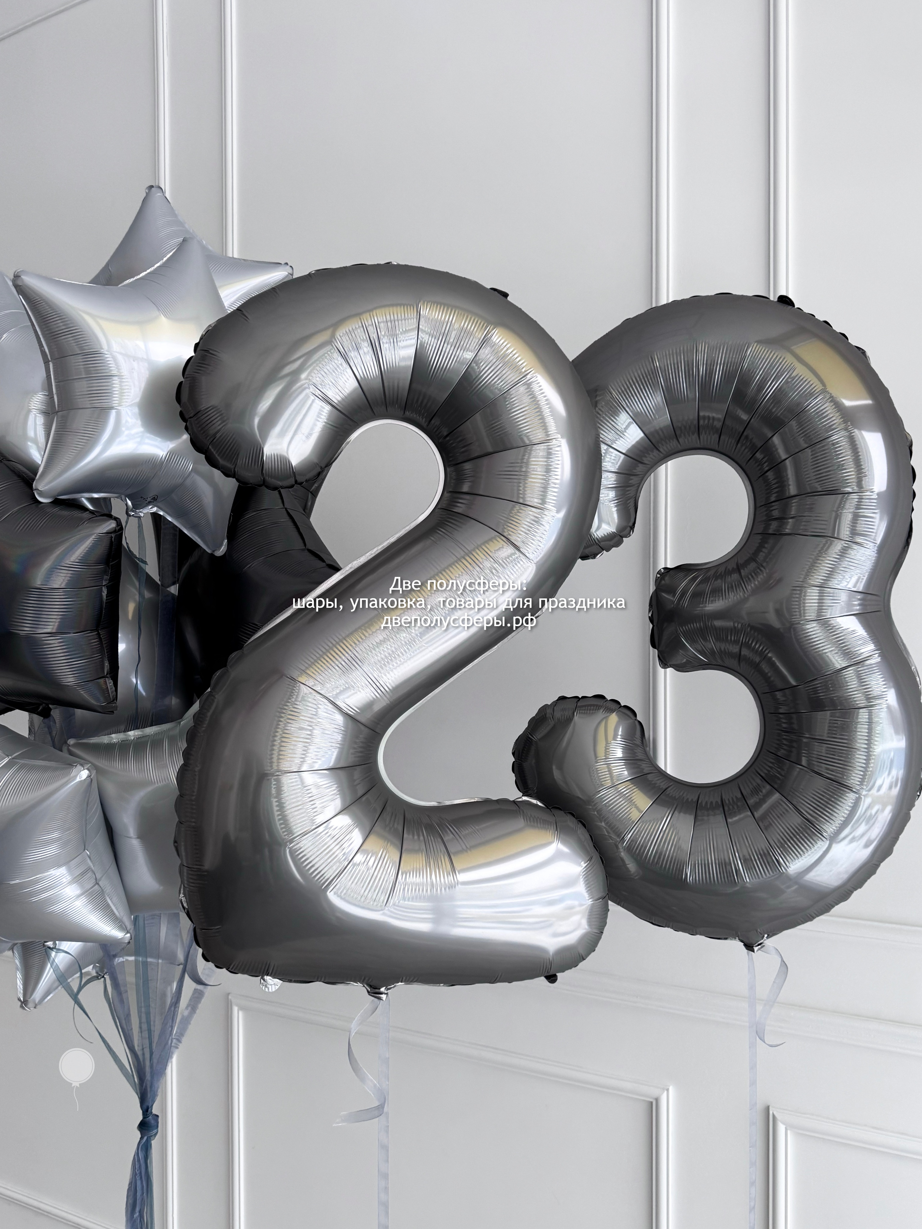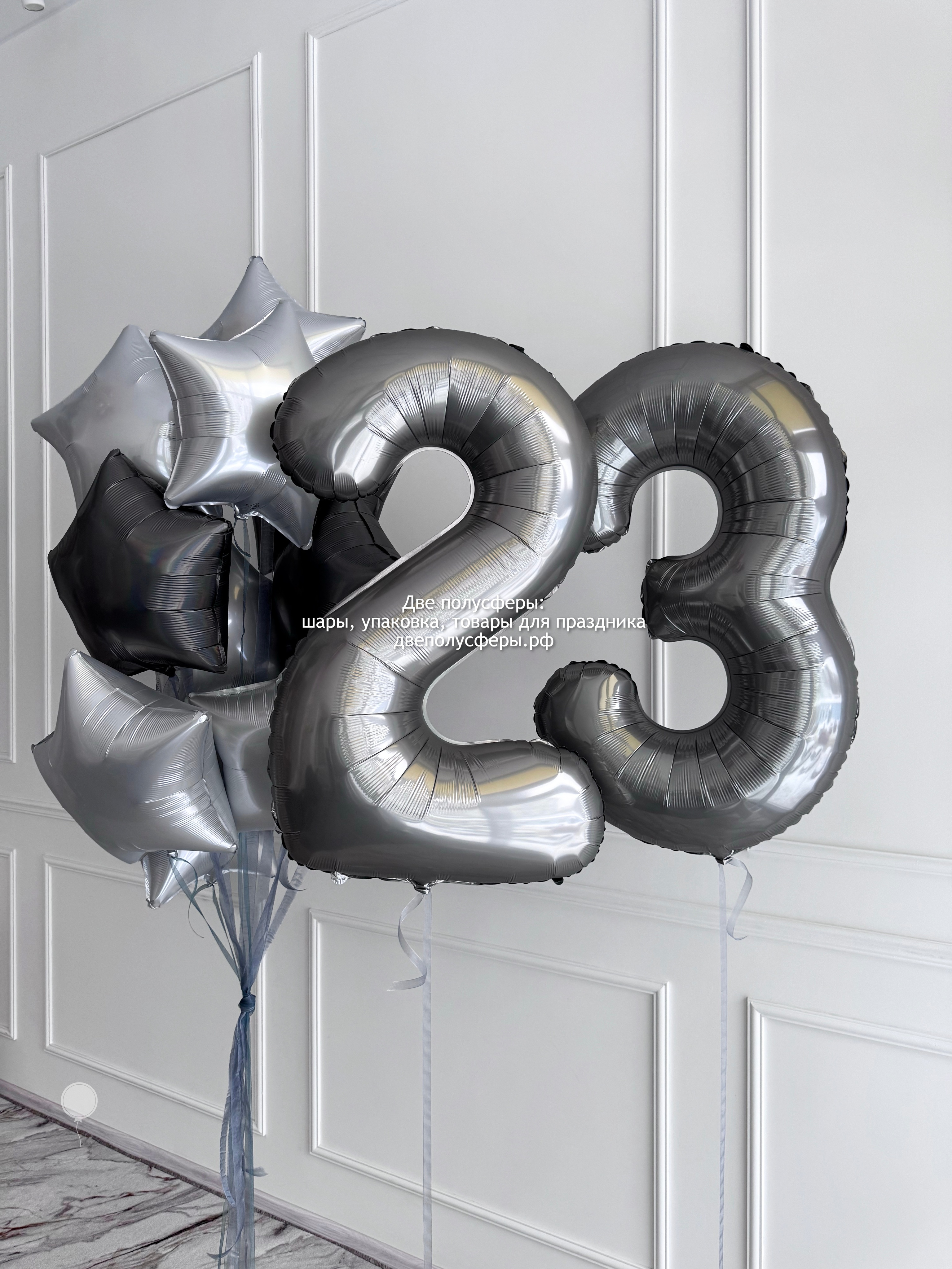Фонтан из 10 фольгированных звезд и цифры 23 из фольги, размером 102 см. Грузики и пакеты входят в стоимость