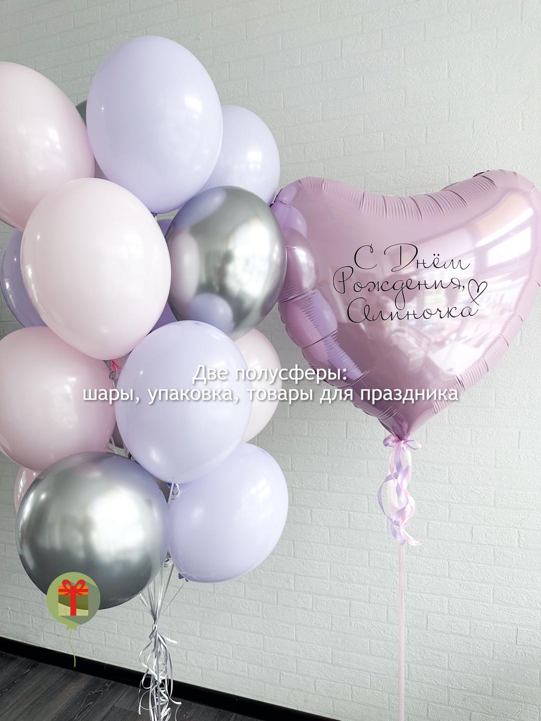 Нежный фонтан из 15 штук: 5 шаров хром и 10 шаров пастель; а так же фольгированное сердце 60 см+ надпись. Грузики и пакеты включены в стоимость.
