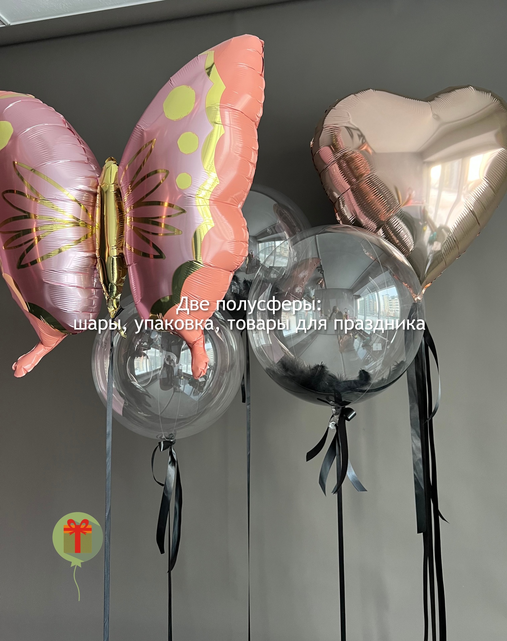 Фольгированная фигура бабочки и 3 сферы 60 см с перьями, а так же фольгированное сердце 60 см, декорированное пышным хвостом. Грузики и пакеты включены в стоимость.