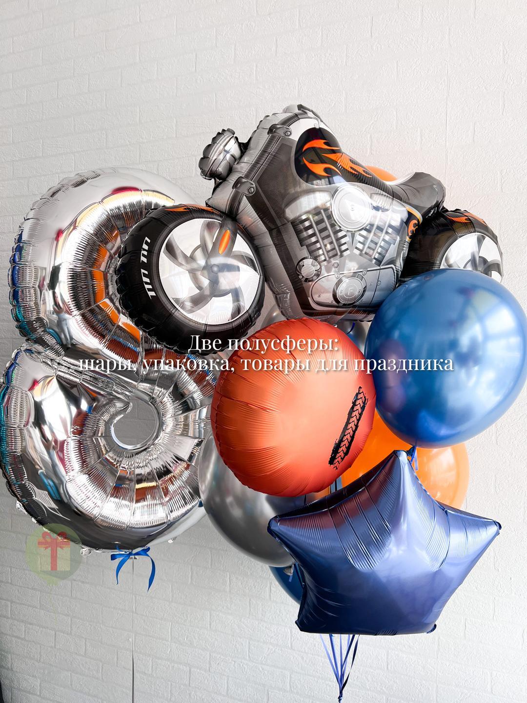 Яркий набор для мальчика/мужчины с фольгированной цифрой 102 см и фигуркой байка 64 см, 2 фольгированных звезды, 2 шара хром и 2 шара пастель, грузики и пакеты входят в стоимость