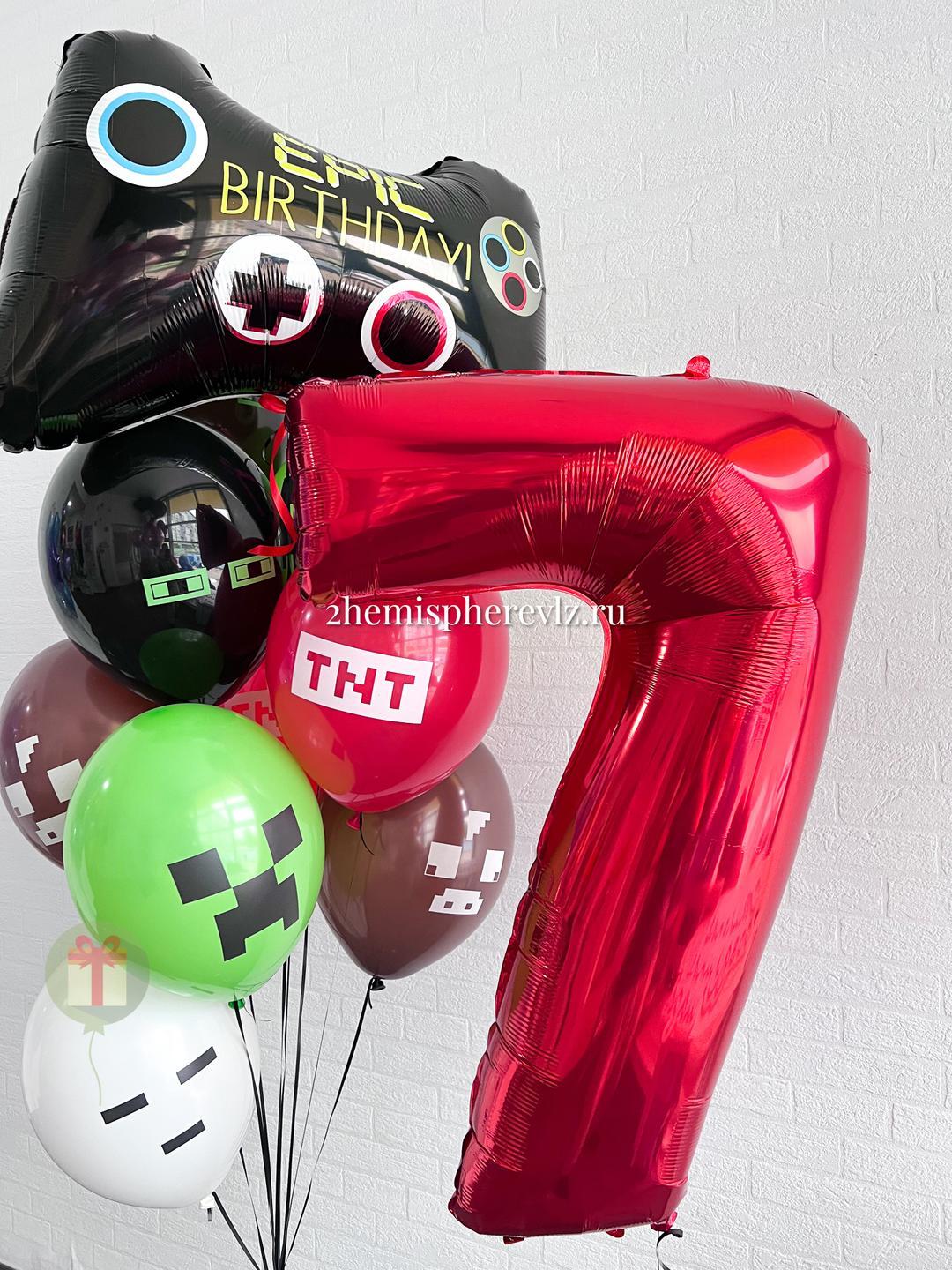 Набор с цифрой из фольги 102 см и фонтан из 9 шаров: фигура фольгированная джойстика и 8 шаров с рисунком майнкрафт. Грузики и пакеты включены в стоимость.