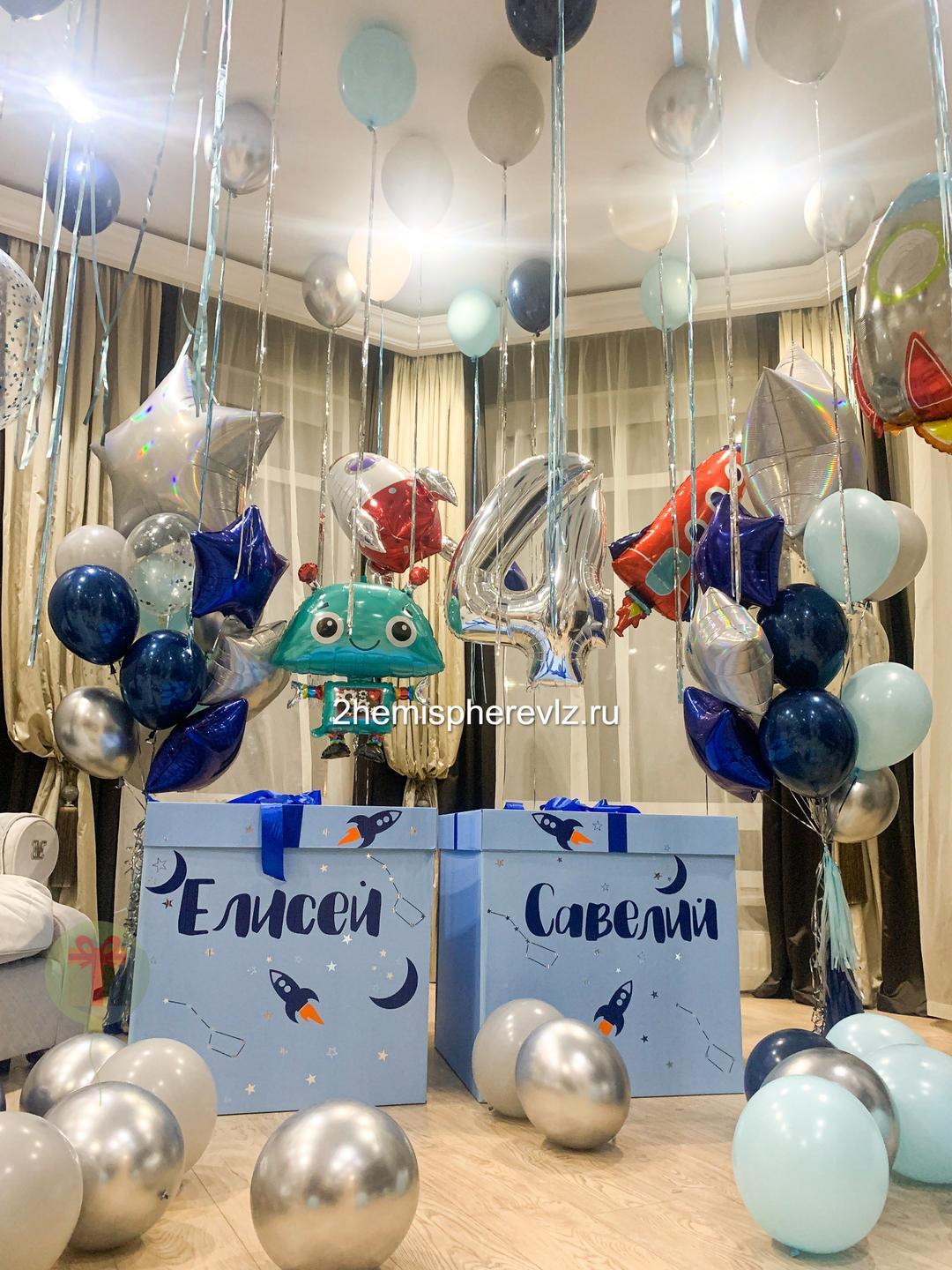 Огромный и шикарный набор для 2-х мальчиков на день рождения! Набор полностью готов для украшения вашей вечеринки! В составе: 2 фонтана по 13 штук, цифра, 4 фольгированных космических фигуры,2 больших коробки с индивидуальными надписями для подарков, шары под потолок-15 штук,шары воздухом на пол-15 штук .Все шарики под потолком на дождике и фонтаны украшены пышными хвостами!