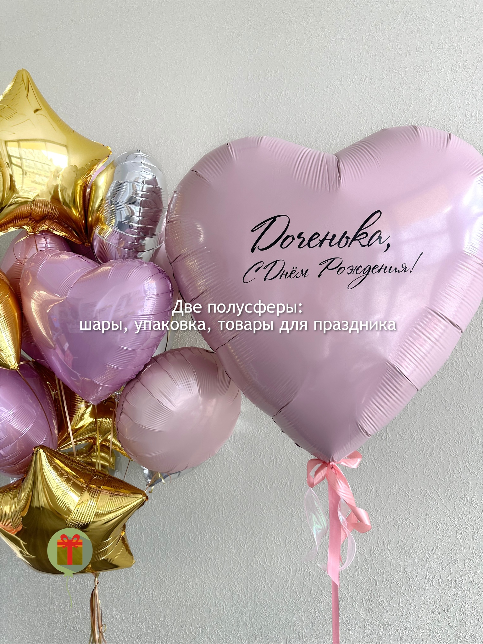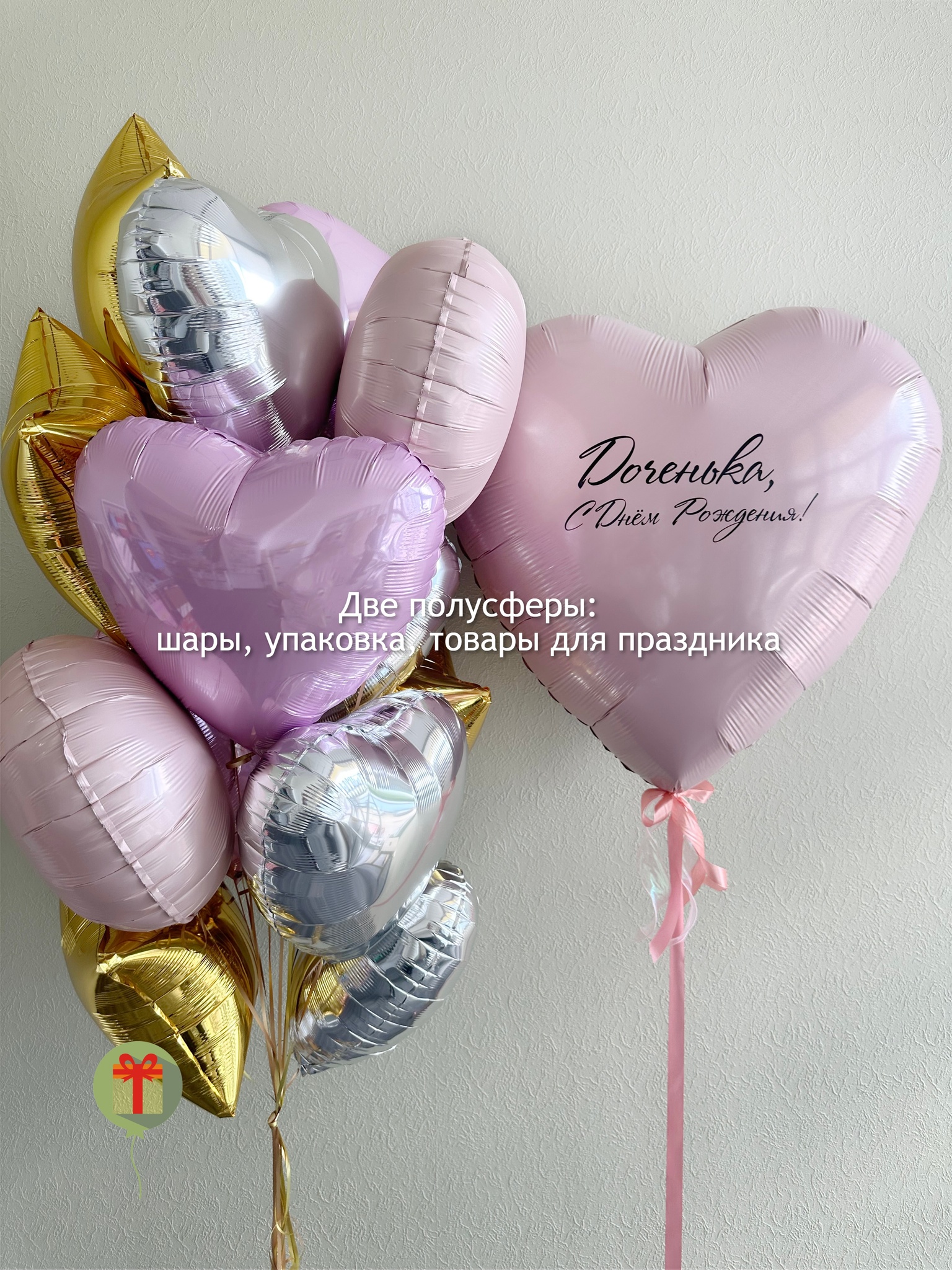 Стильный набор для доченьки, в составе : большое фольгированное сердце 60 см с индивидуальными надписью, фонтан из 10 фольгированных сердец /звёзд 45 см, грузик и пакет входят в стоимость.