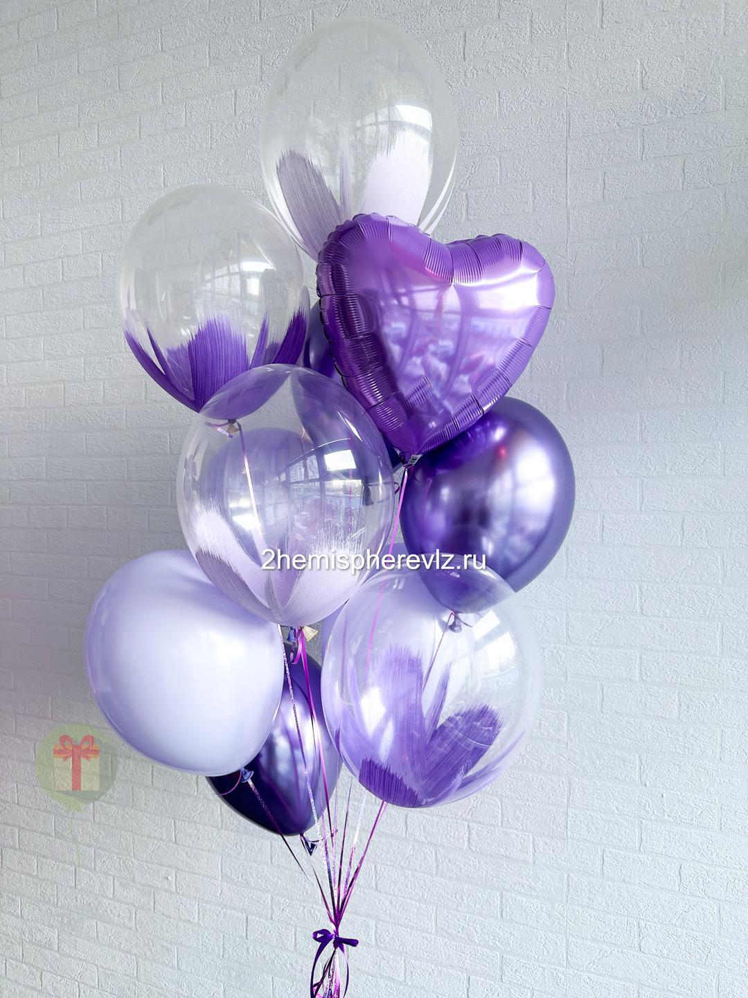 Фонтан из 11 шаров в лиловых оттенках (1 фольгированный шар 45 см, 4 шара браш, 4 шара хром, 2 шара пастель). Грузик и пакет включены в стоимость.