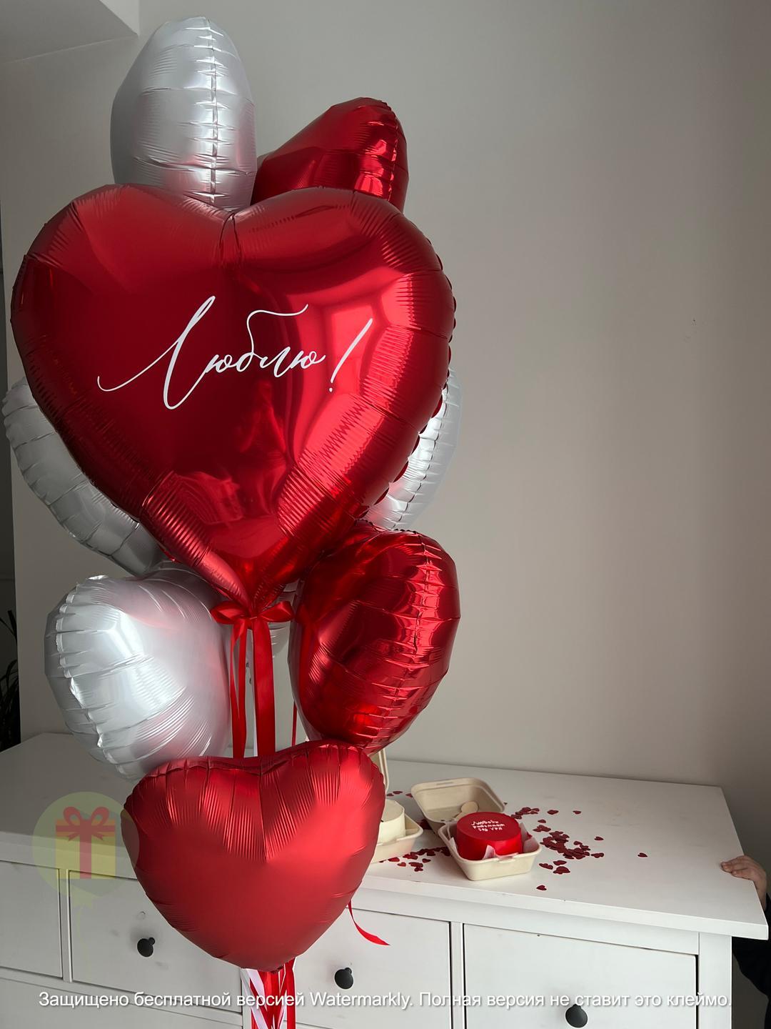 Состав набора: 7 фольгированных сердец 45 см в красно-белой гамме на грузике; большое красное сердце 60 см с надписью, на грузике, пакет входят в стоимость