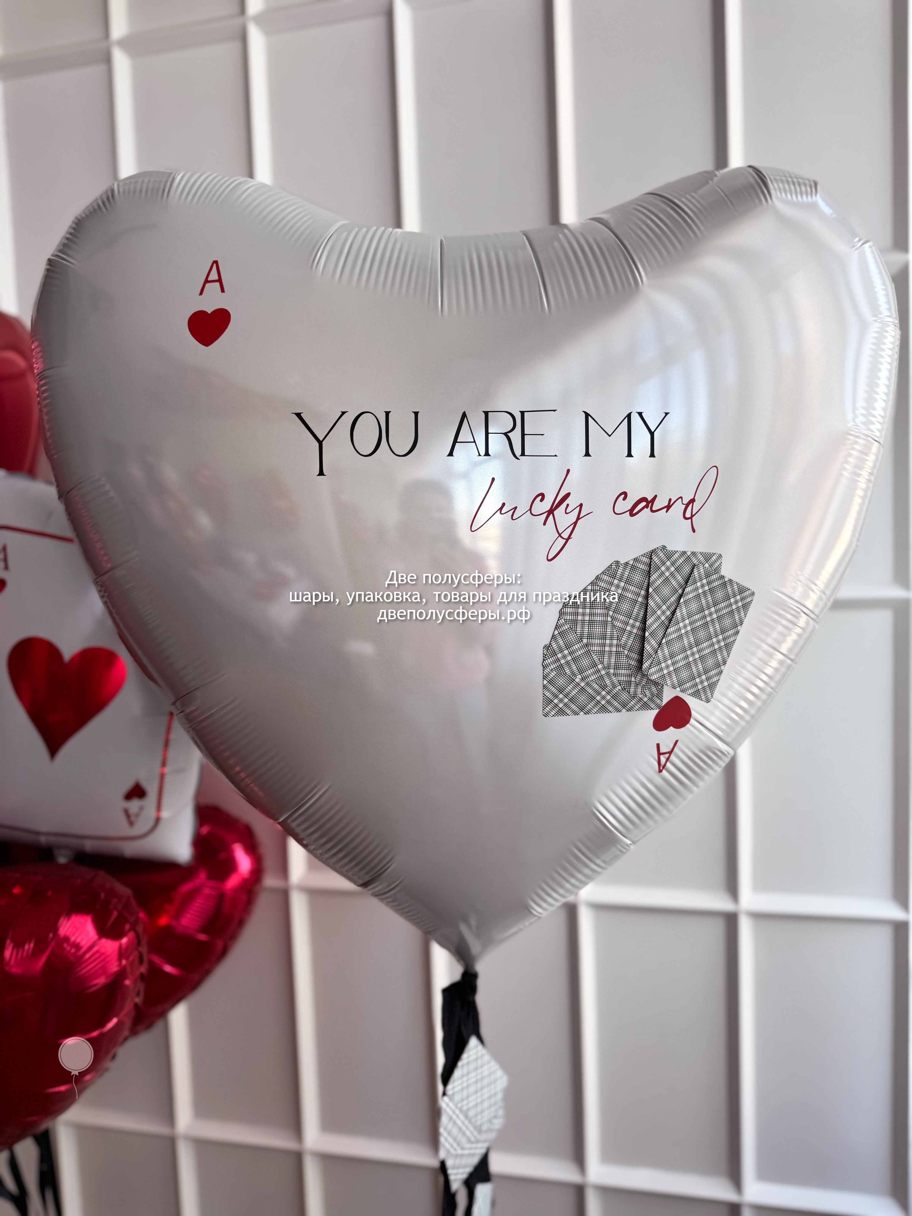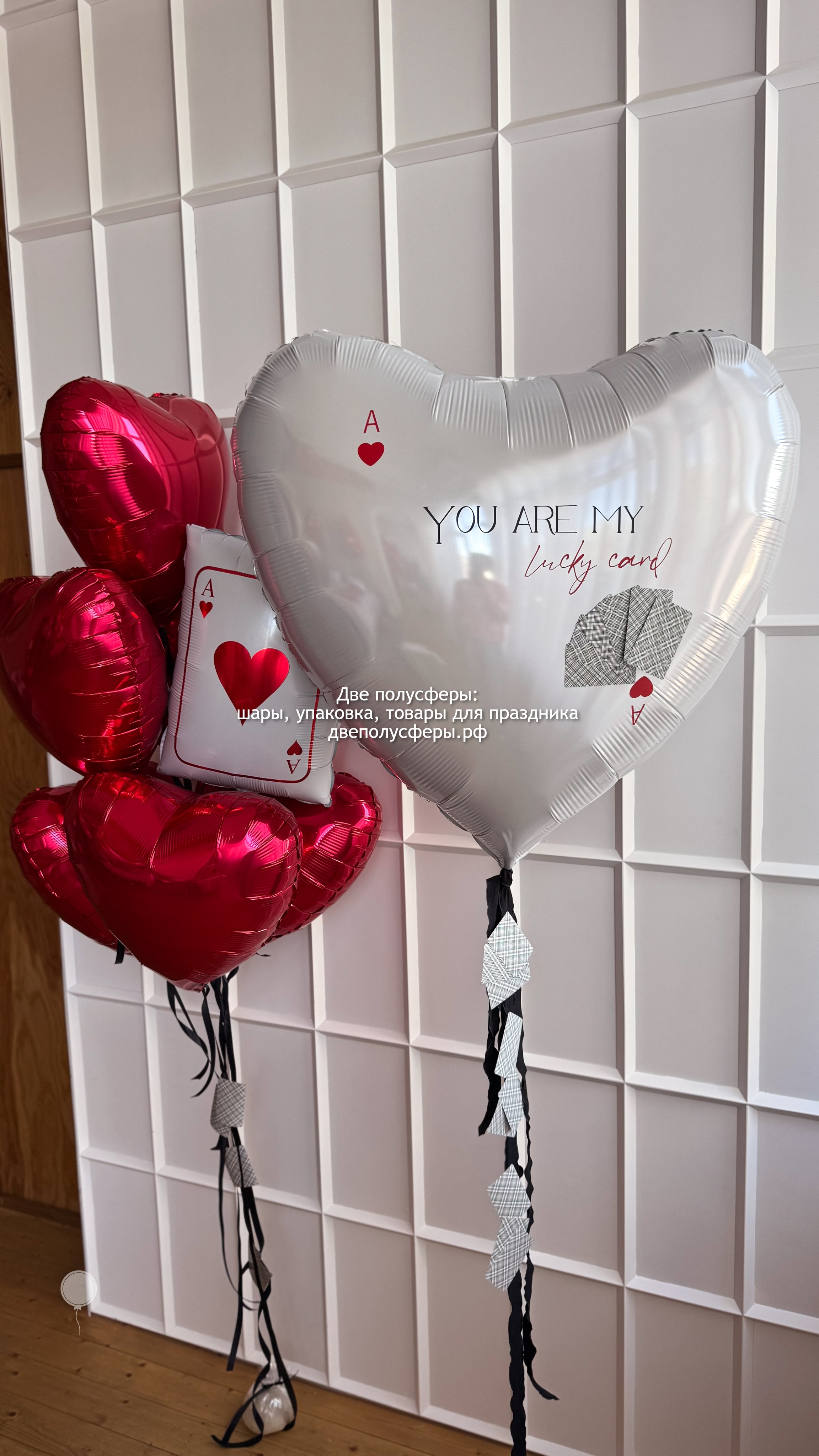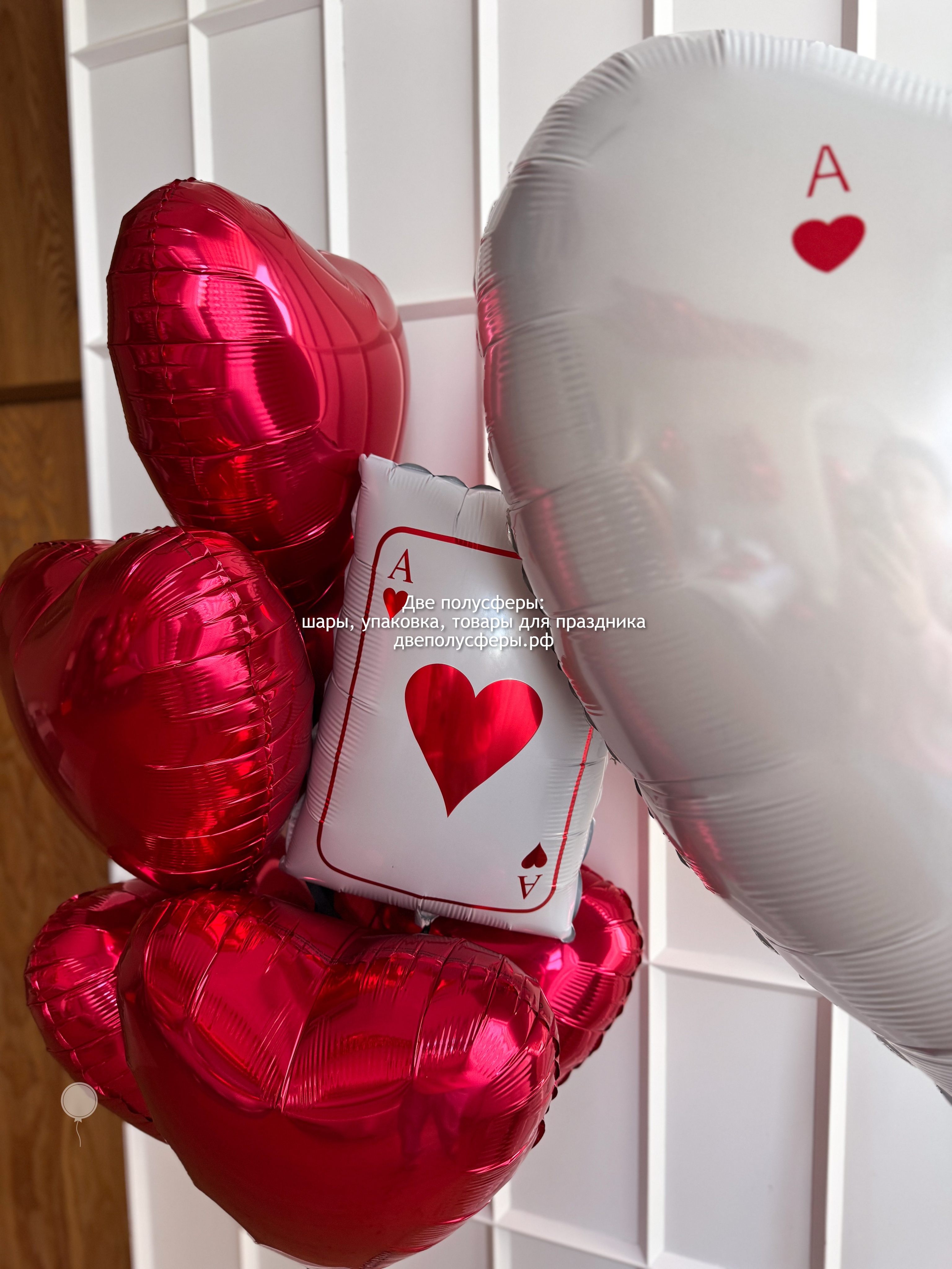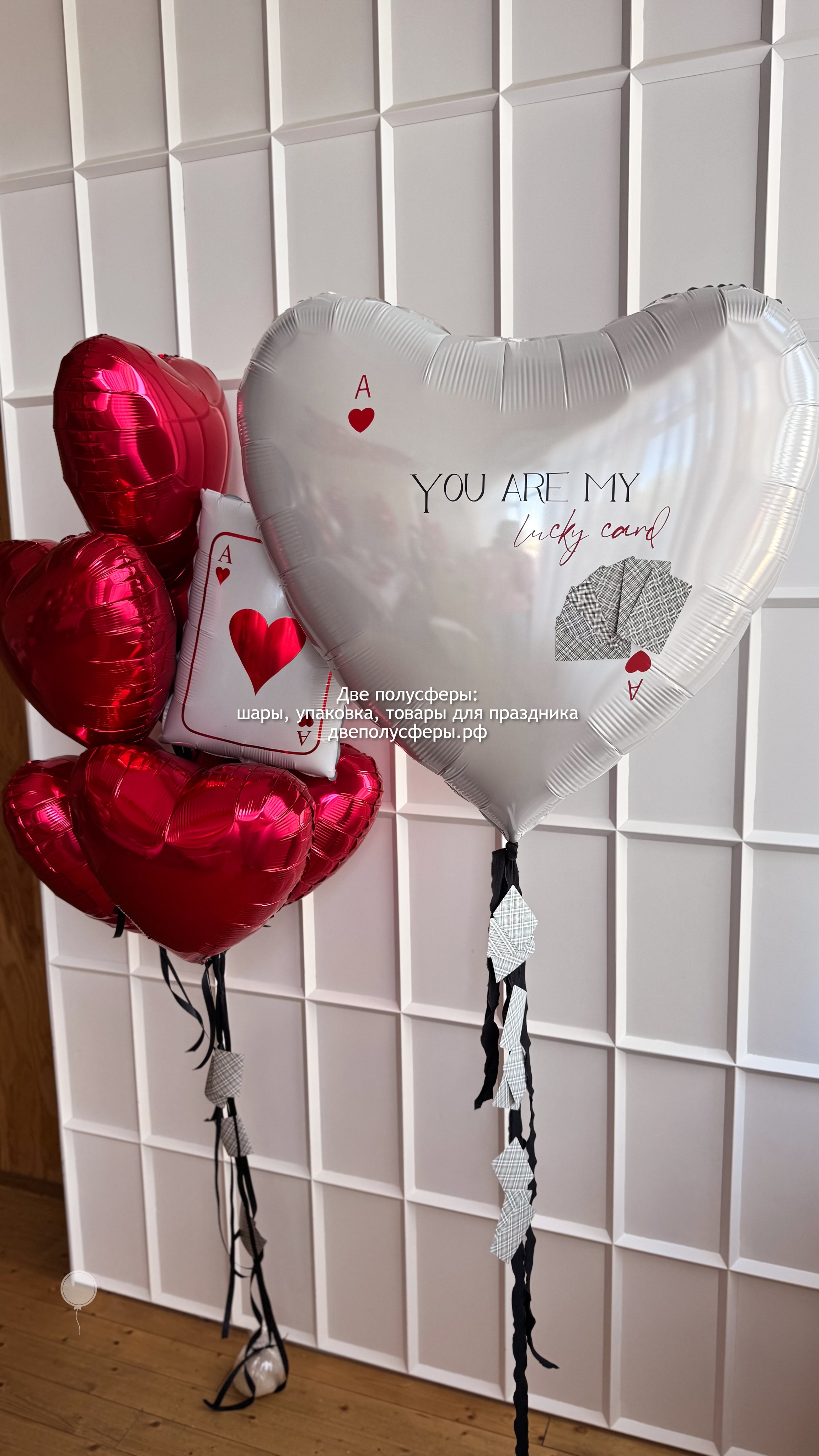 Сердце 90 см с надписью и декором игральными картами, фонтан из 6 сердец 45 см и фигурой карты туз червей. Грузики и пакеты входят в стоимость