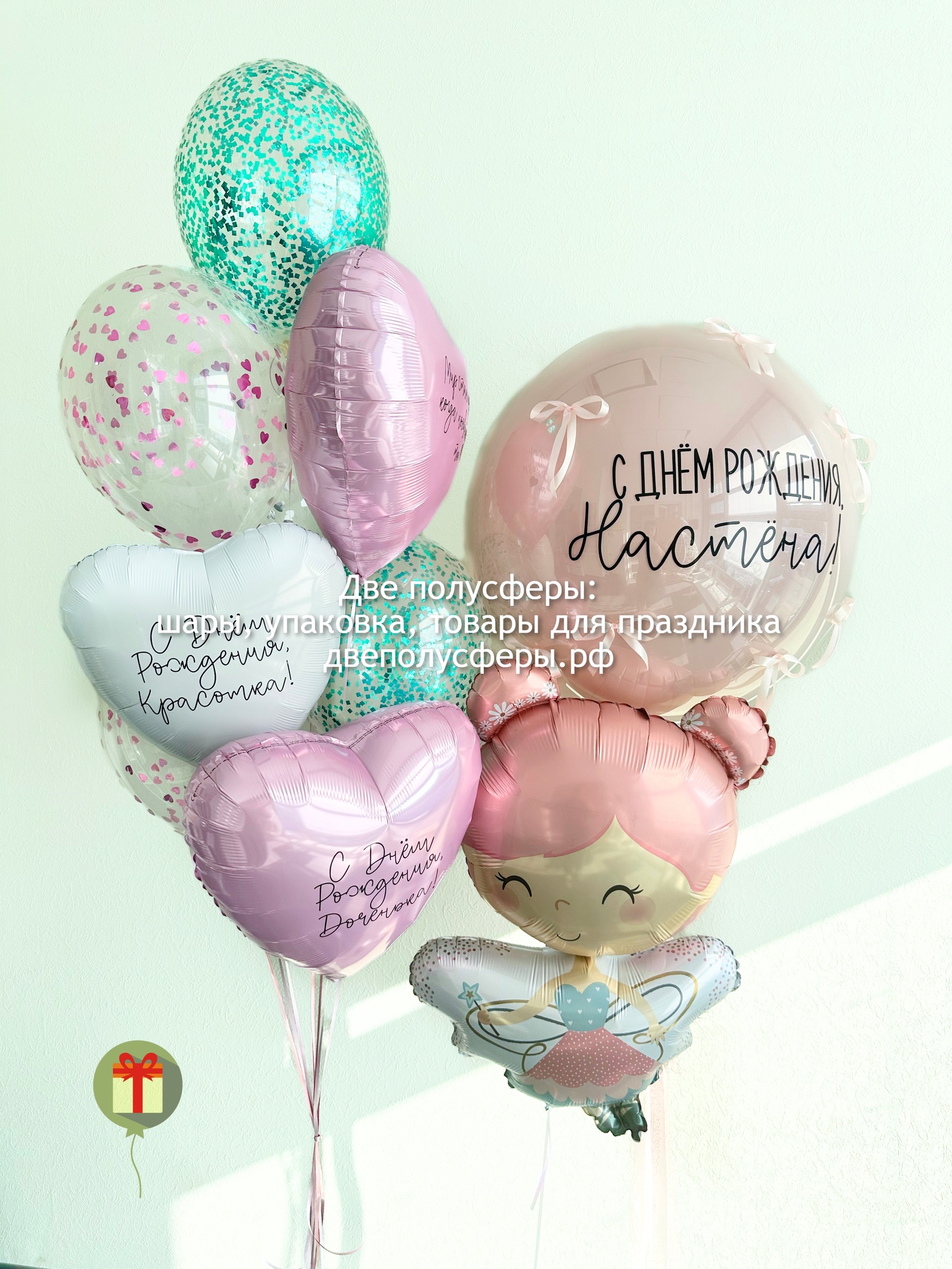 Нежный набор с большим шаром бабл дабл 60 см с надписью и бантиками, фольгированная фигура, фонтан из 10 шаров, 3 фольгированных сердца с надписью и 7 шаров с конфетти, грузик и пакет входят в стоимость.