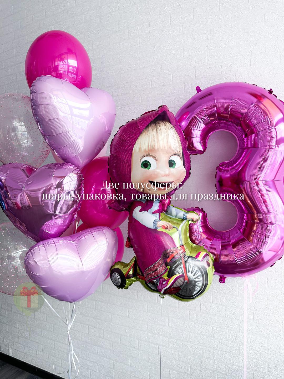 Фольгированная цифра 102 см, фигурка Маши и фонтан из 10 штук: 3 фольгированных шара 45 см, 2 шара с конфетти, 2 шара пастель и 3 двойных шара. Грузики и пакеты включены в стоимость.