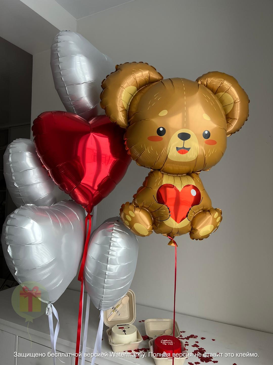 Состав набора: фигура медвежонок фольгированный на грузике, фонтан из 5 фольгированных сердец 45 см на грузике, пакет входят в стоимость