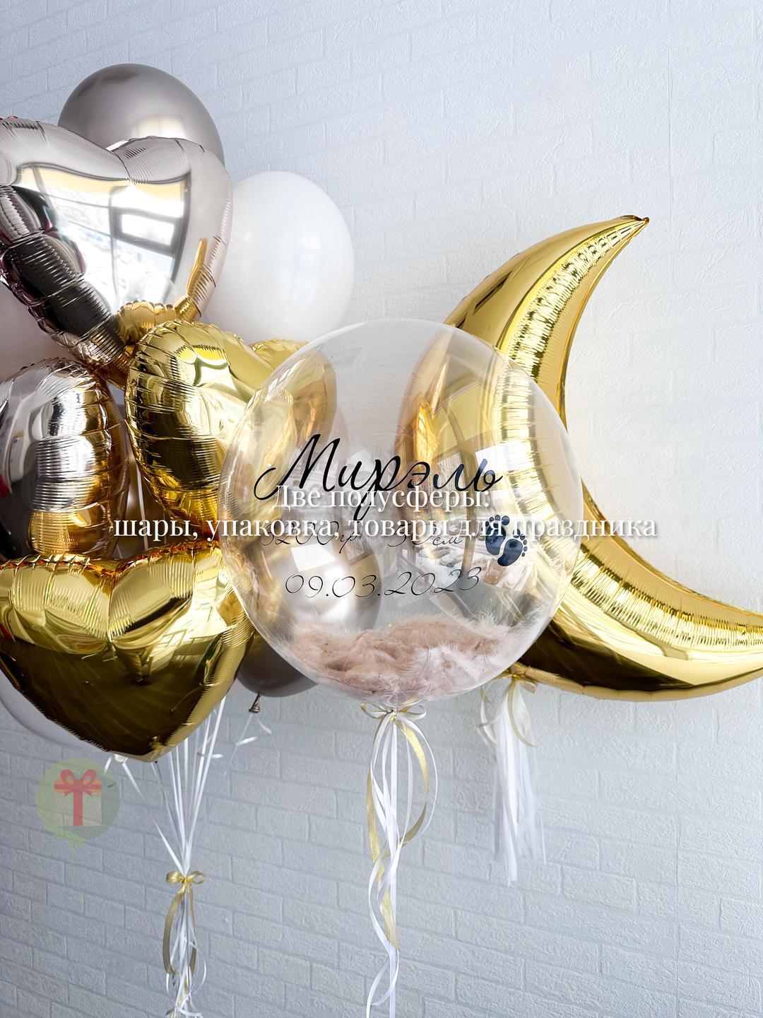 Сфера 60 см с перьями+ надпись, фольгированная фигура луны и фонтан из 10 шаров: 4 фольгированных сердца 45 см, 2 шара хром и 4 шара пастель. Грузики и пакеты включены в стоимость.
