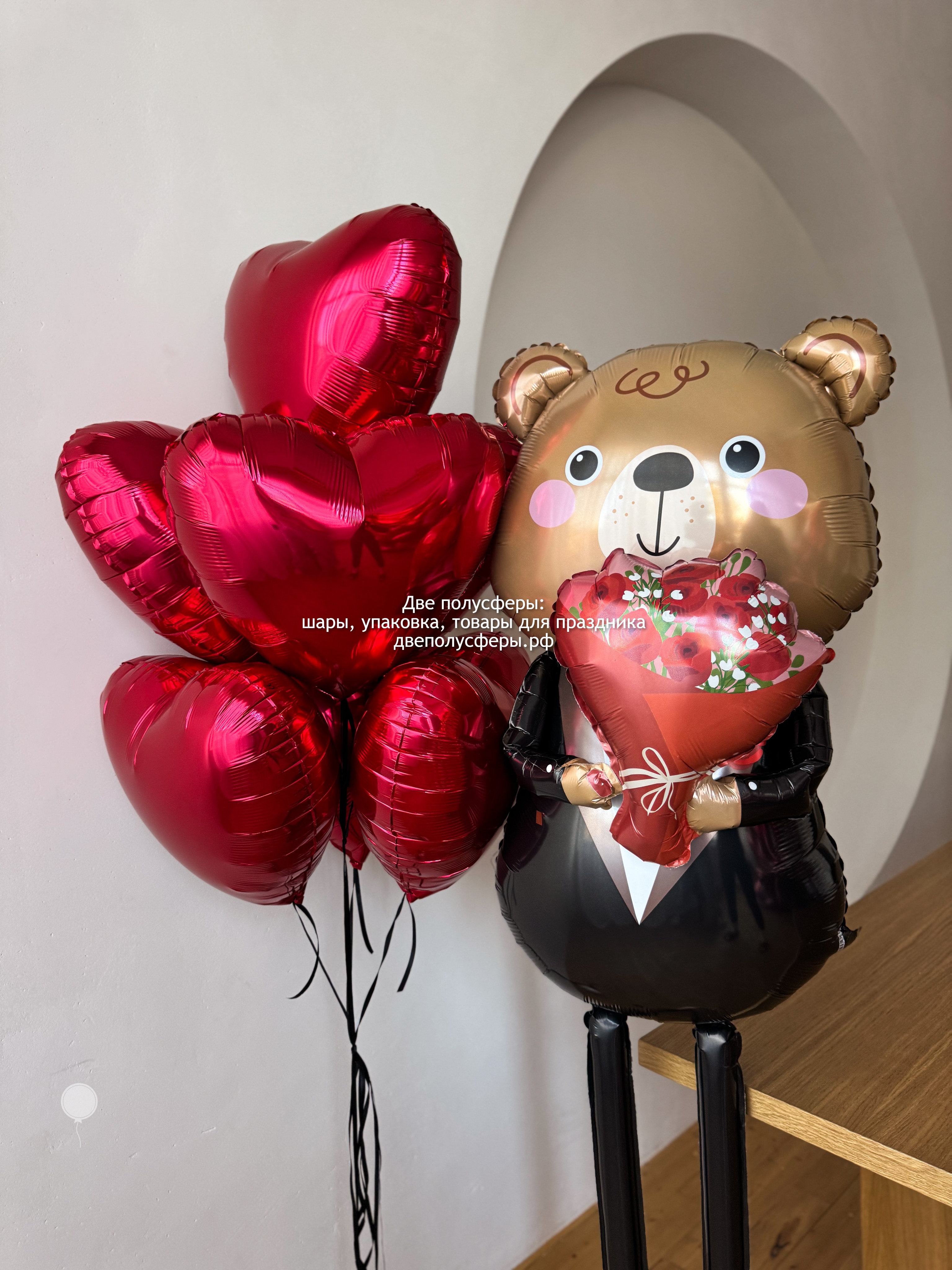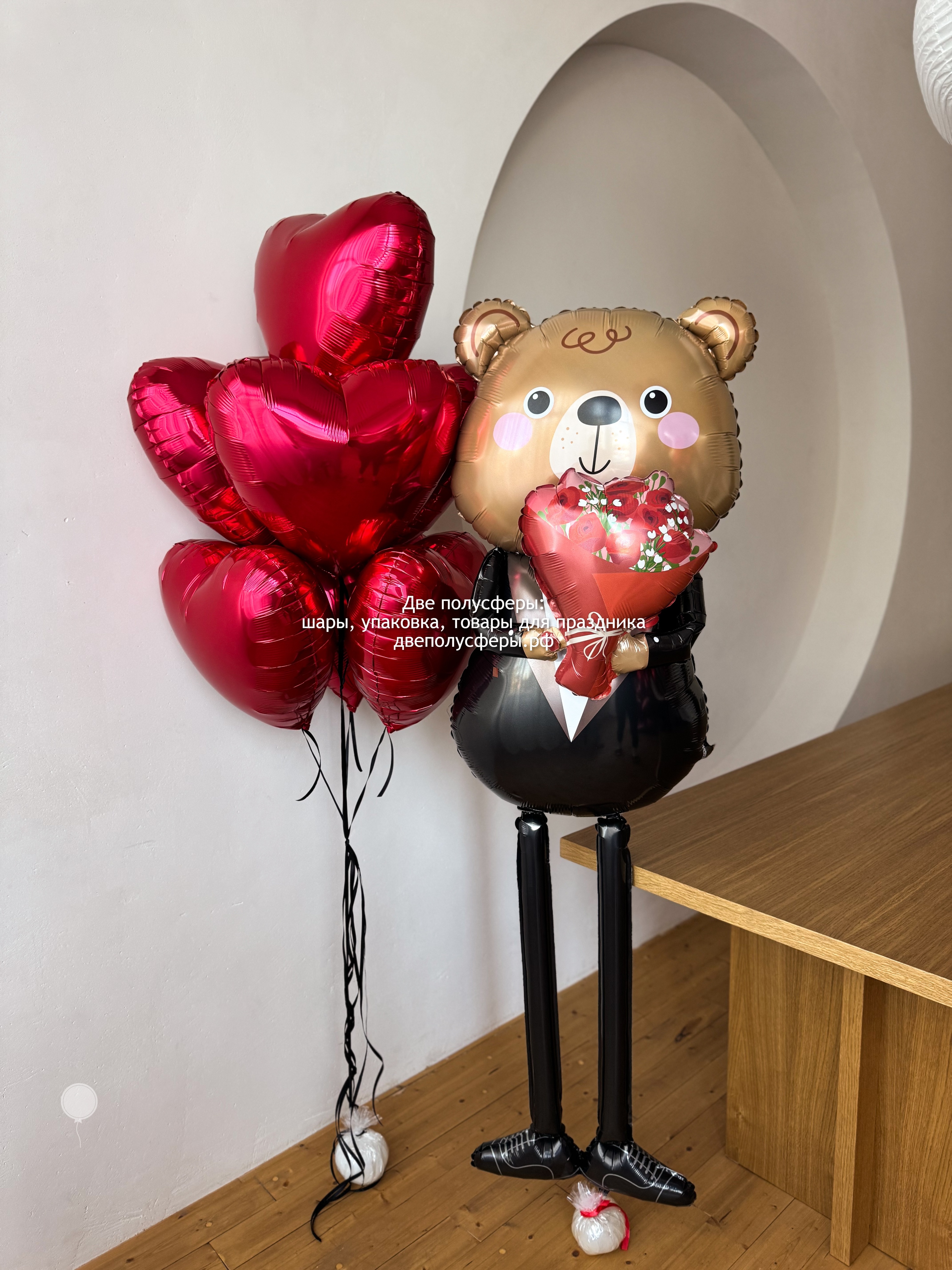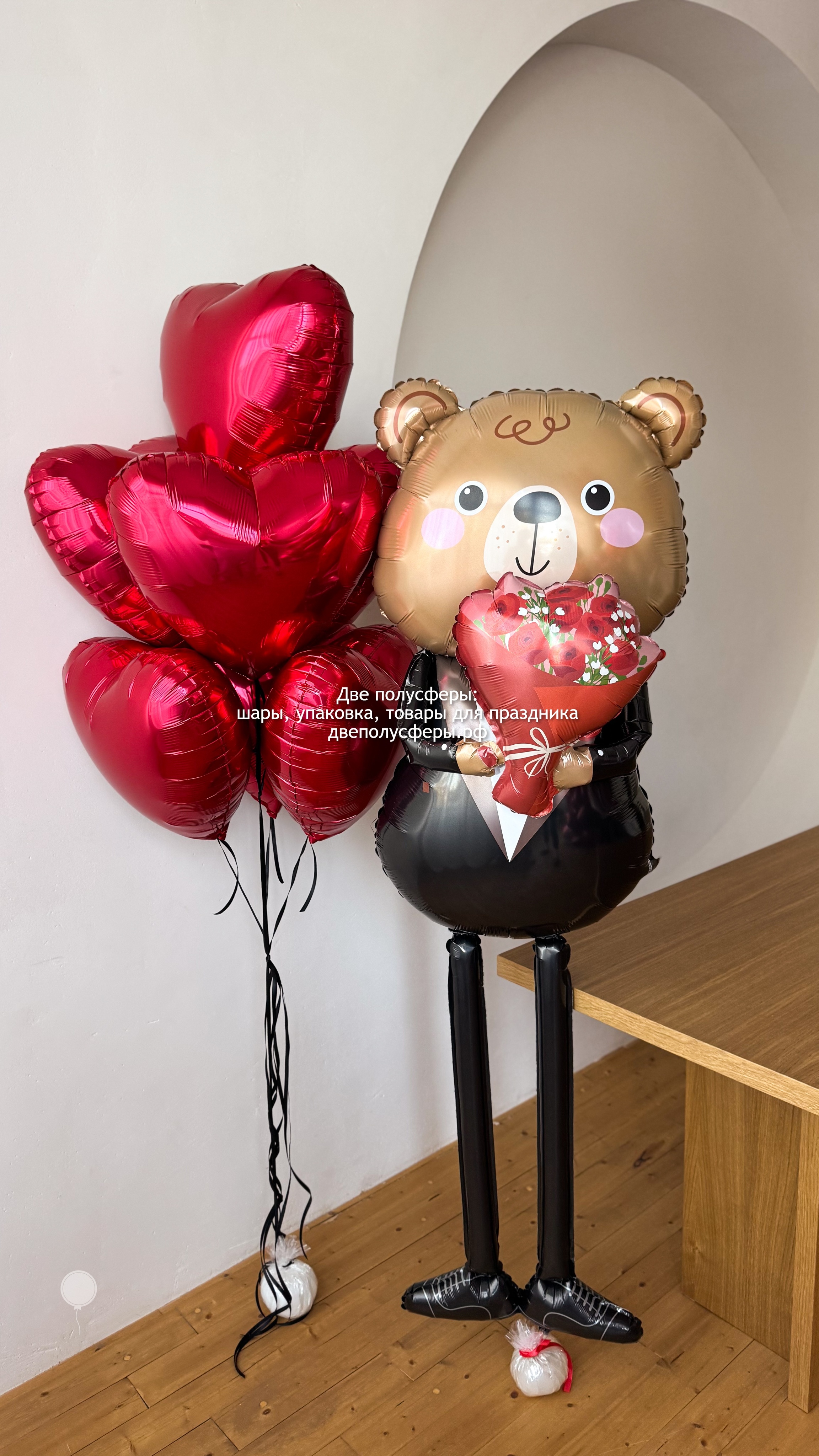 Большой мишка ходячий, надут гелием, фонтан из 7 сердец 45 см, грузик и пакет входят в стоимость