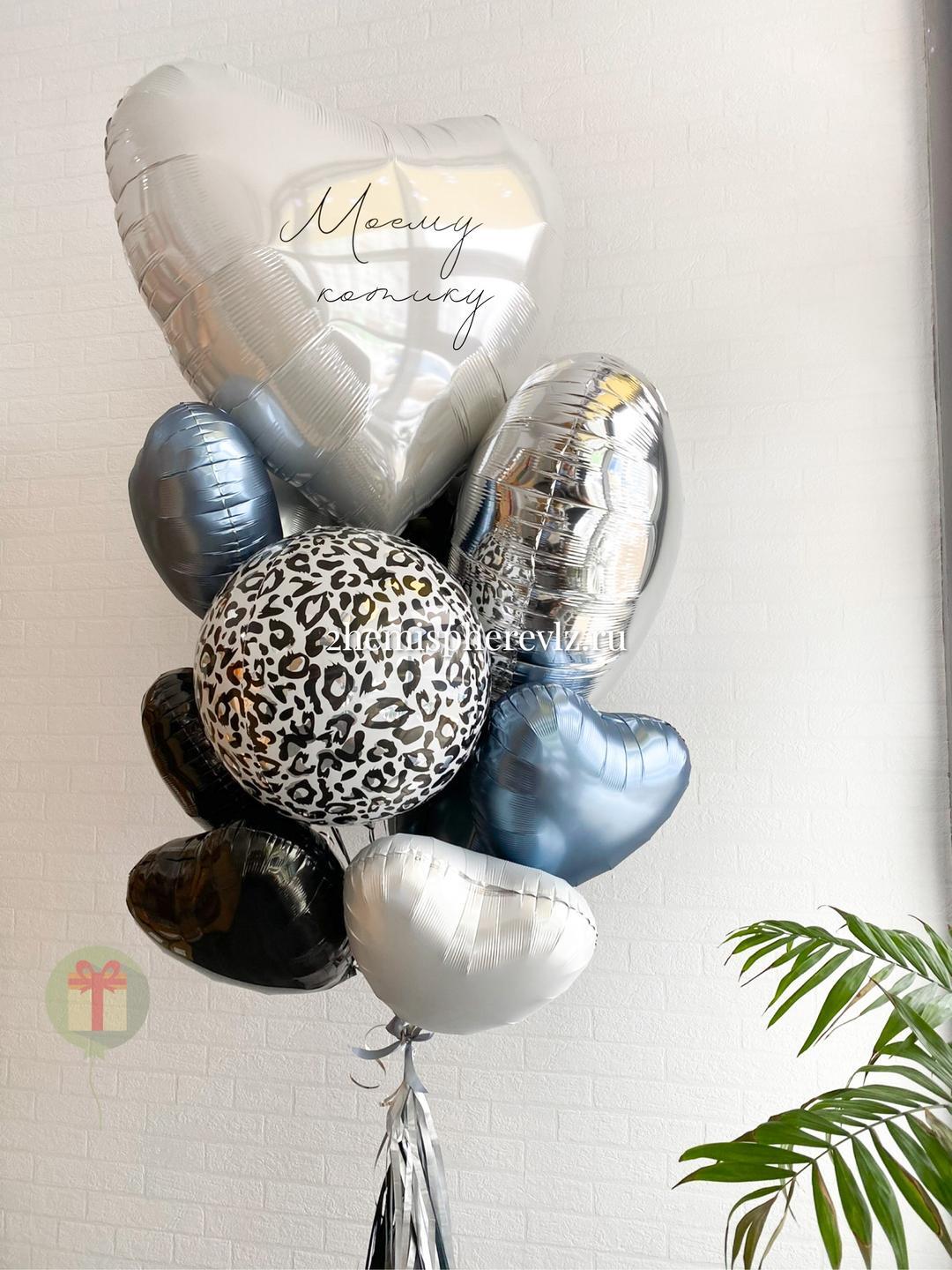 Состав набора: огромное 80 см фольгированное сердце с надписью, большое сердце 60 см, 7 фольгированных сердец 45 см, сфера леопард 50 см. Грузик и пакет включены в стоимость.