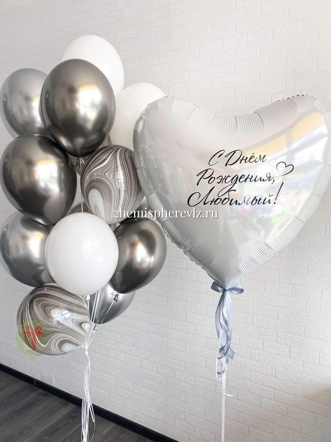 Набор с пышеым фонтаном из шаров хром 6 шт, пастель 4 шт и 4 шара агата, большим сердцем 60 см с надписью, грузики и пакеты входят в стоимость