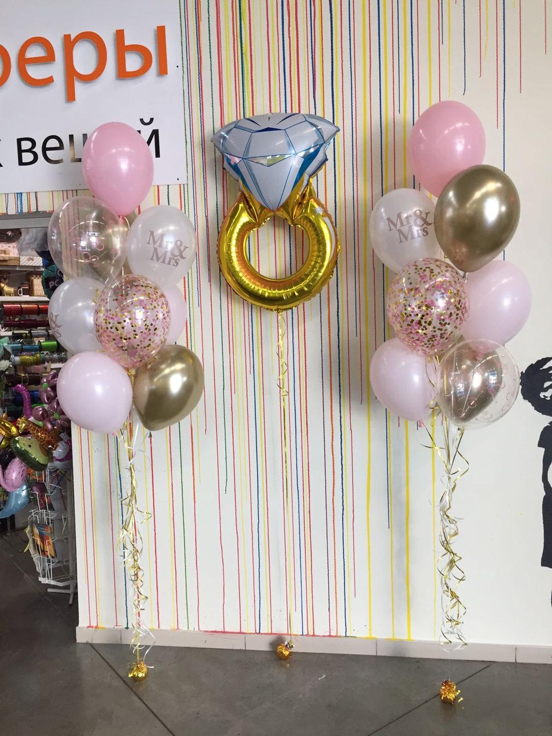 Набор на девичник с фигурным шаром из фольги кольцо на отдельном грузике, 2 фонтана из 10 латексных шаров разных фактур на грузиках ( 2 шара с конфетти 35 см, 2 шара хром 35 см, 3 шара с рисунком 35 см, 3 шара с рисунком 35 см), грузики, пакеты