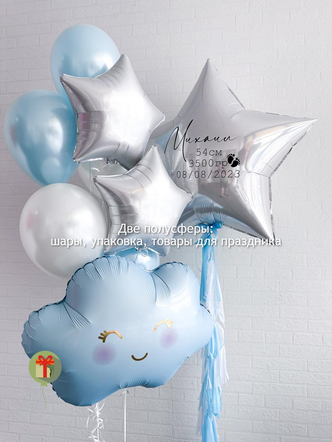 Фольгированная звезда 60 см с надписью, декорированная пышным хвостом, фигура облачка и фонтан из 7 шаров: 2 фольгированные звезды 45 см и 5 жемчужных шаров. Грузики и пакеты включены в стоимость.