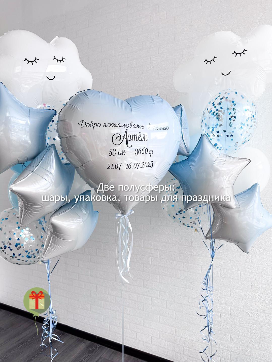 Большой и пышный набор в голубых оттенках. В составе: фольгированное сердце 60 см + надпись, 2 фонтана по 10 штук: фигура облачка, 3 фольгированные звезды 45 см, 2 шара с конфетти и 4 шара пастель. Грузики и пакеты включены в стоимость.