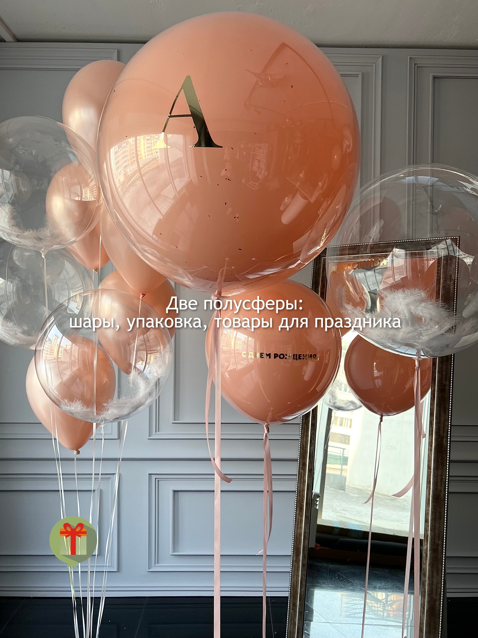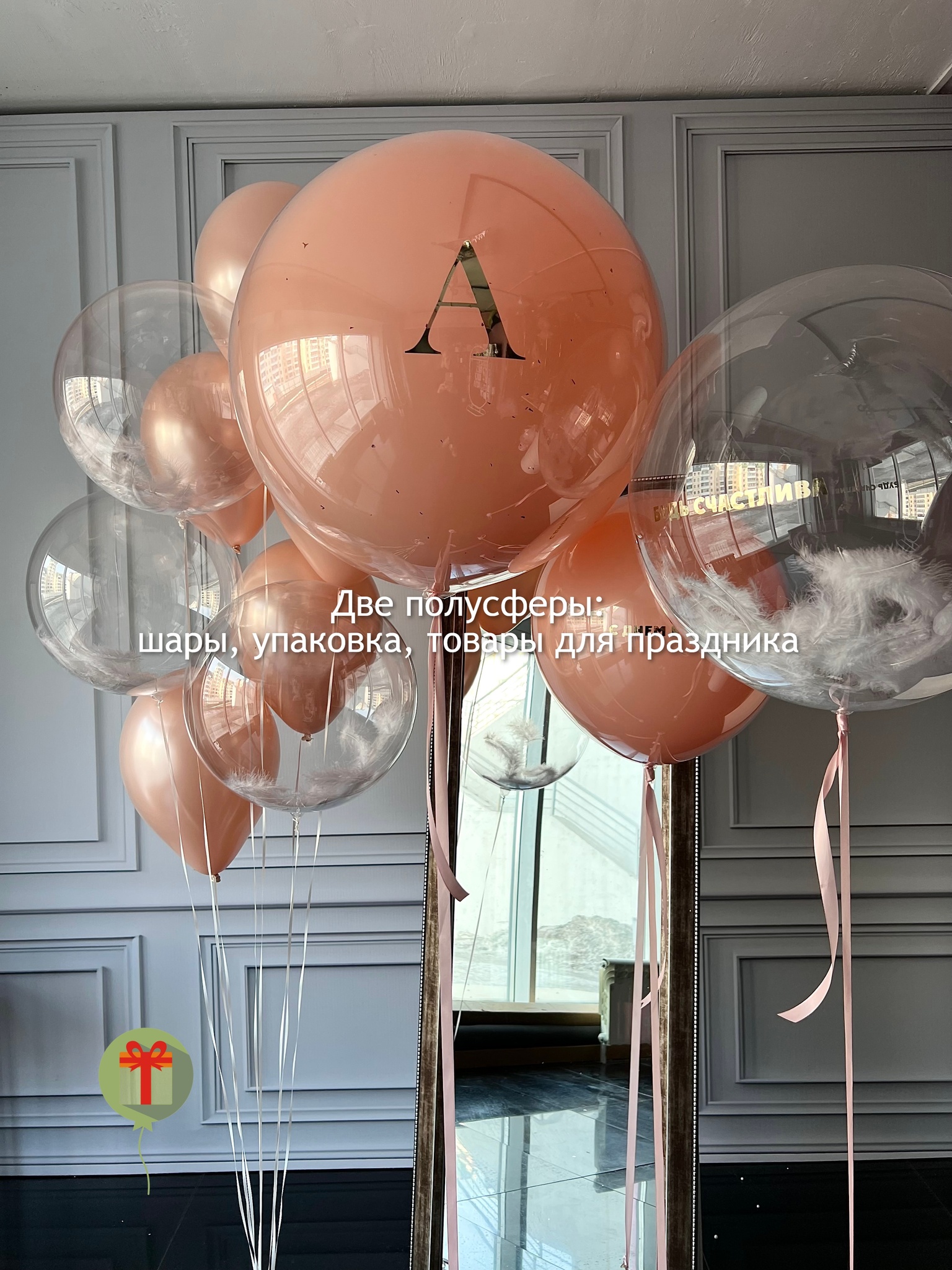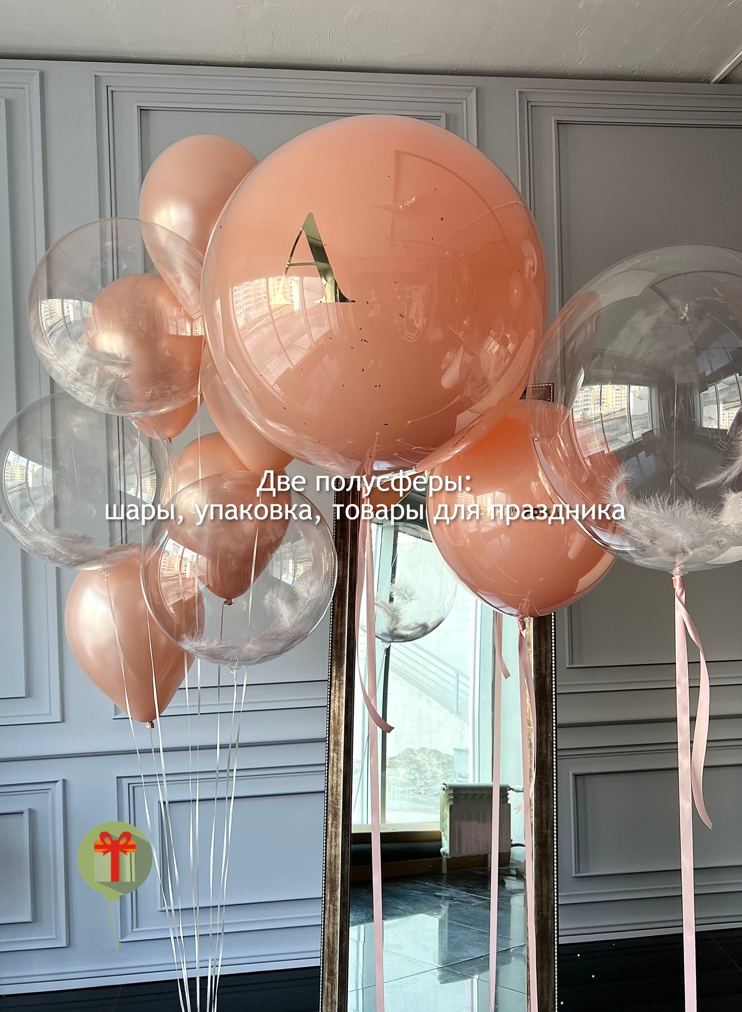 Нежный фонтан из 9 шаров: 3 сферы 45 см с перьями и 6 жемчужных шаров, сфера дабл 60 см с наклейкой, сфера дабл бабл 45 см с наклейкой и сфера 60 см с перьями. Грузики и пакеты включены в стоимость.
