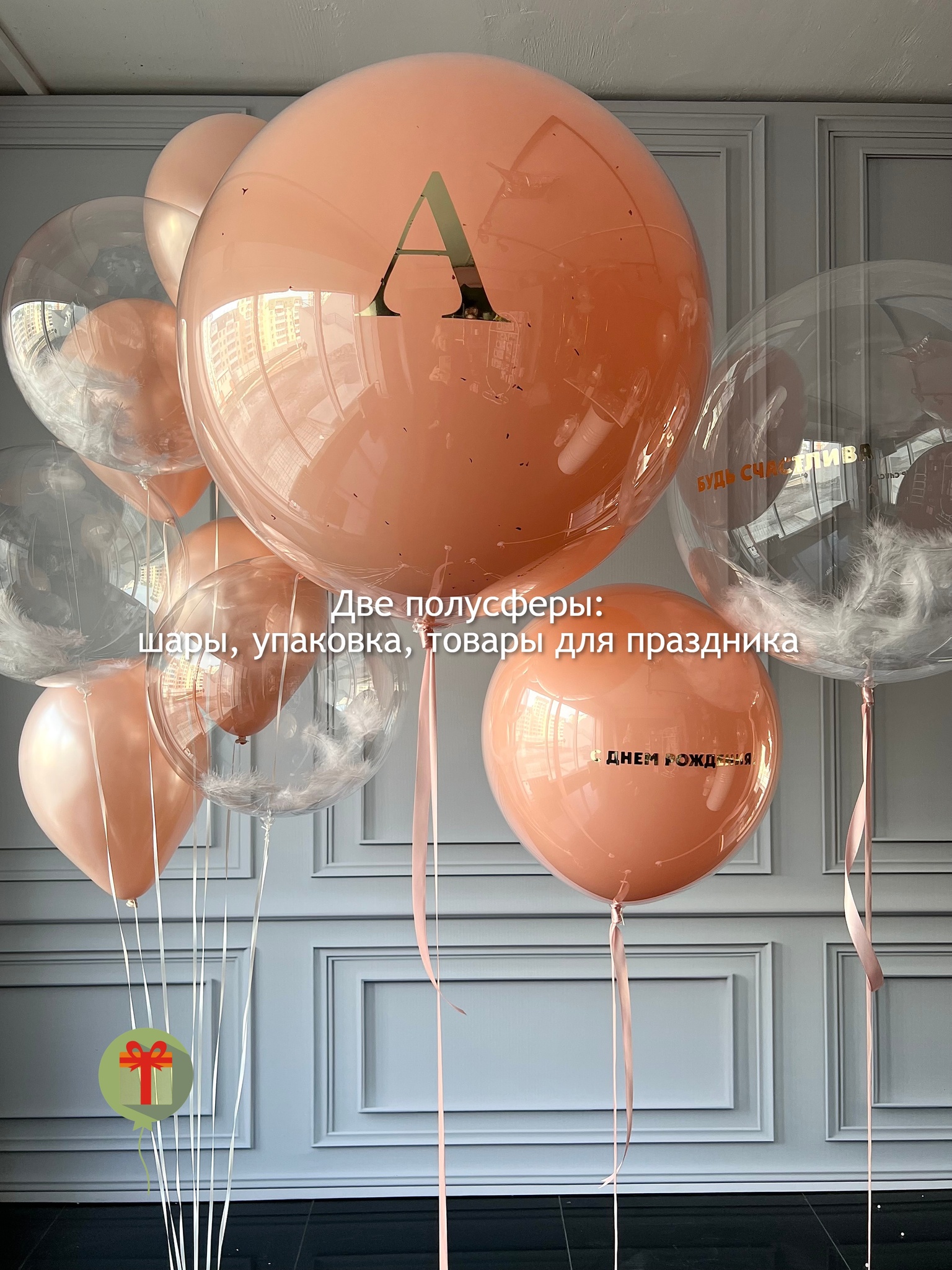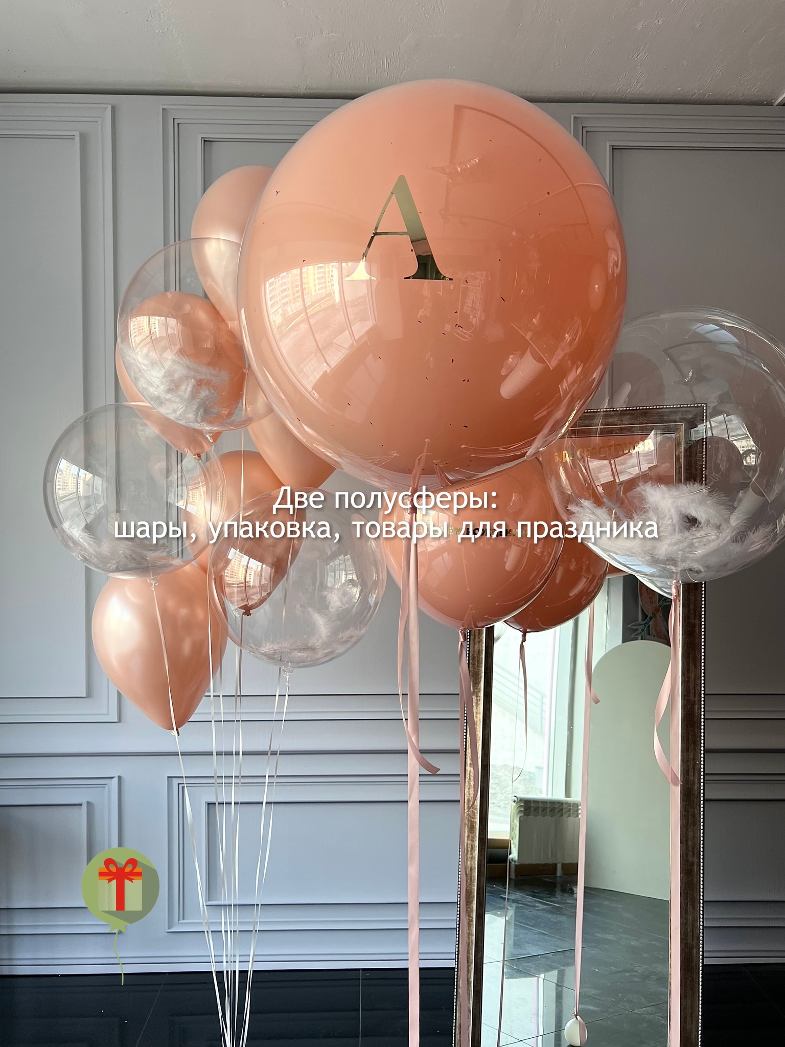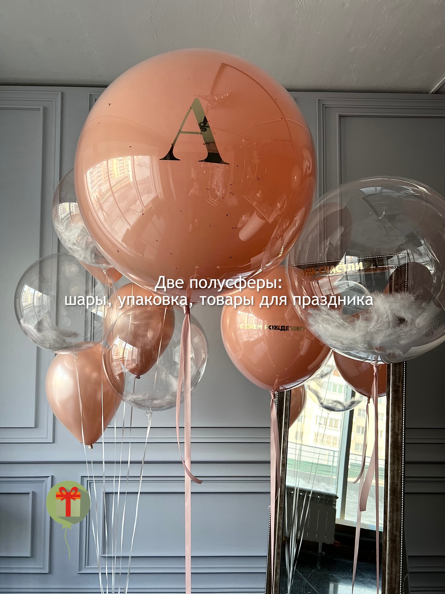 Нежный фонтан из 9 шаров: 3 сферы 45 см с перьями и 6 жемчужных шаров, сфера дабл 60 см с наклейкой, сфера дабл бабл 45 см с наклейкой и сфера 60 см с перьями. Грузики и пакеты включены в стоимость.