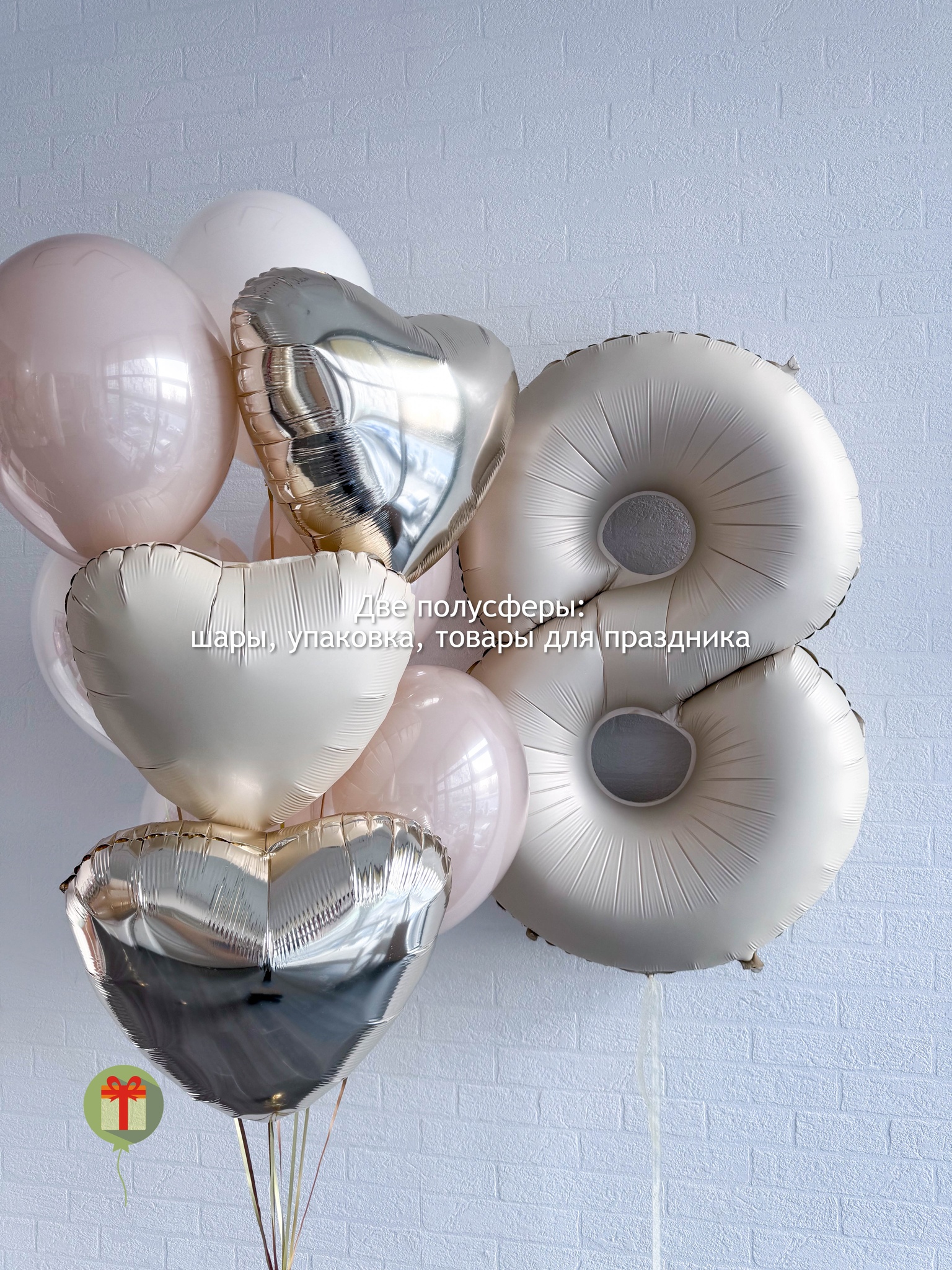 Нежный набор в нюдовых тонах с большой цифрой 102 см и фонтаном из 10 шаров шаров, 3 фольгированных сердца, 7 шаров пастель, грузик и пакет входят в стоимость.