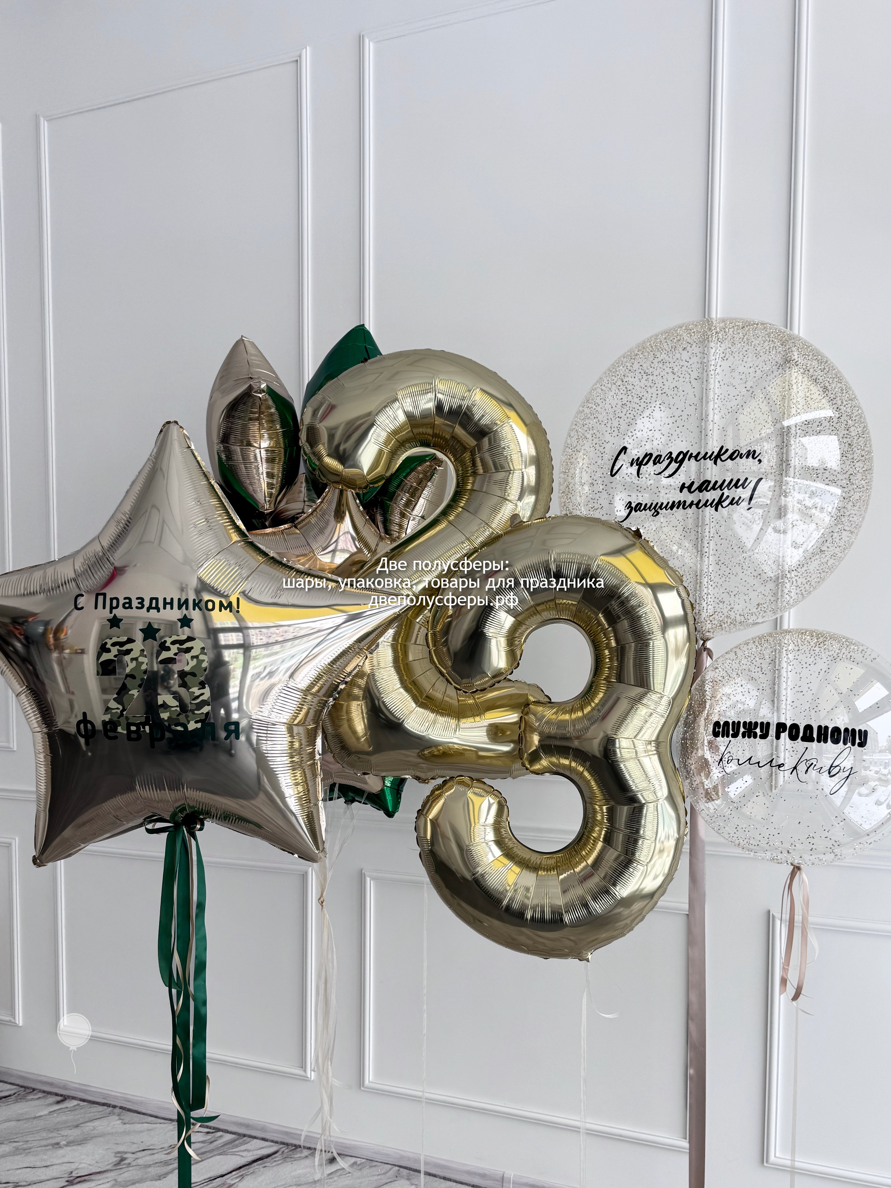 Сфера 60 см с надписью и конфетти, 2 фольгированные цифры 102 см, фонтан из 10 фольгированных звезд 45 см, большая фольгированная звезда 90 см с надписью, грузики и пакеты входят в стоимость
