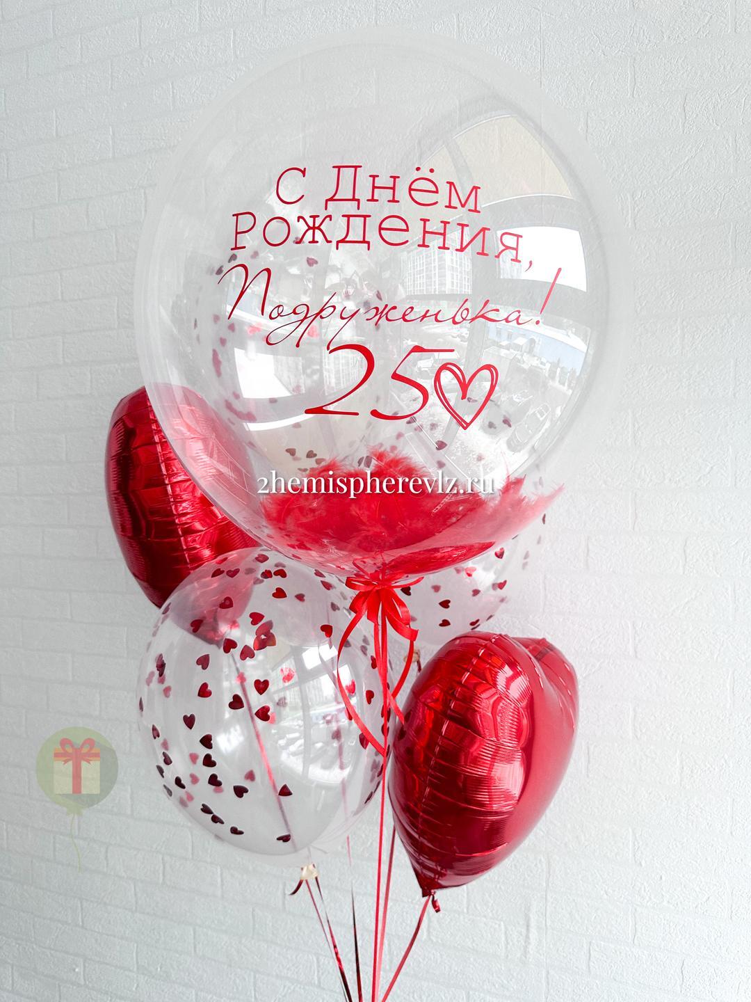 Стильный фонтан из 6 шаров. В составе: сфера с перьями внутри+ надпись, 2 фольгированных сердца, 3 шара с конфетти. Грузик и пакет включены в стоимость.