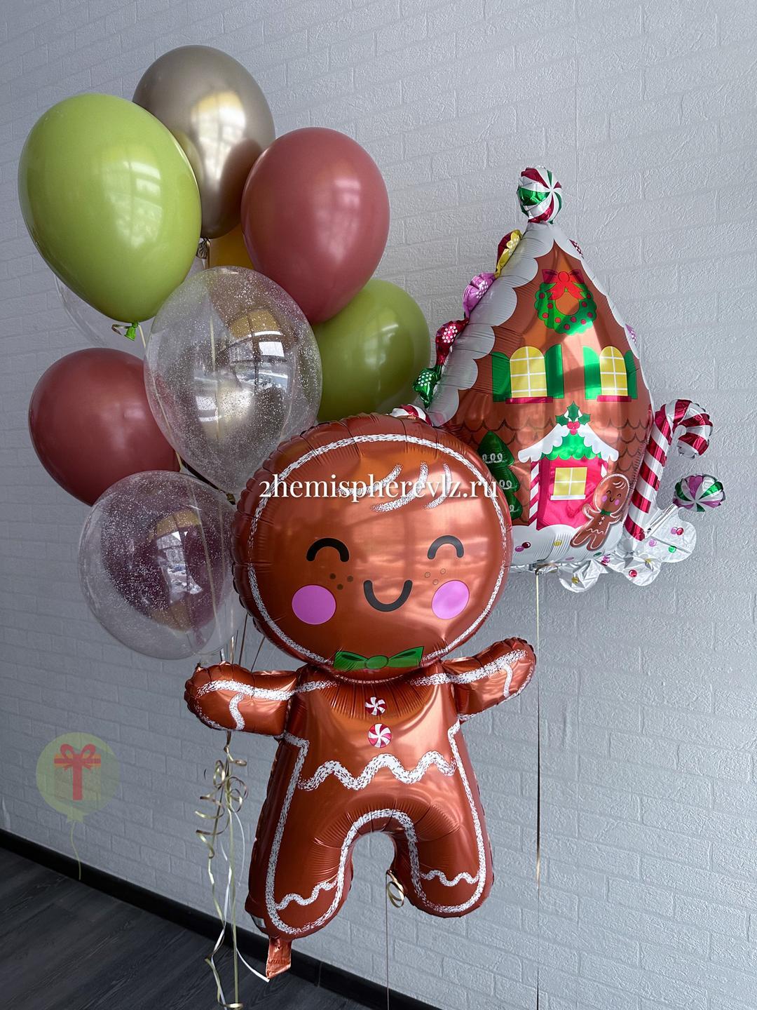 Пряник, пряничный домик, фонтан из латексных шаров, 3 шара с конфетти, 2 шара хром, 5 шаров пастель, грузики, пакеты входят в стоимость