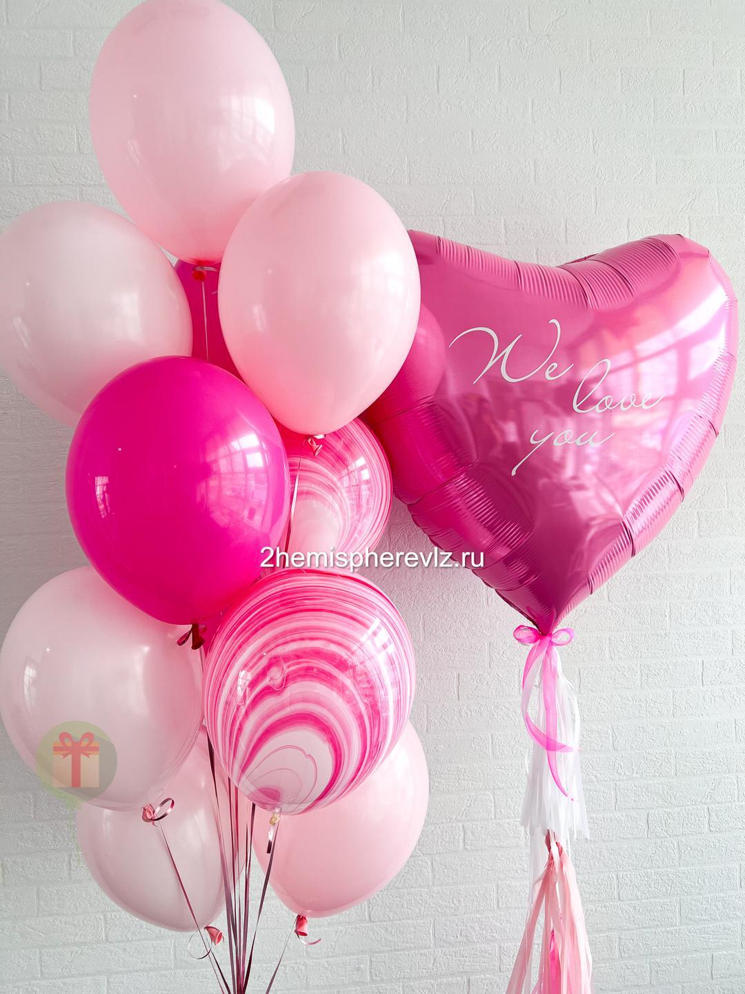 Нежный набор в розовых оттенках для девушки. В составе: фольгированное сердце 60 см с надписью и фонтан из 10 шаров: 3 шара агат и 7 шаров пастель. Грузики и пакеты включены в стоимость.
