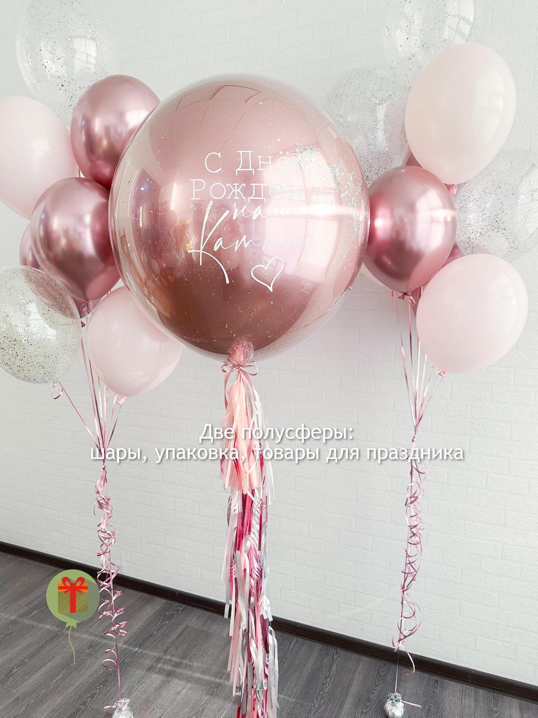 Большой шар дабл бабл 60 см с пушистым хвостом и надписью, 2 фонтана по 3 шара пастель, 3 шара хром и 3 шара с конфетти 35 см, грузики, пакеты. Грузики и пакеты включены в стоимость.