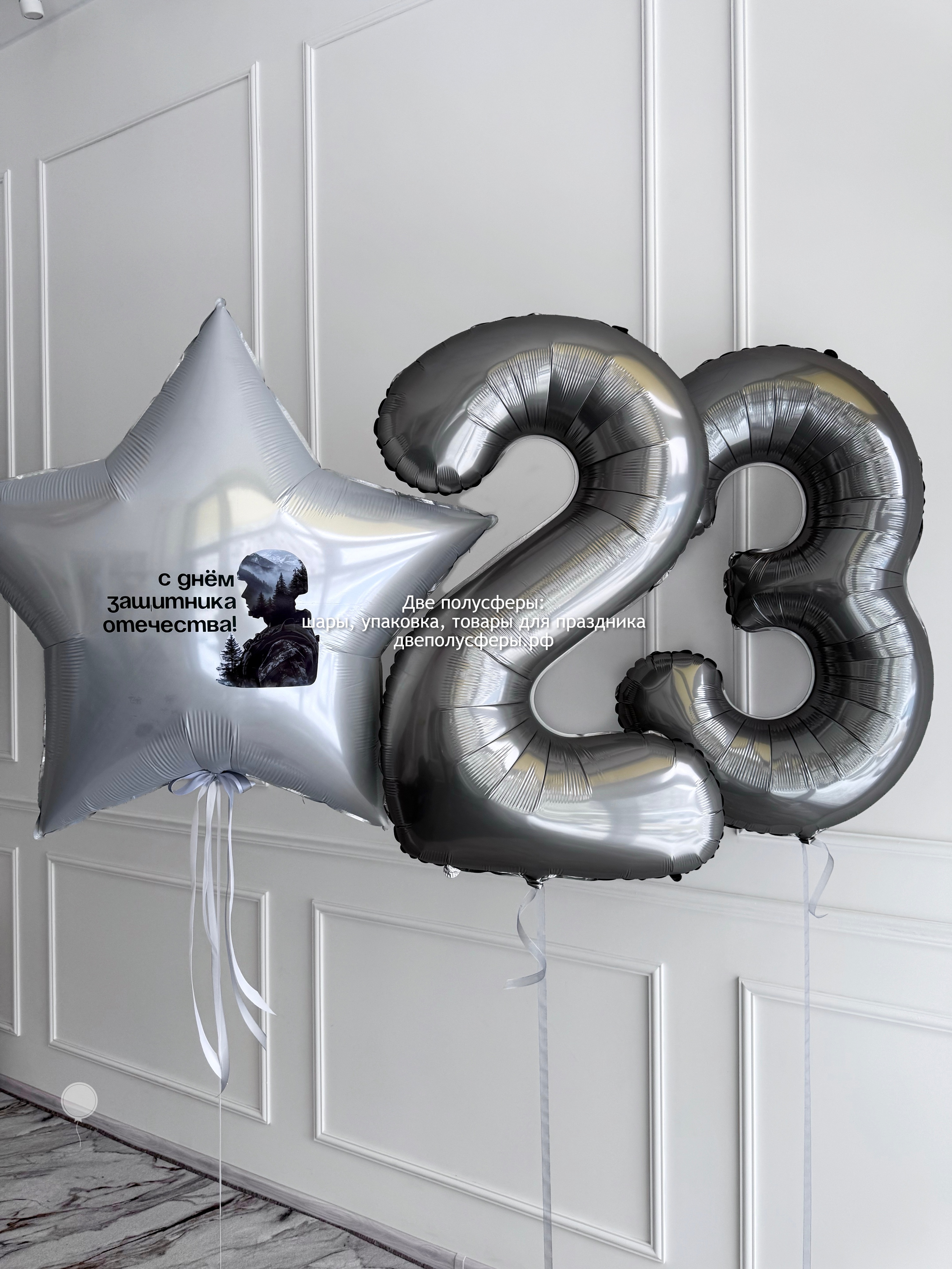 Большая звезда 90 см с надписью, цифры фольгированные 23, размером 102 см, грузики и пакеты входят в стоимость