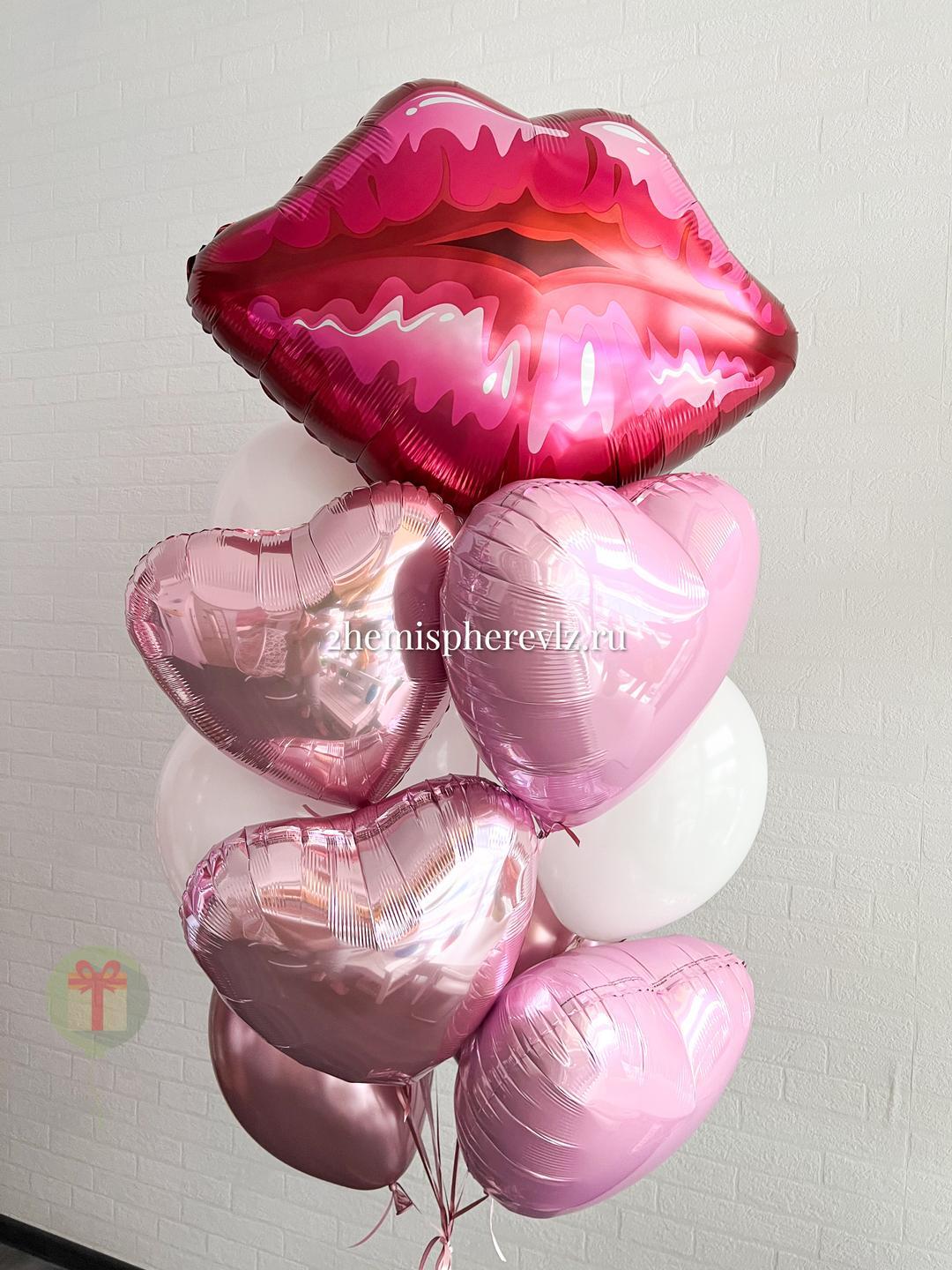 Сочный фонтан из 11 шаров: губы из фольги, 4 фольгированных шара 45 см, 2 шара хром, 4 шара пастель, грузик, пакет