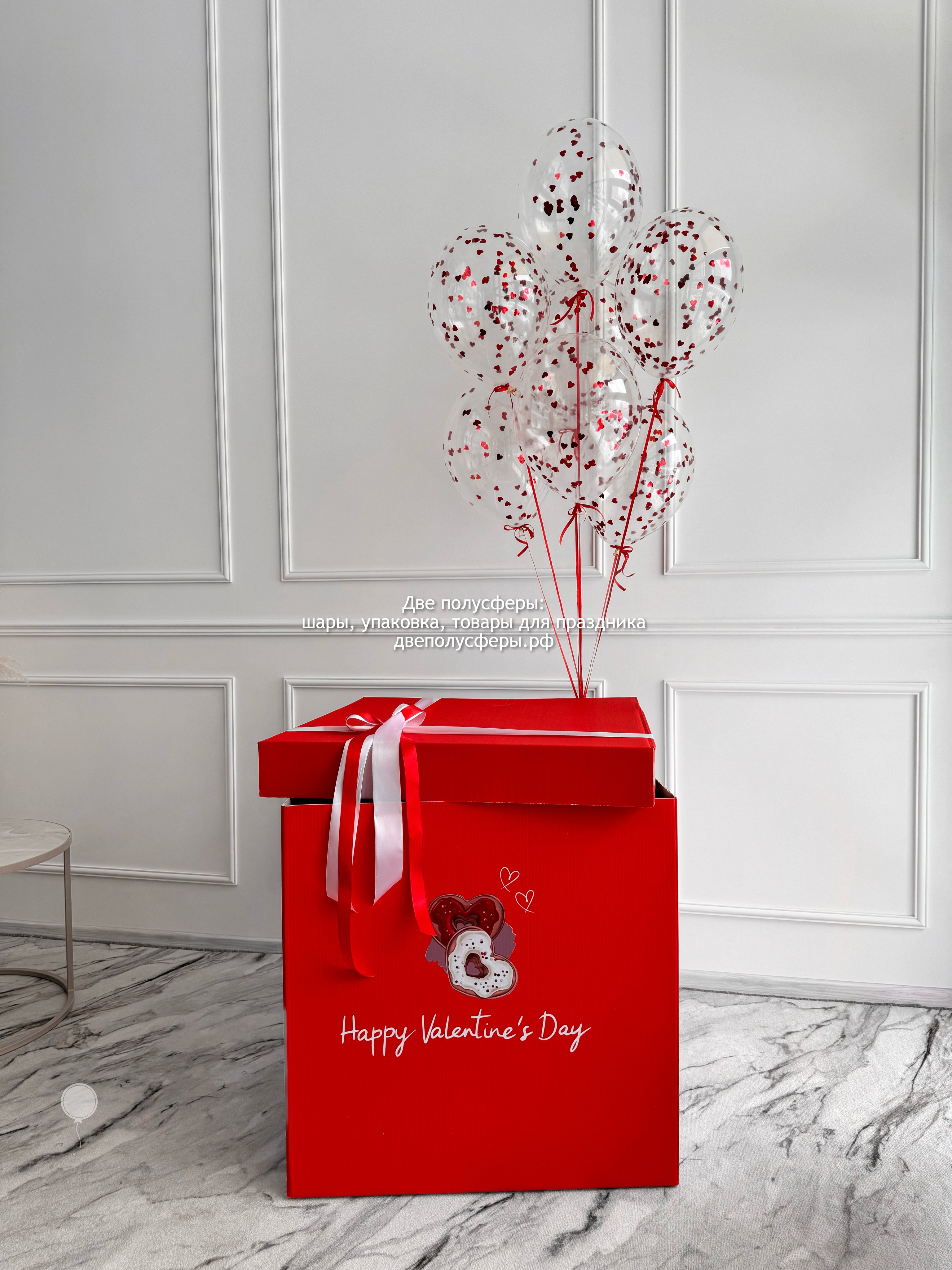 Коробка 60*60*60 см с картинкой пончиков и надписью, 7 шаров с конфетти сердечками, грузик и пакет для перевозки