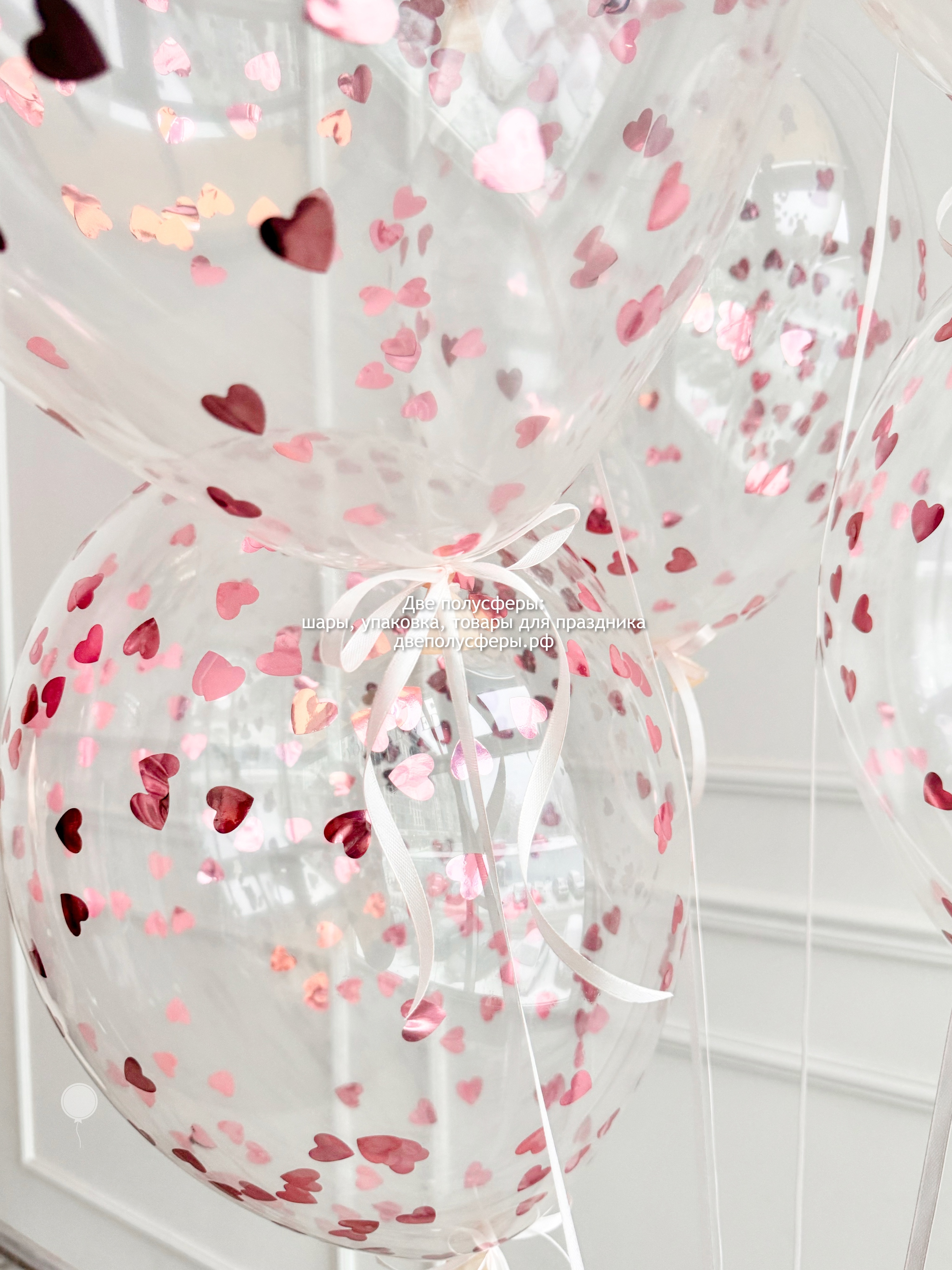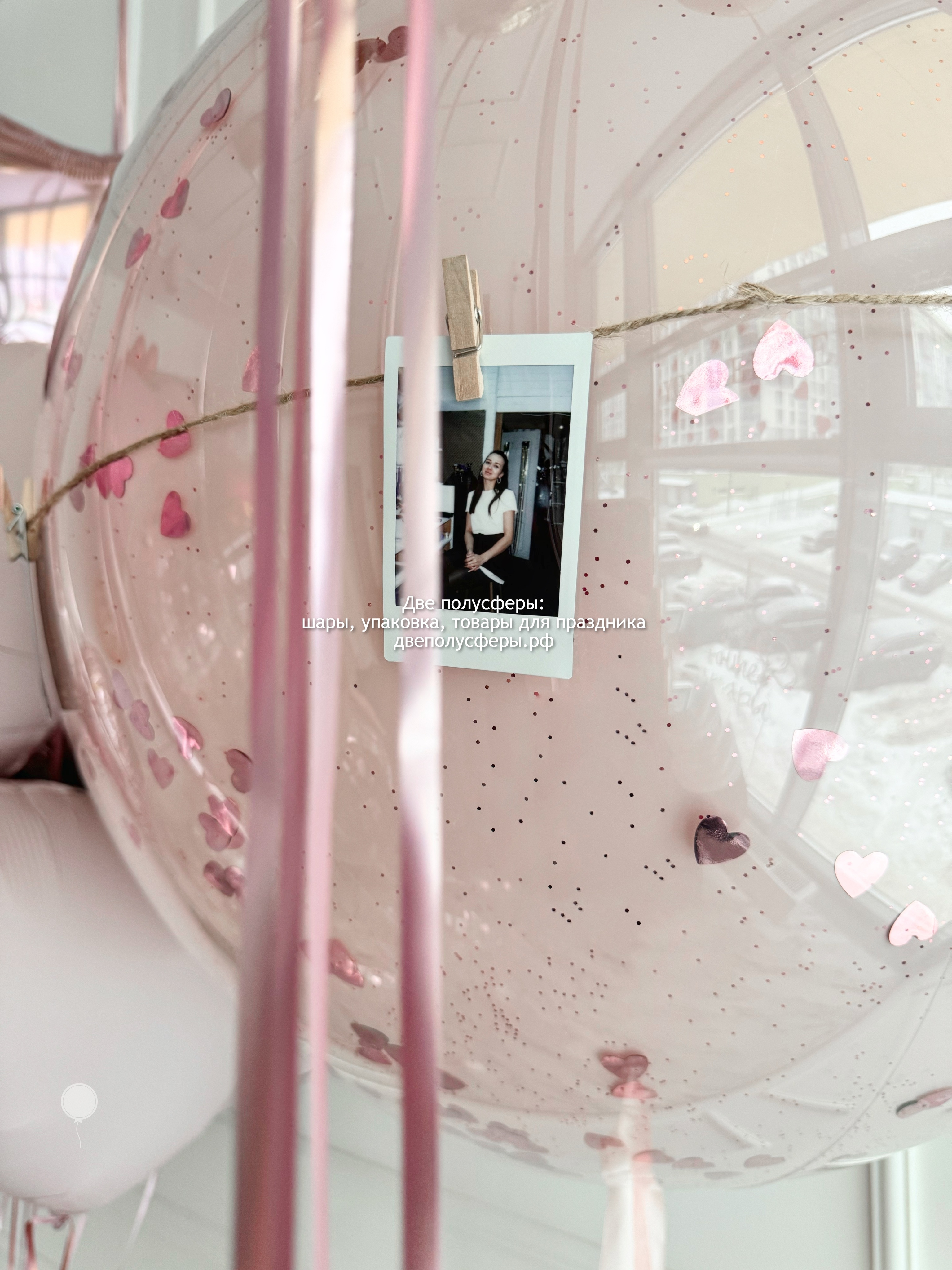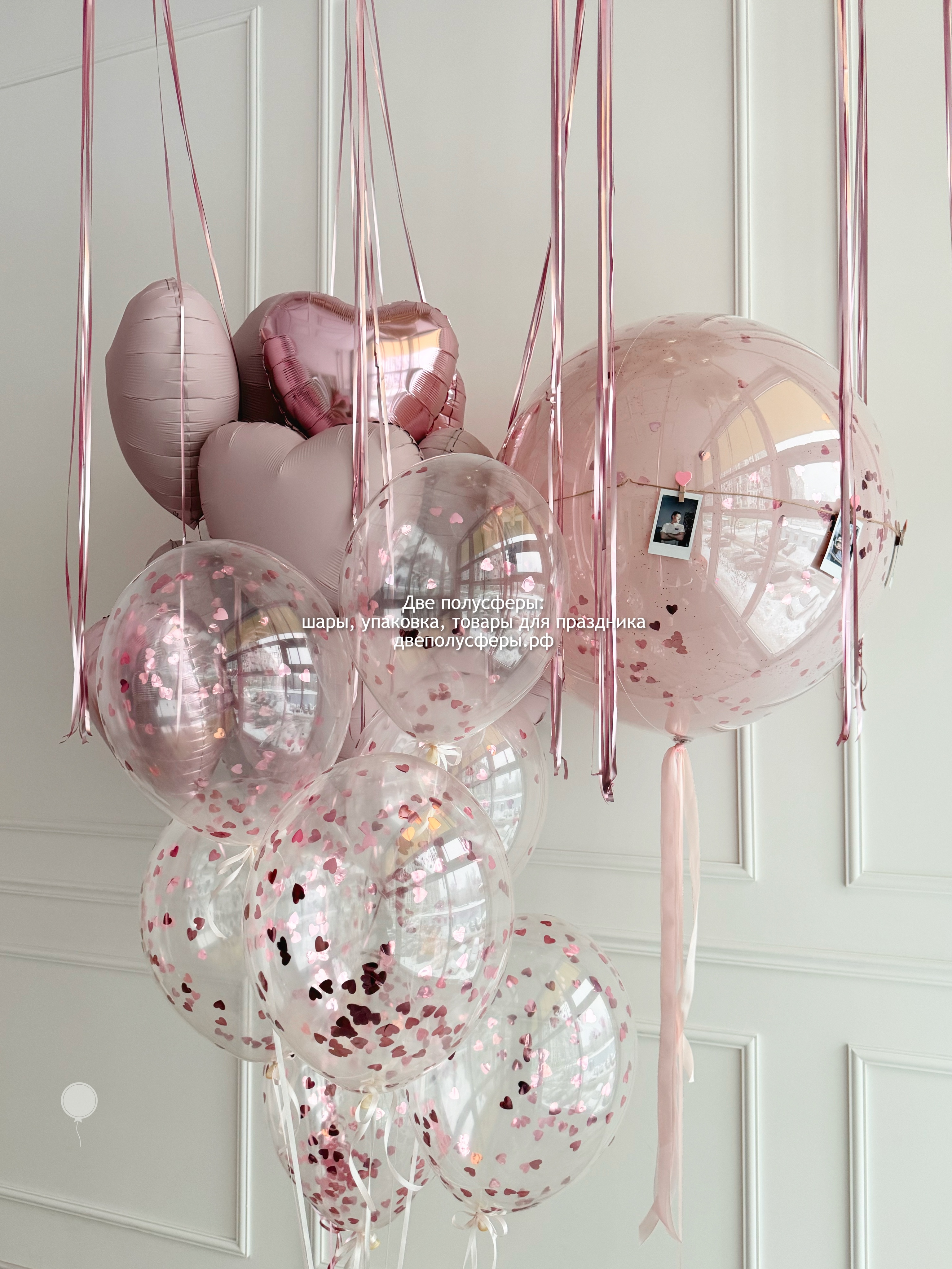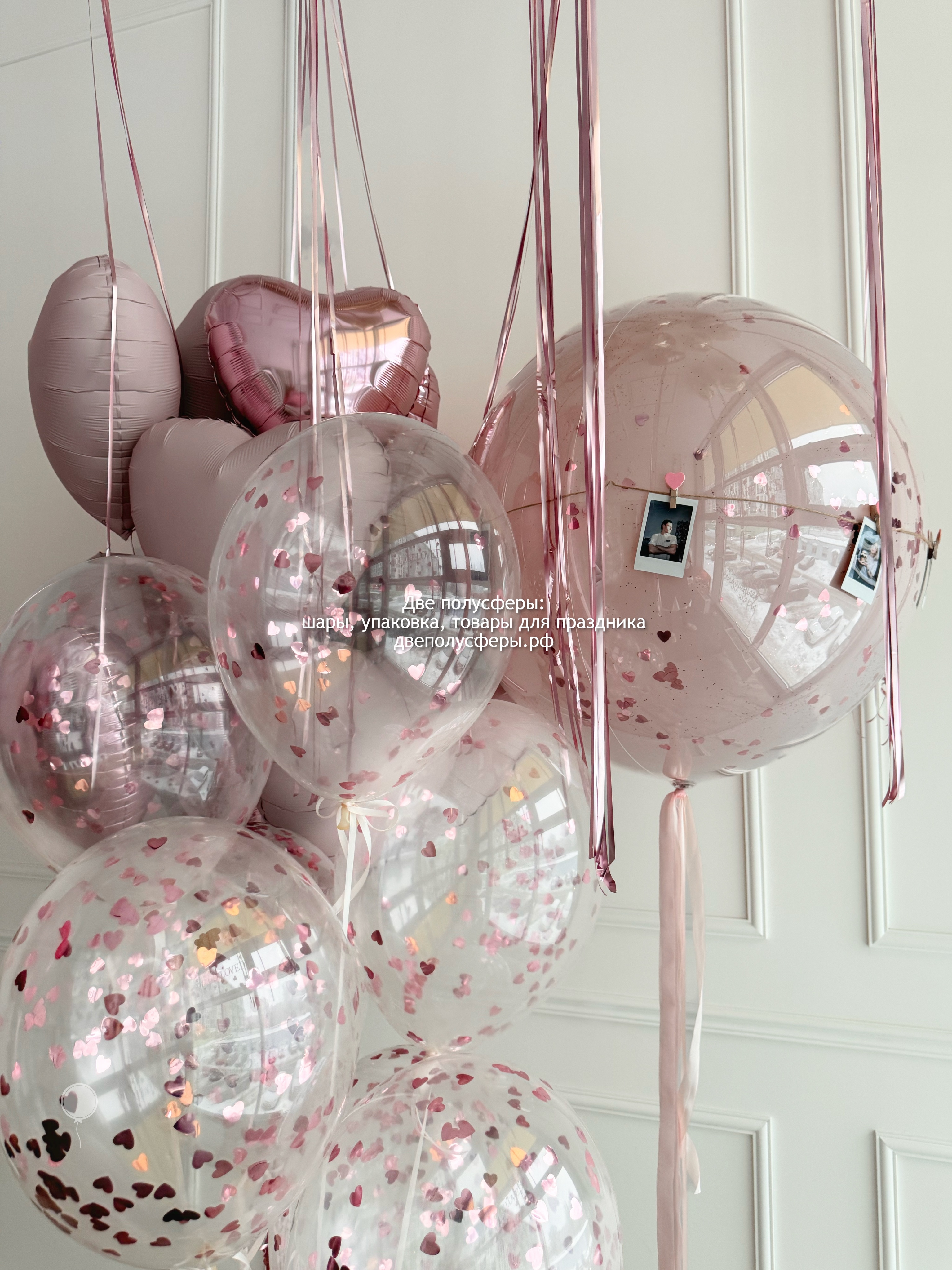 Стеклянный шар 60 см с надписью и прищепками с фотографиями, фонтан из 7 прозрачных шаров с конфетти и фонтан из 10 сердец 45 см, грузики и пакеты входят в стоимость