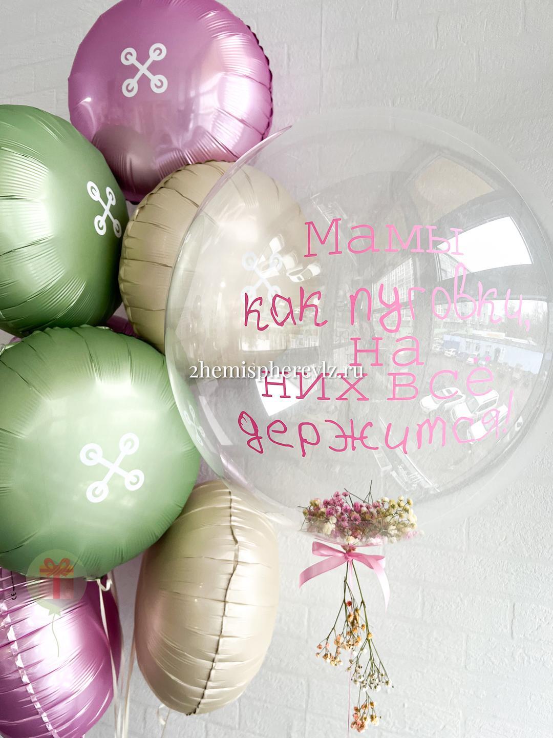 Набор с пуговками Мамы как пуговки: 7 пуговок из фольги 45 см и прозрачная сфера 60 см с надписью и гипсофилой для мамы. Грузики и пакеты включены в стоимость