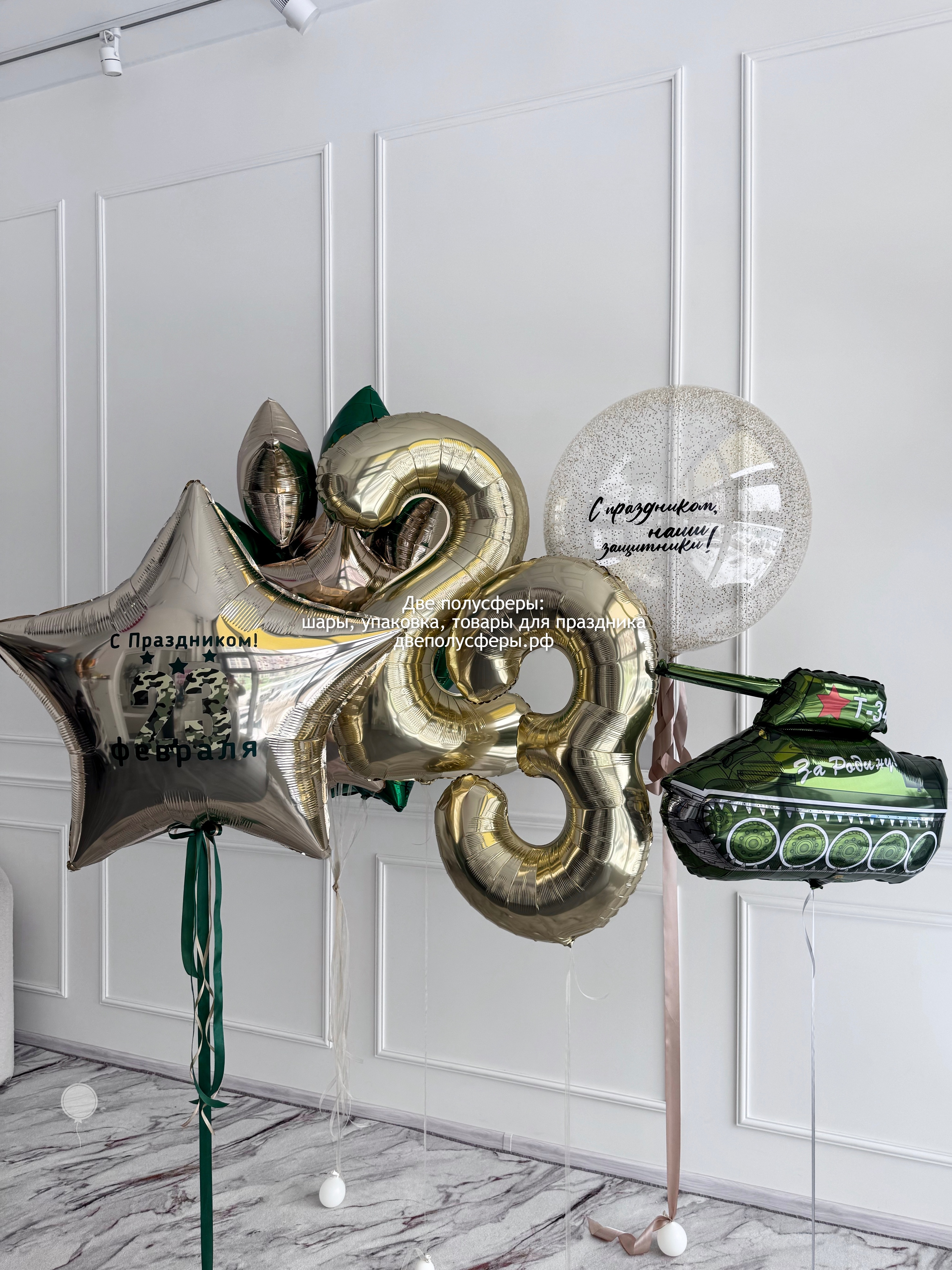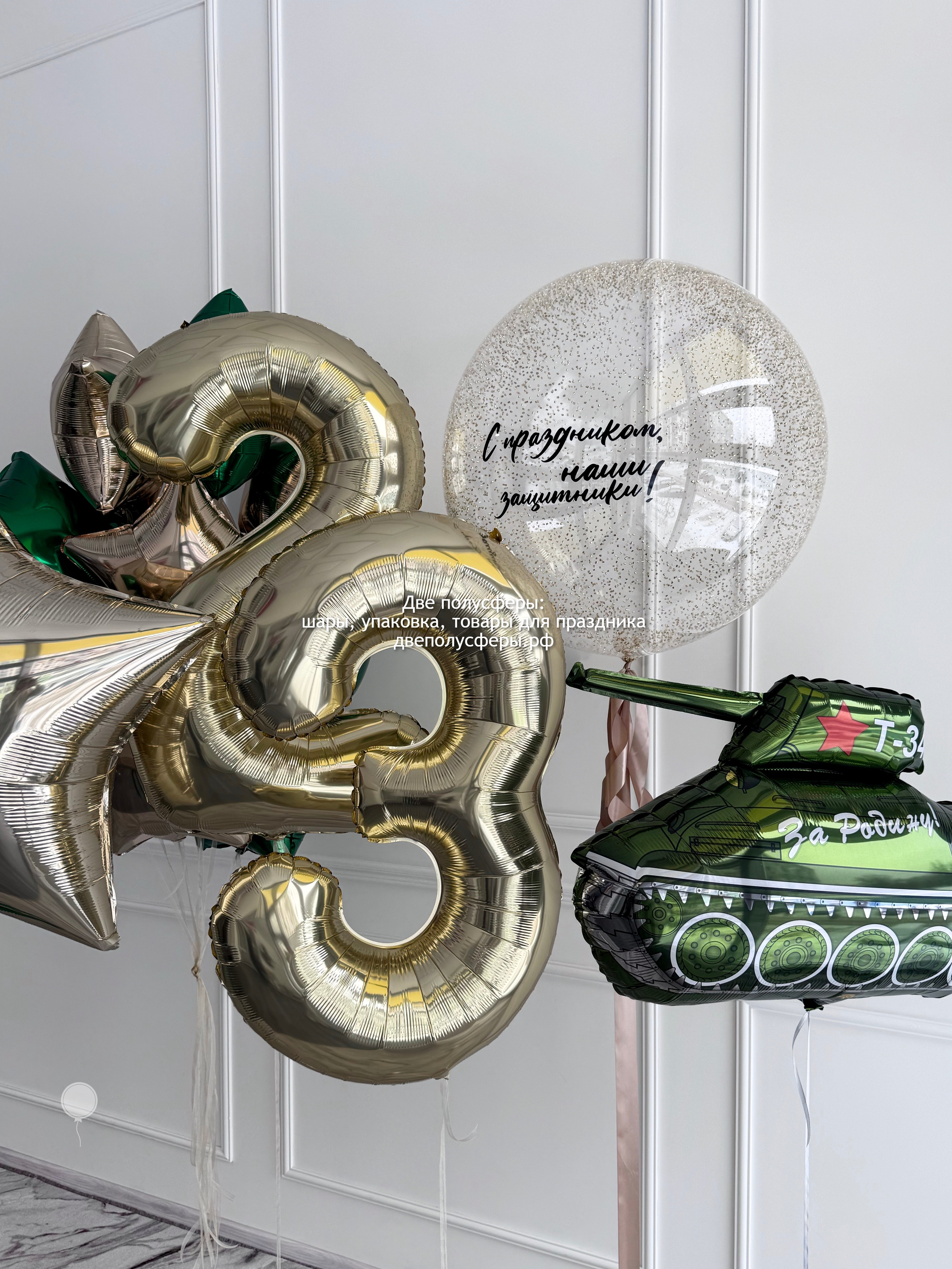 Фольгированные цифры 102 см 2 шт, фонтан из 10 фольгированных звезд 45 см, фольгированный танк, сфера 60 см с конфетти и надписью, большая звезда 90 см с надписью, грузики и пакеты входят в стоимость
