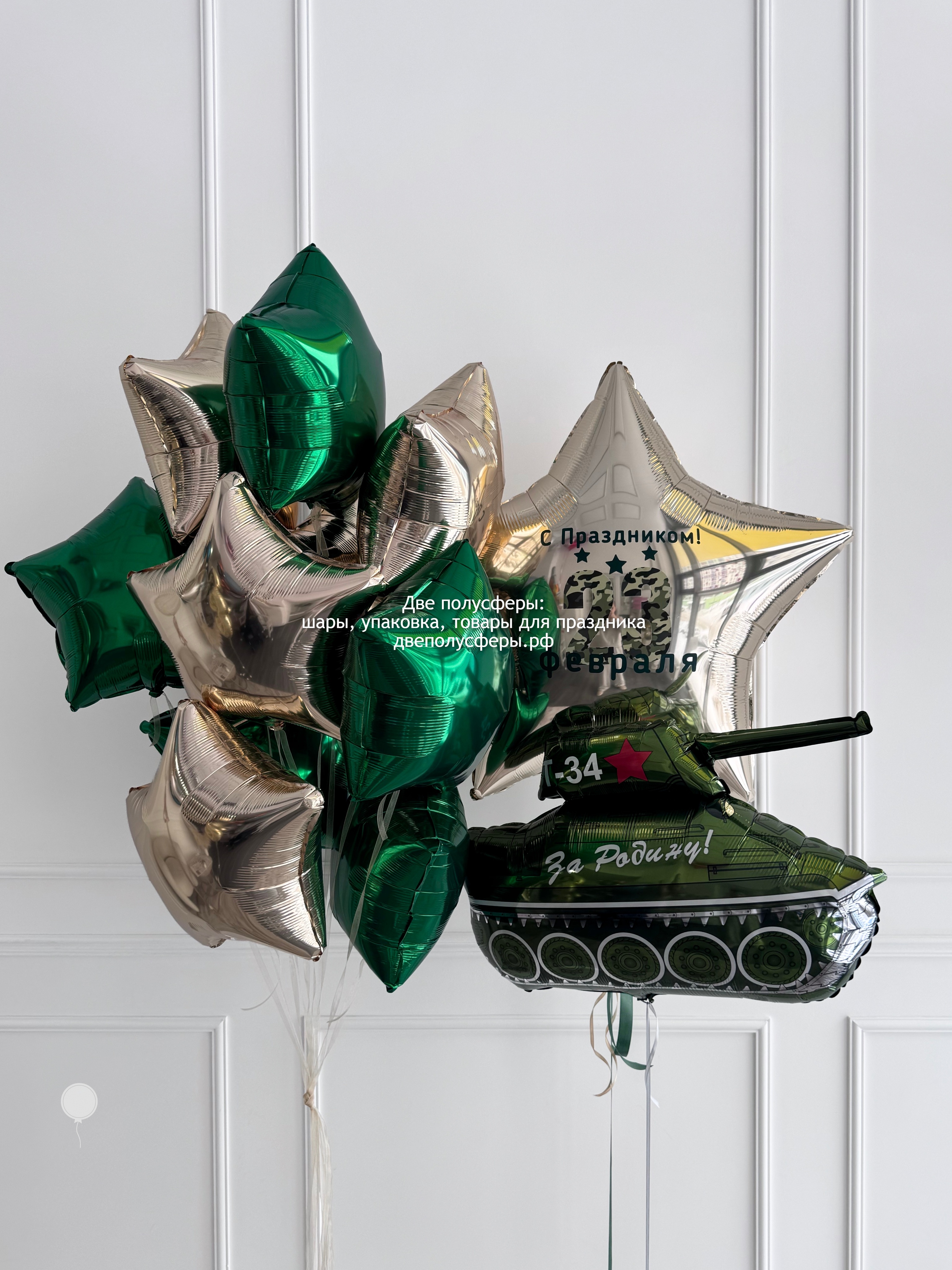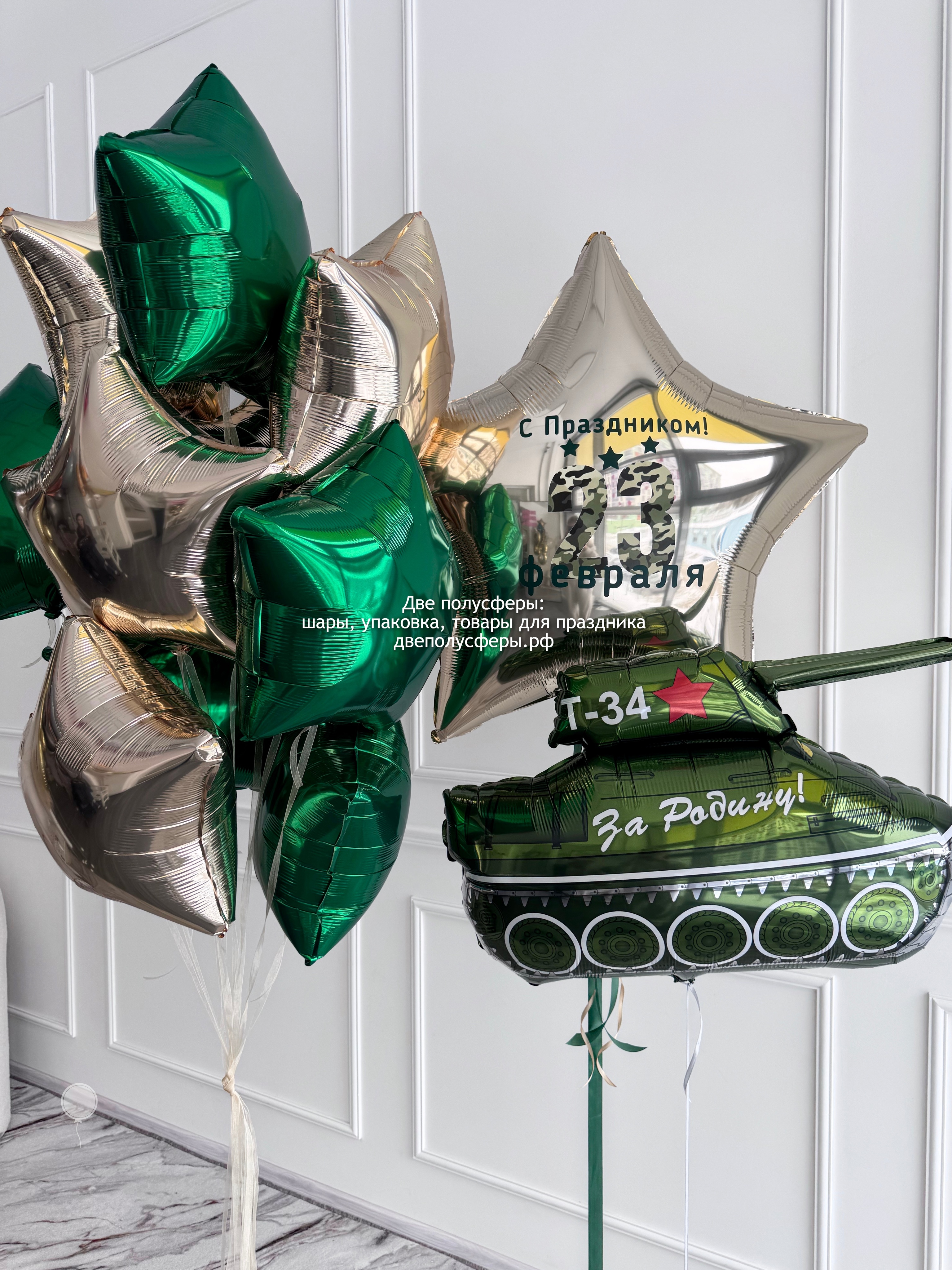 Фонан из 10 фольгированных звезд 45 см, танк фольгированный, большая звезда 90 см с надписью. Грузики и пакеты входят в стоимость