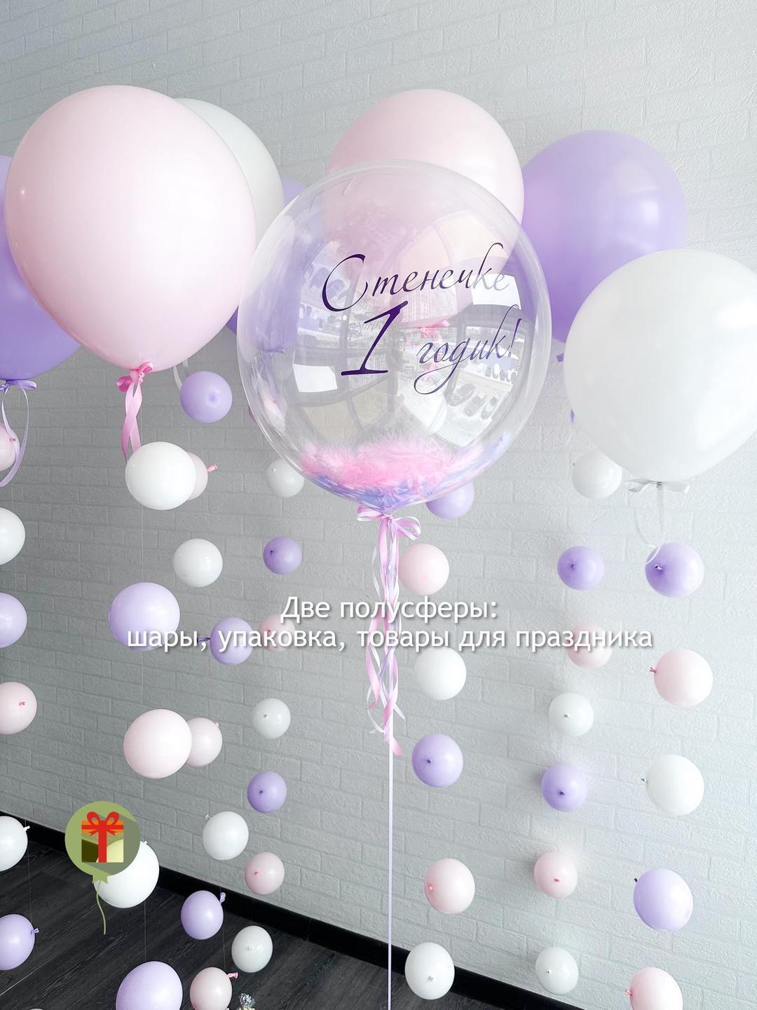 7 цепочек с шаром пастель 45 см, бабл с перьями 60 см и индивидуальной надписью. Грузики и пакеты включены в стоимость.