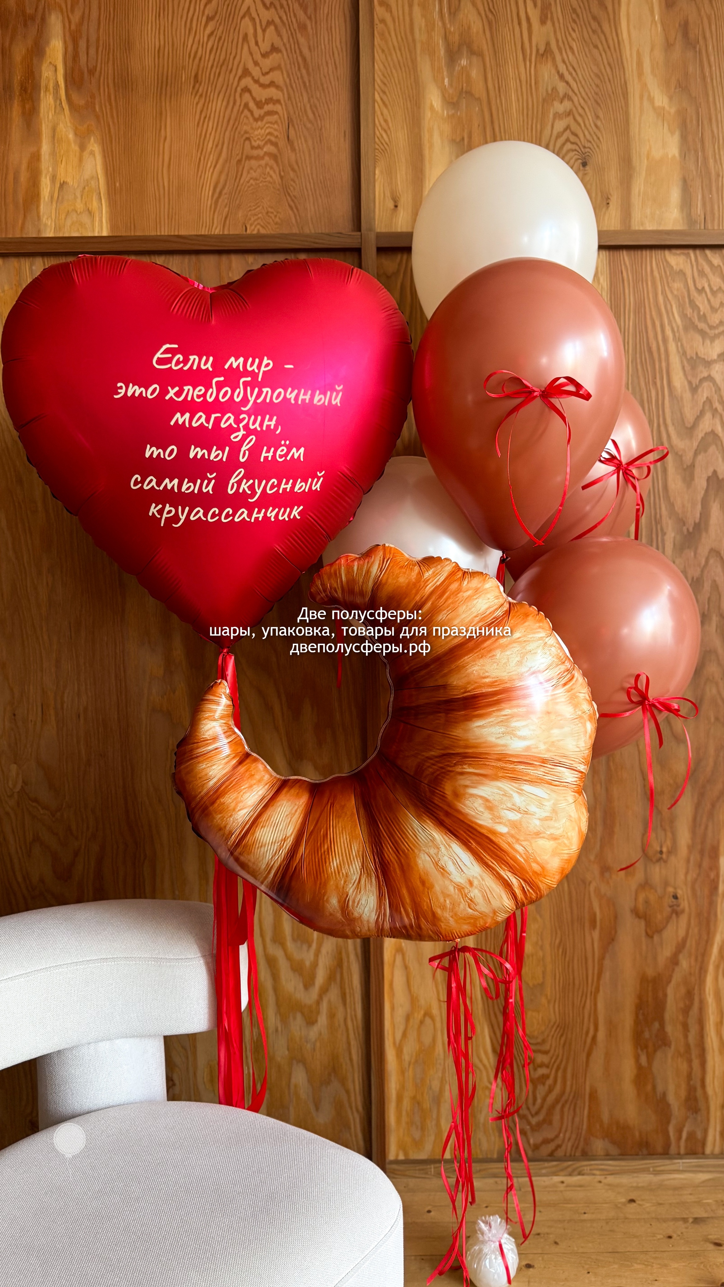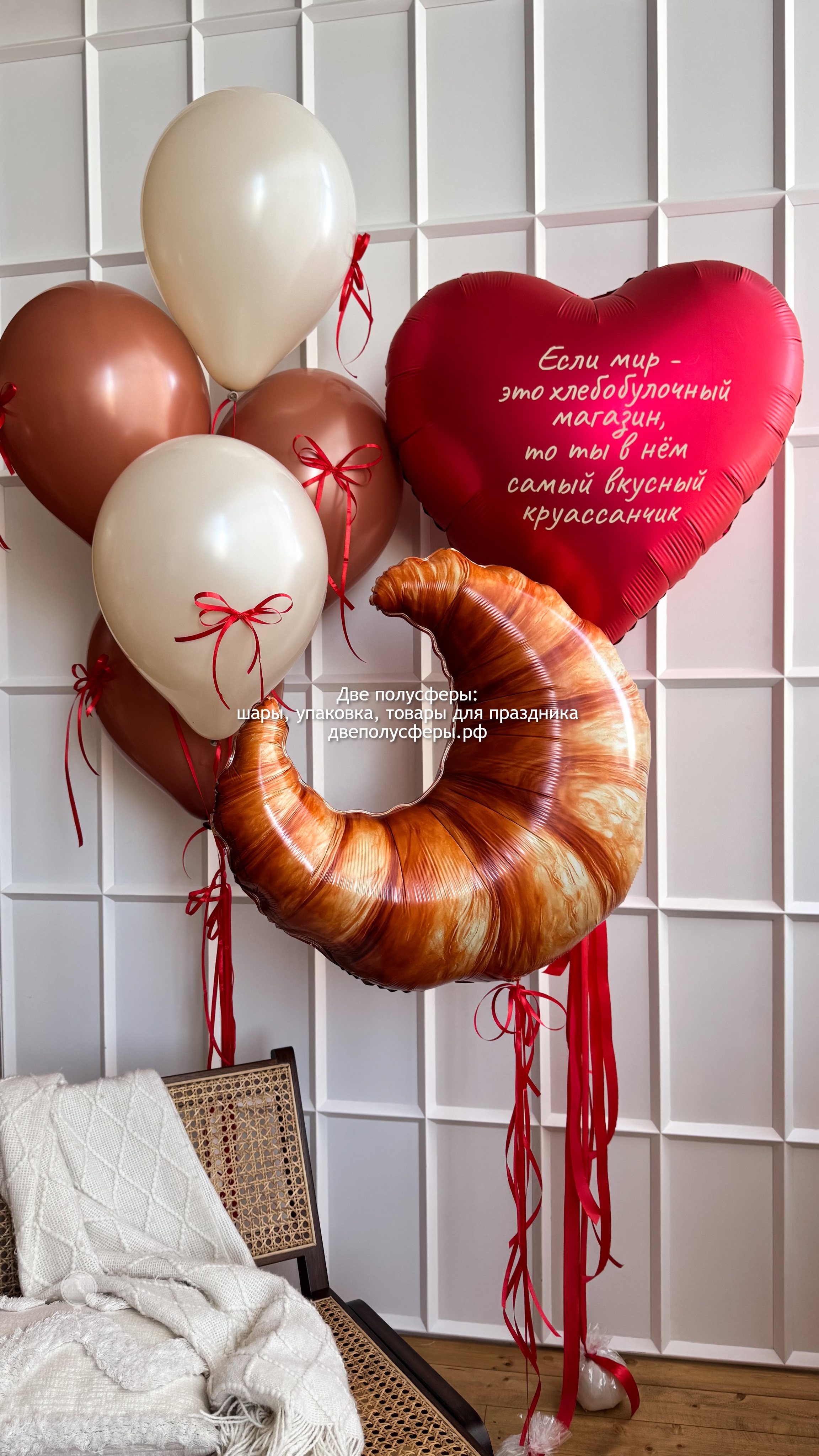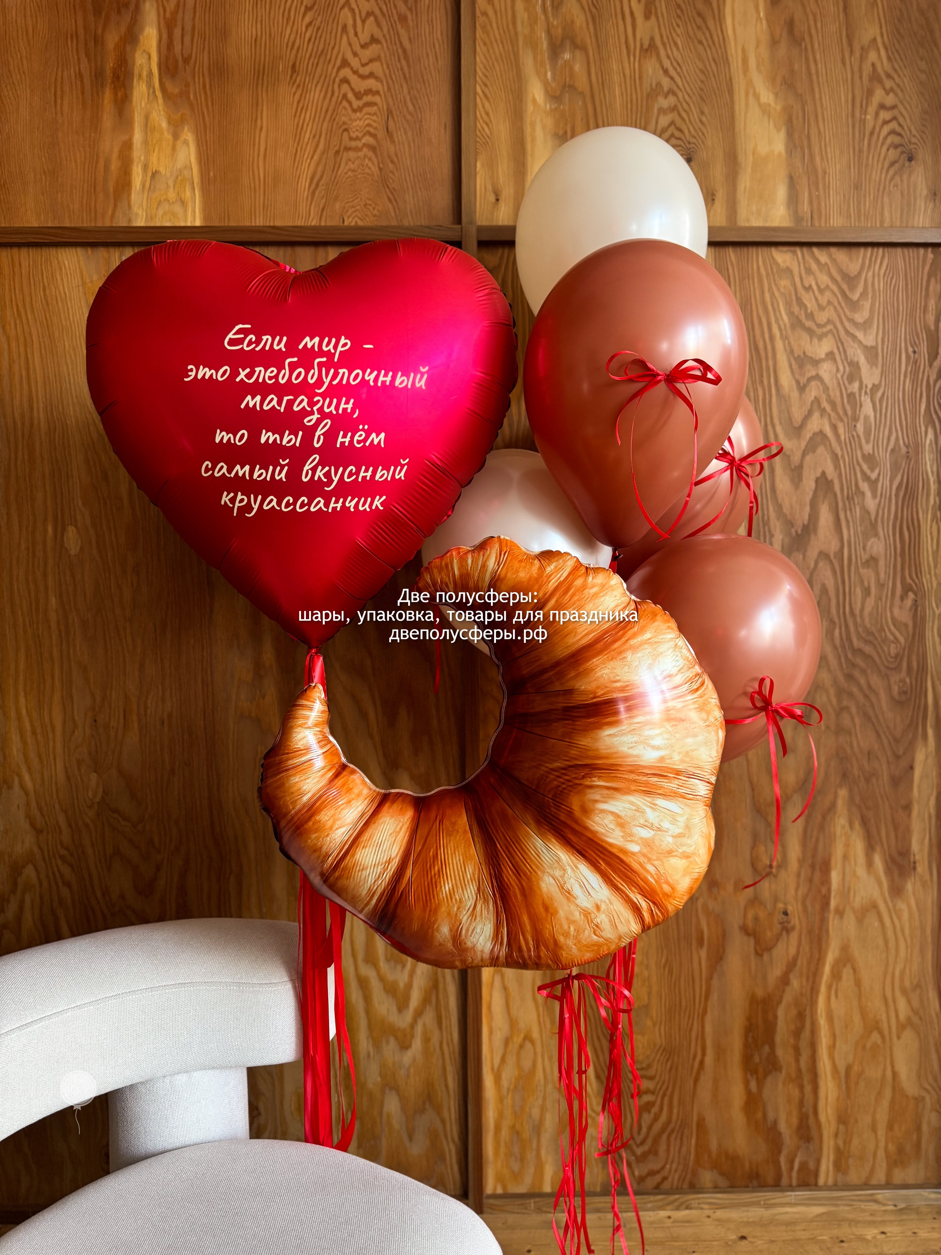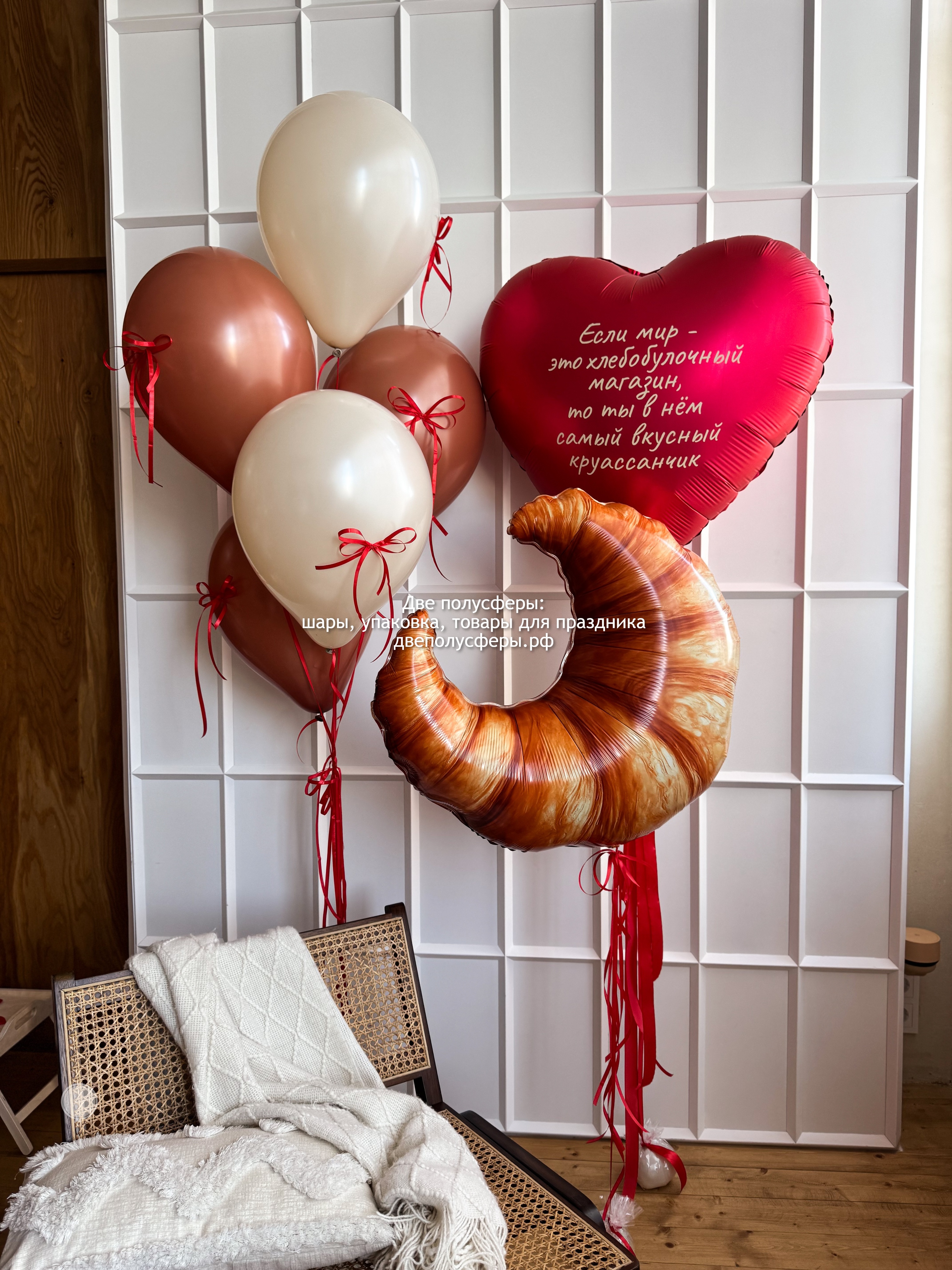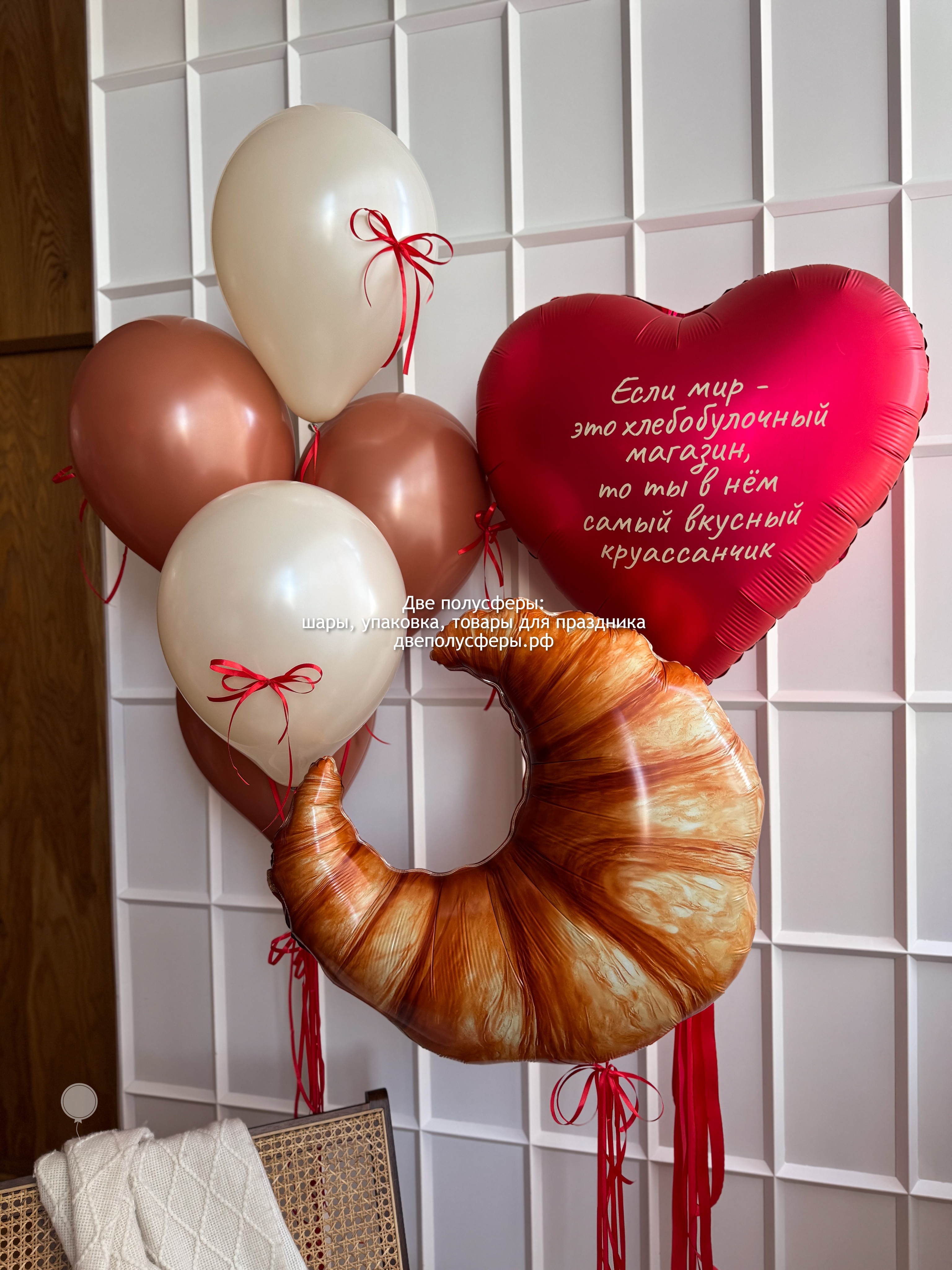 Фонтан из 5 шаров на тонкой атласной ленте с 1 двойным бантиком, фигура круассана и сердце 60 см с надписью,  грузики и пакеты входят в стоимость